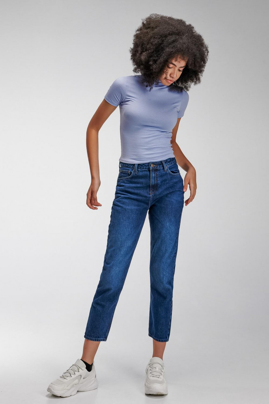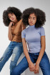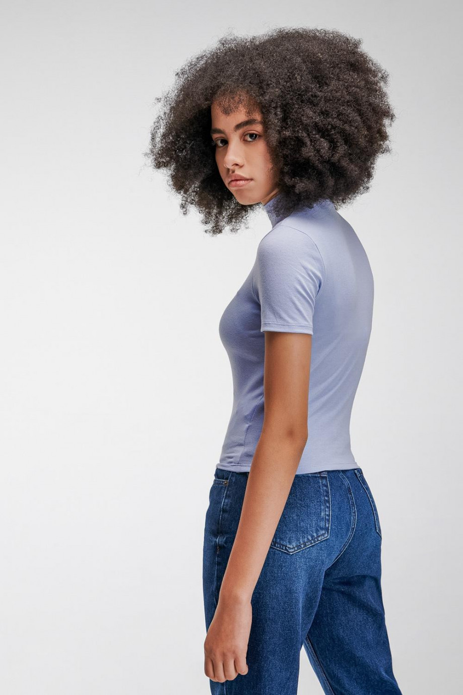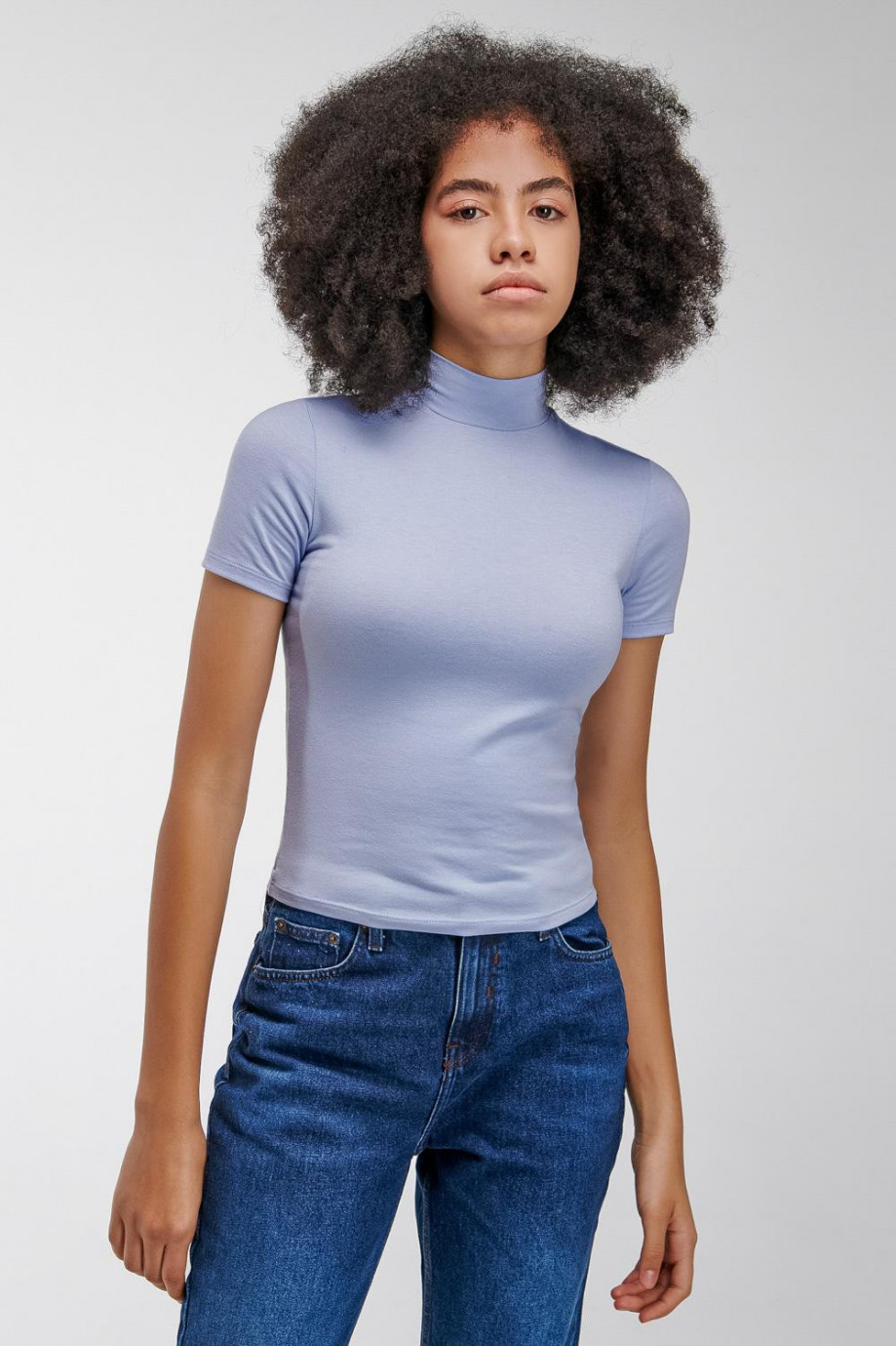 Camiseta básica femenina, con cuello alto, manga corta y largo a la cintura.