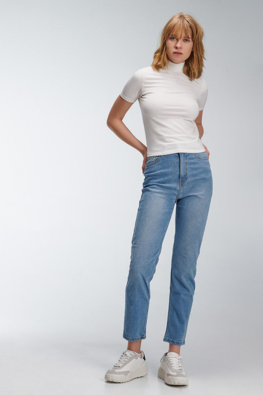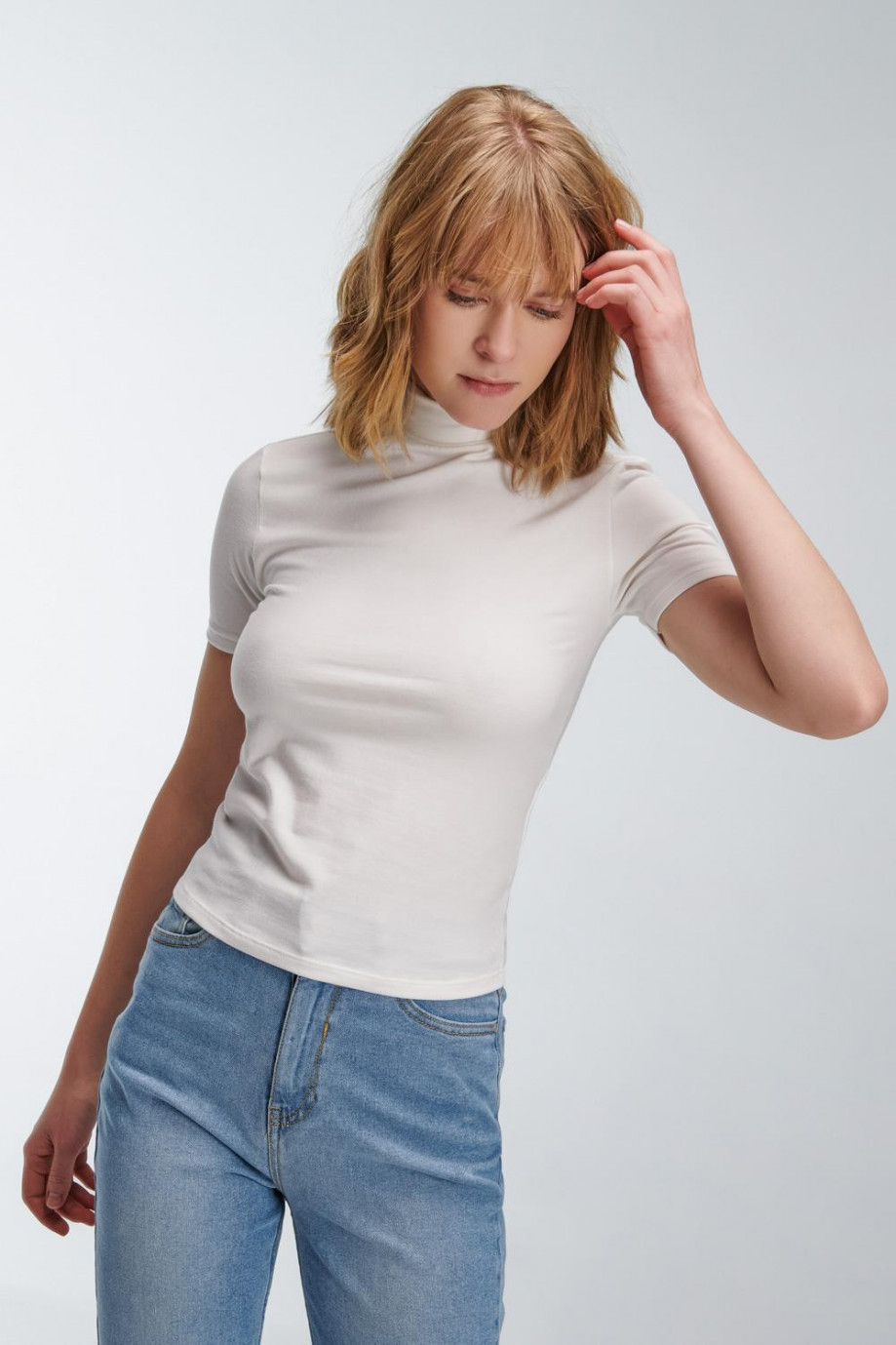 Camiseta básica femenina, con cuello alto, manga corta y largo a la cintura.