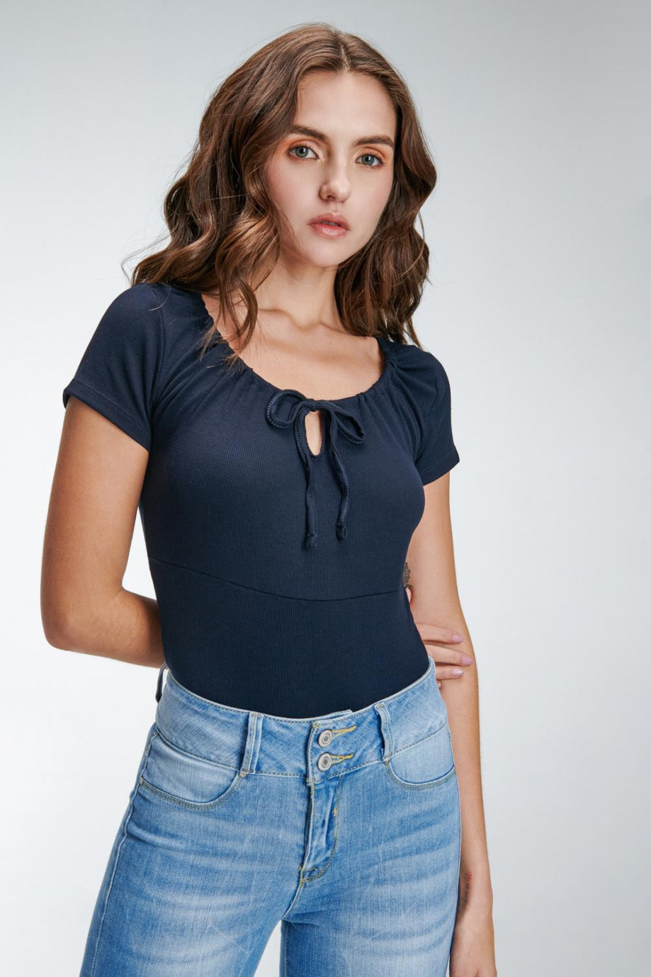 Camiseta manga corta, para mujer, con escote y anudado en frente.