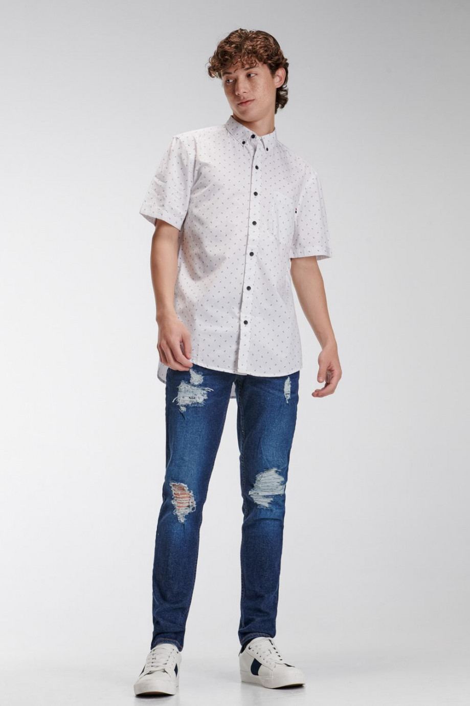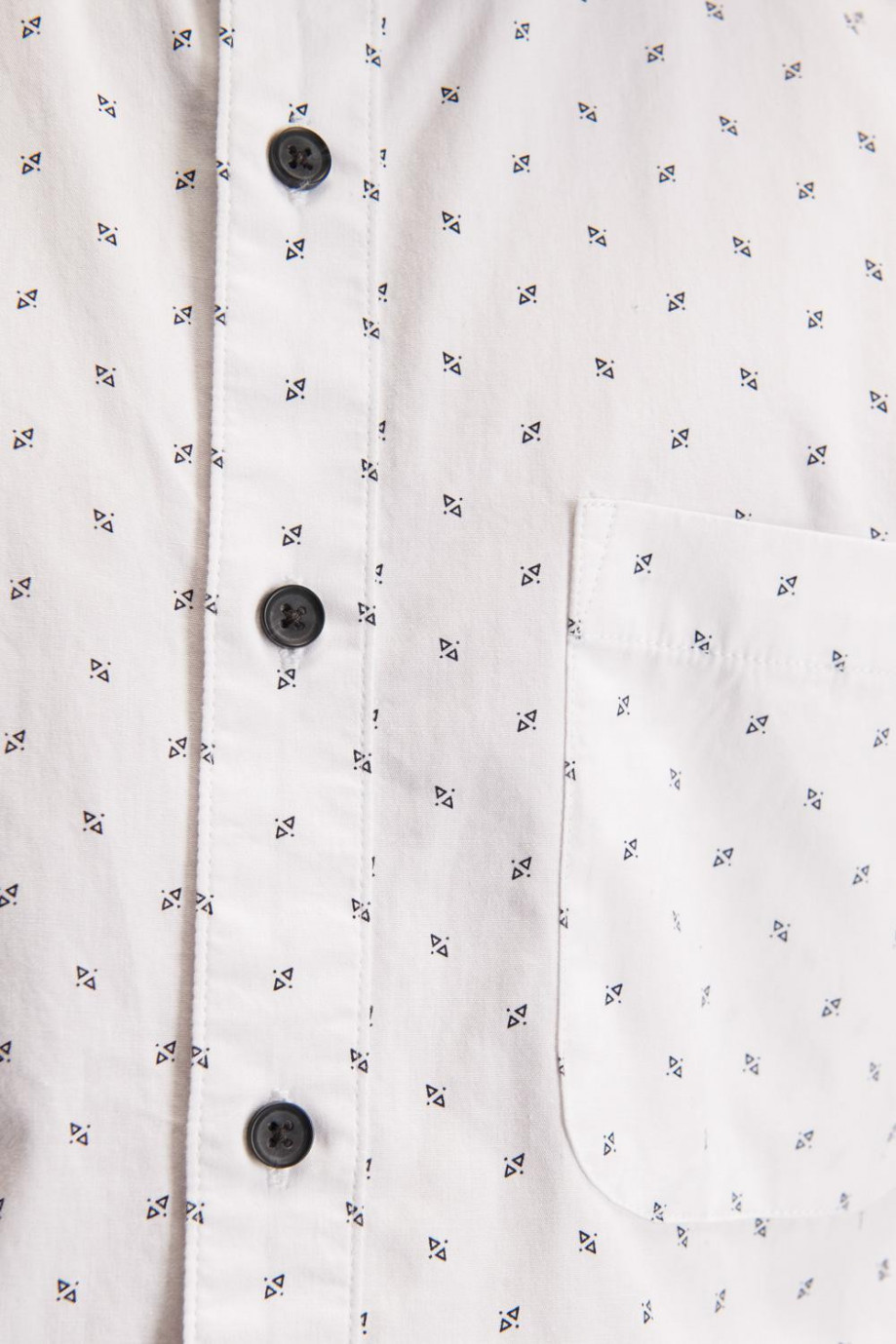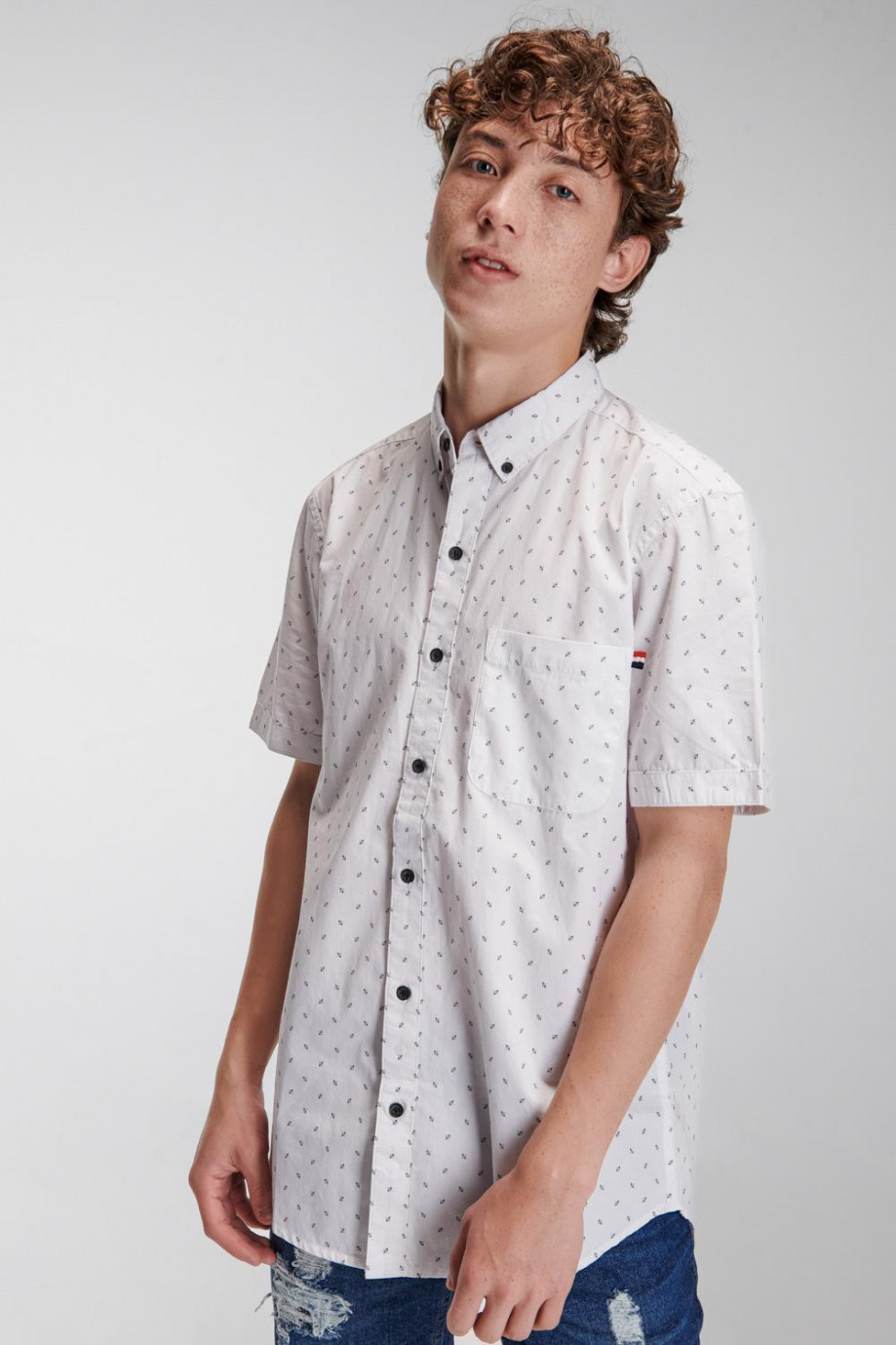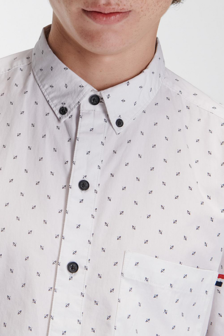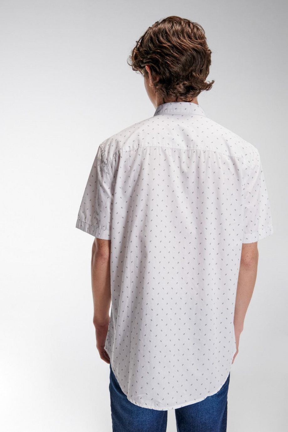 Camisa cuello button down manga corta, con estampación de mini print y botonadura en el frente.