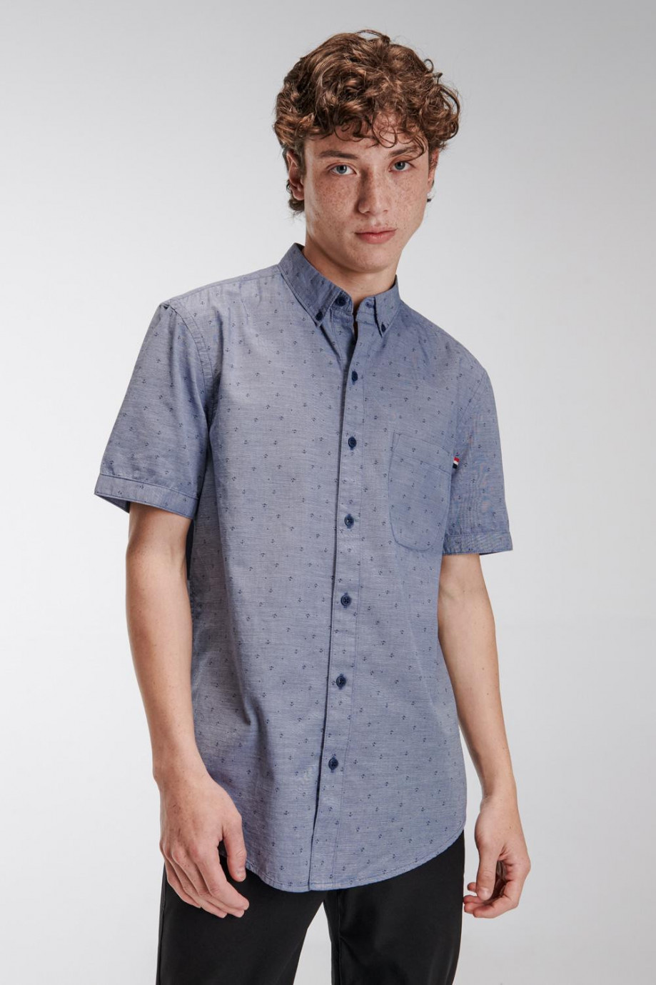 Camisa cuello button down manga corta, con estampación de mini print y botonadura en el frente.