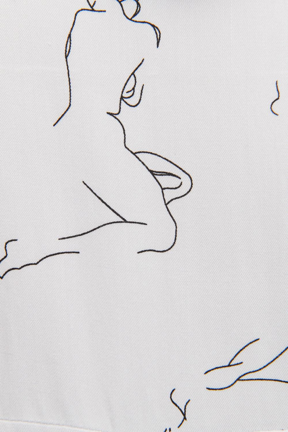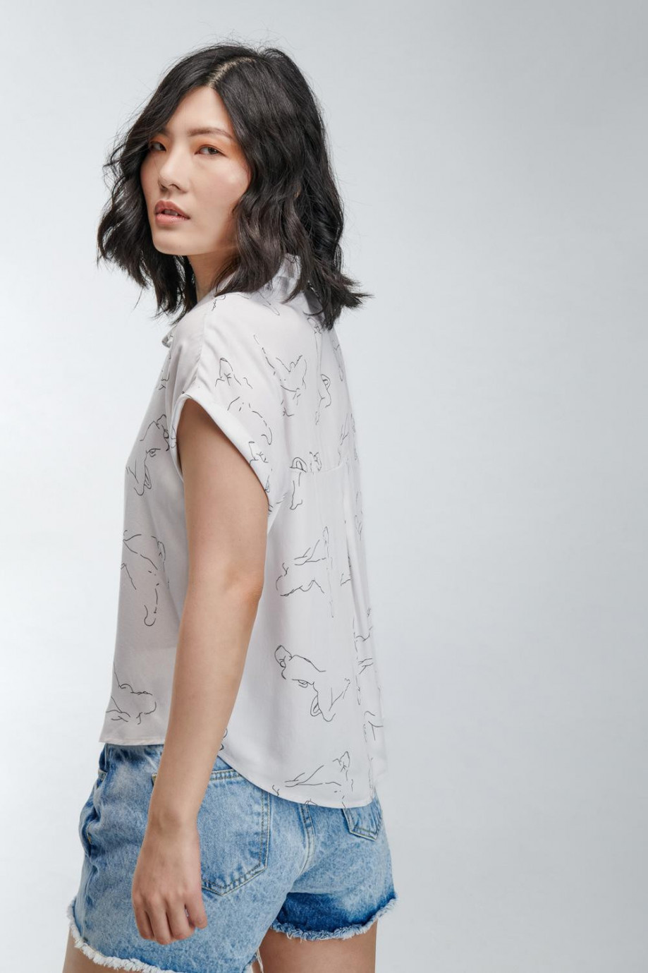 Blusa en tela fluida, manga corta cuello camisero y prense en espalda.