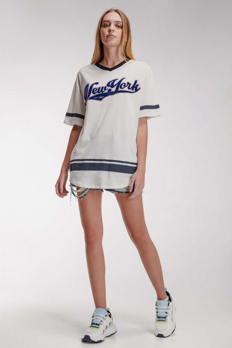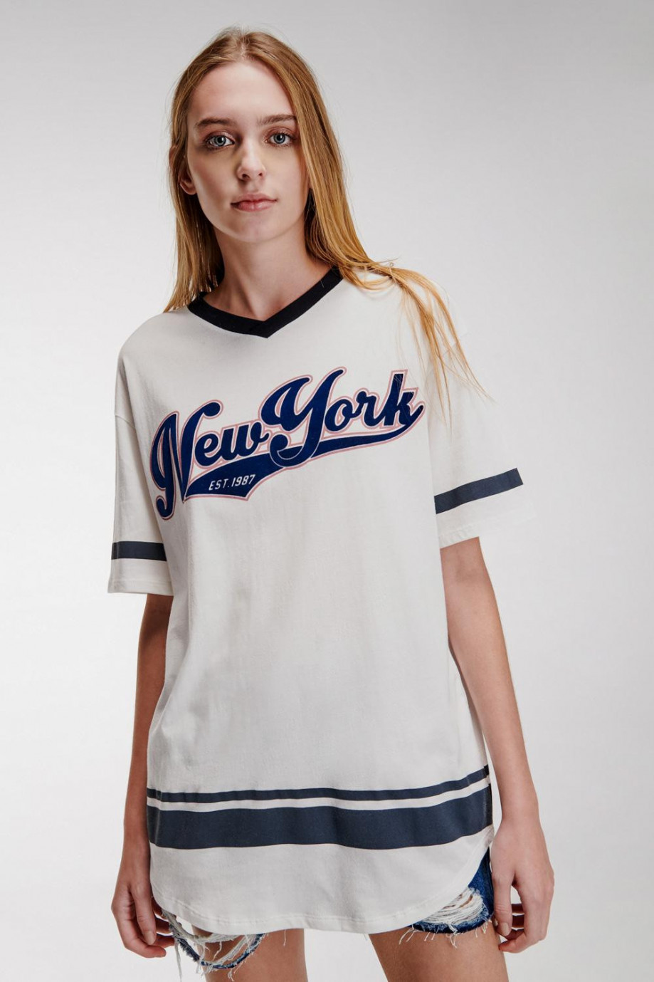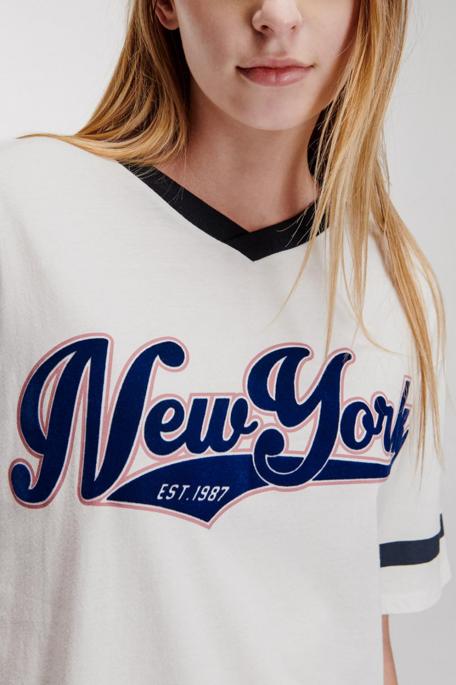 Camiseta, para mujer manga corta con cuello en V, estampado en frente y mangas.