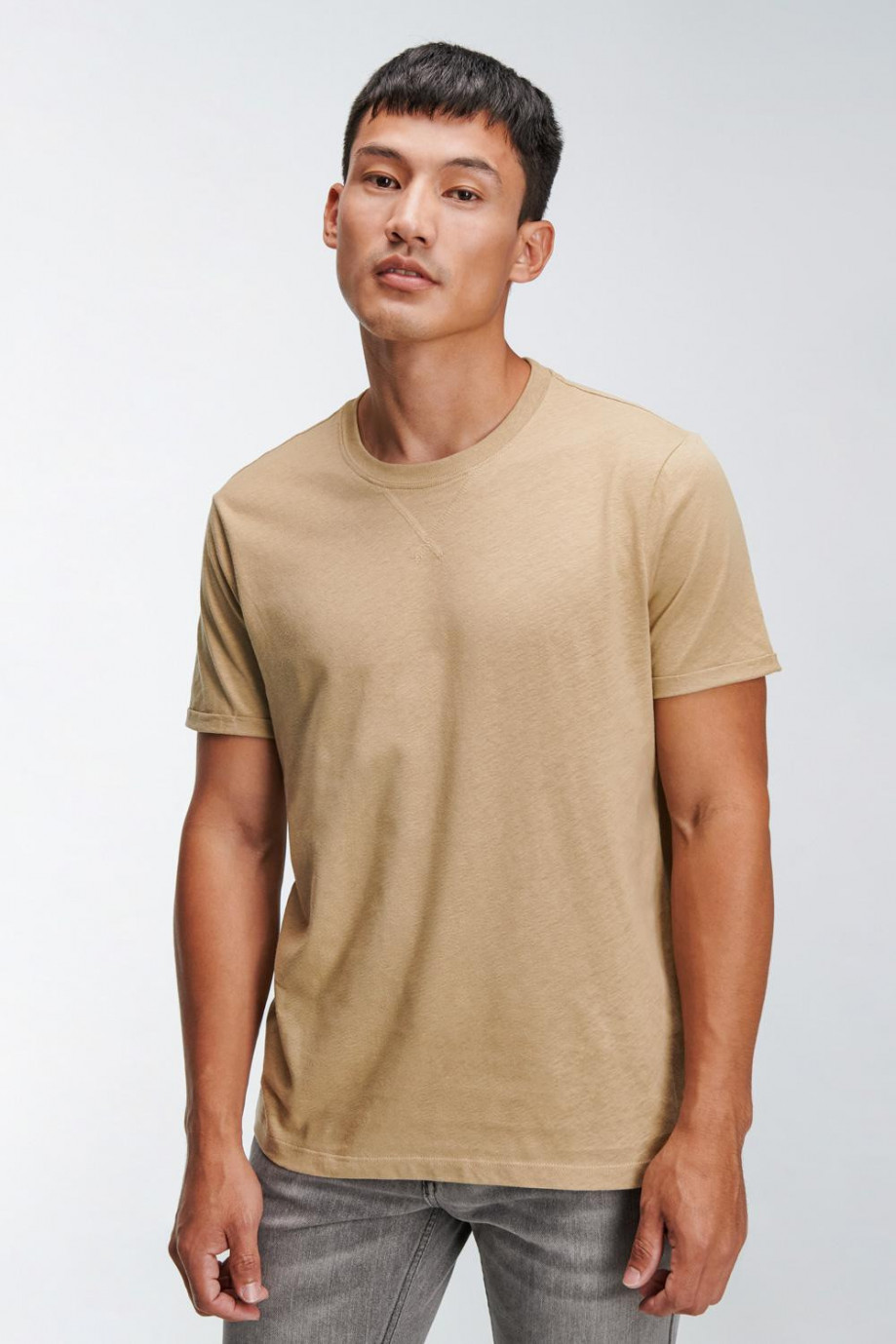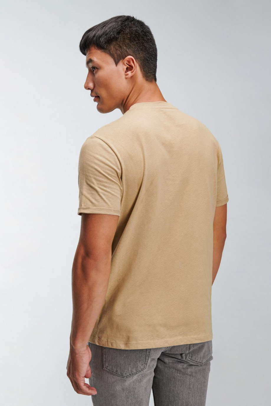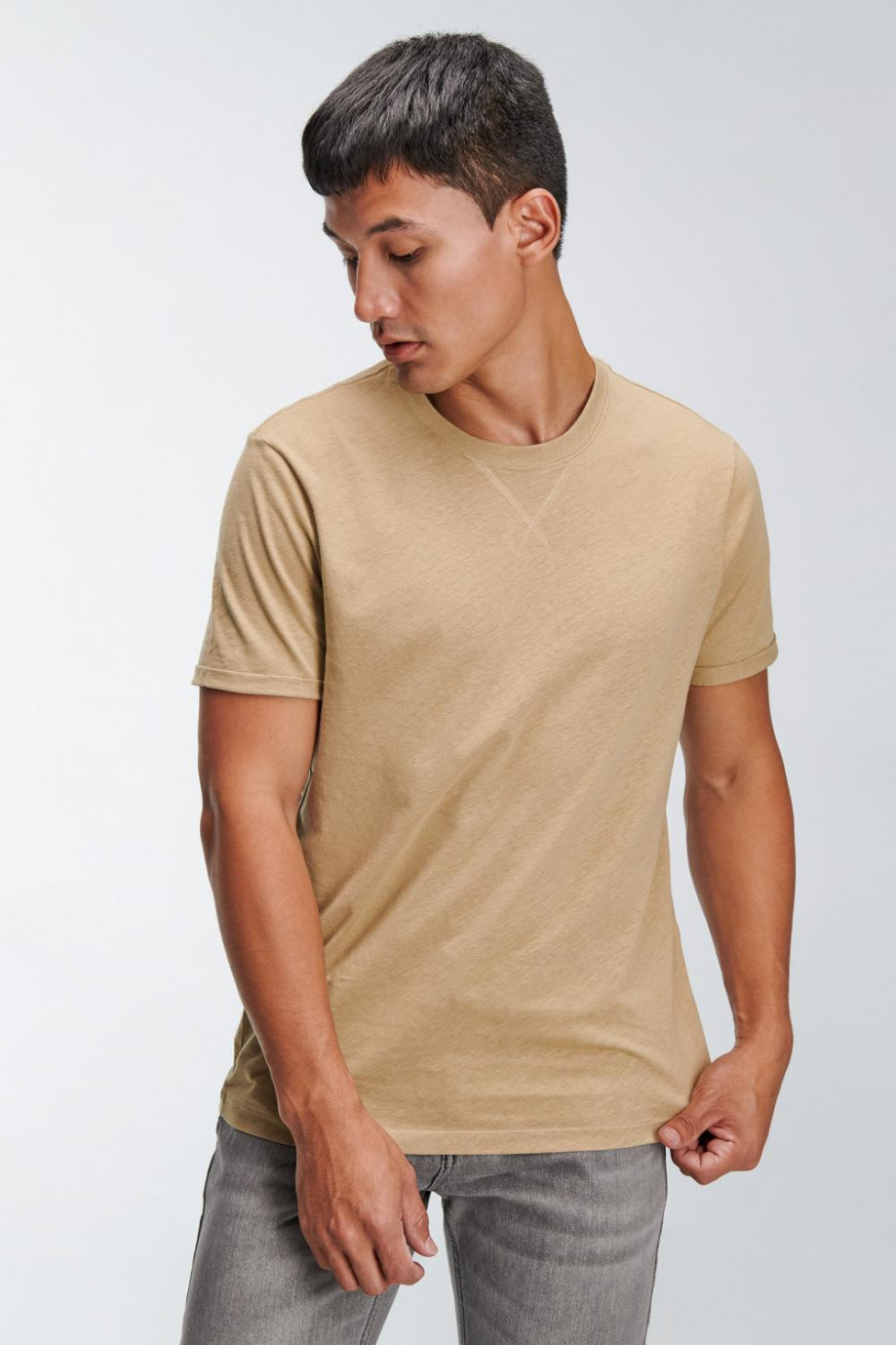 Camiseta manga corta, unicolor para hombre con costura decorativa en cuello frente.