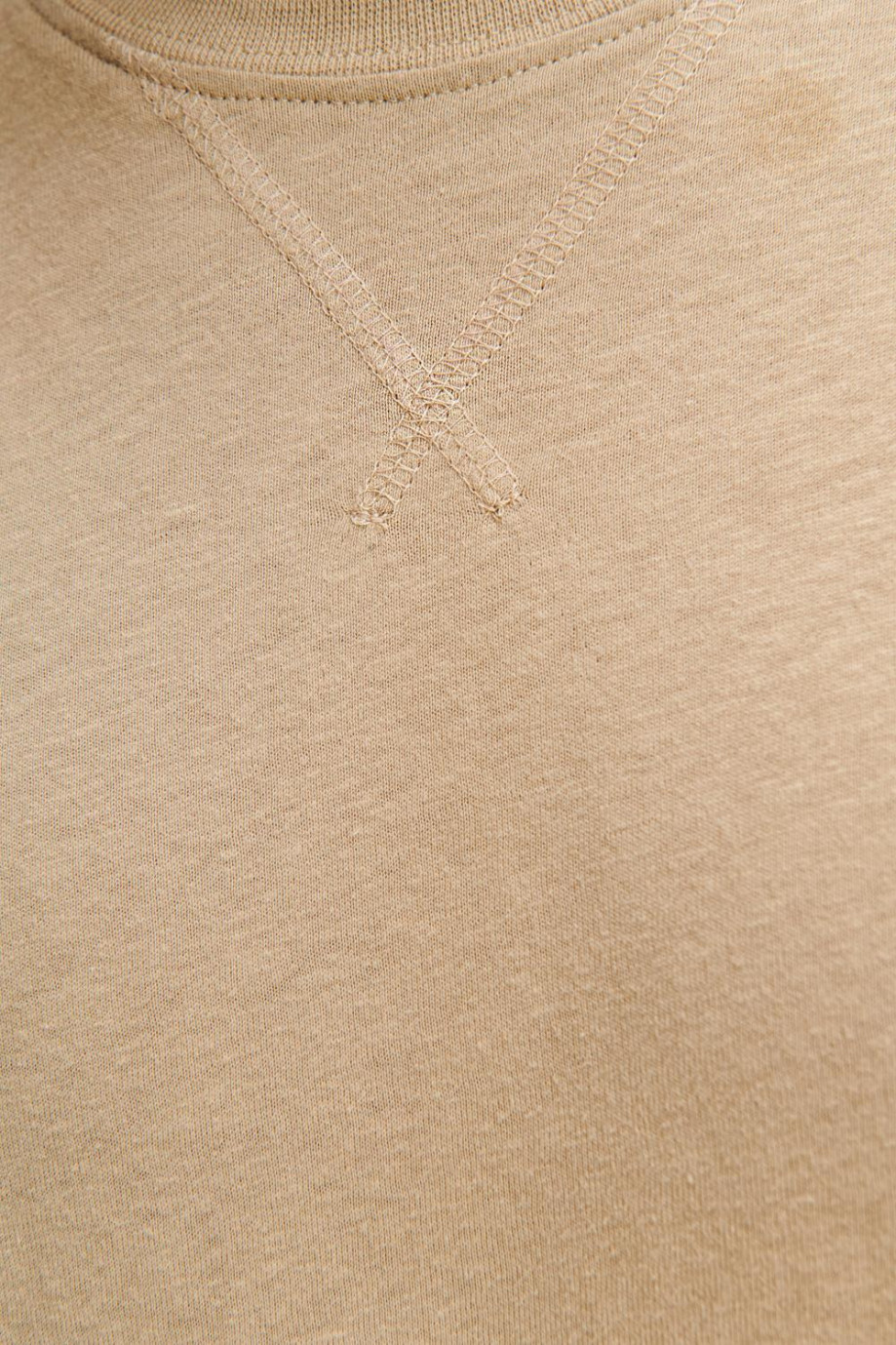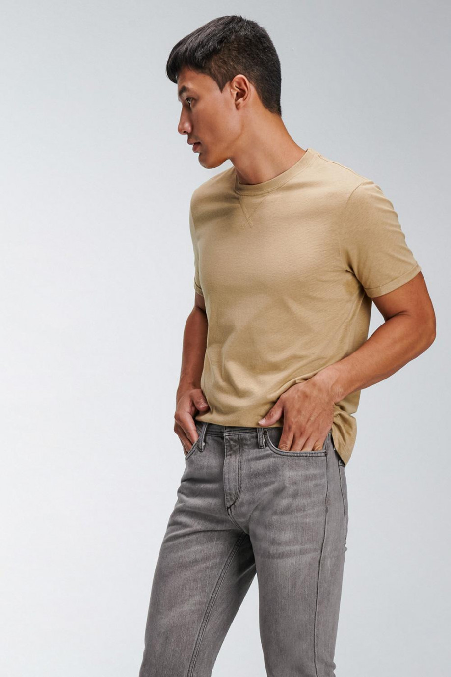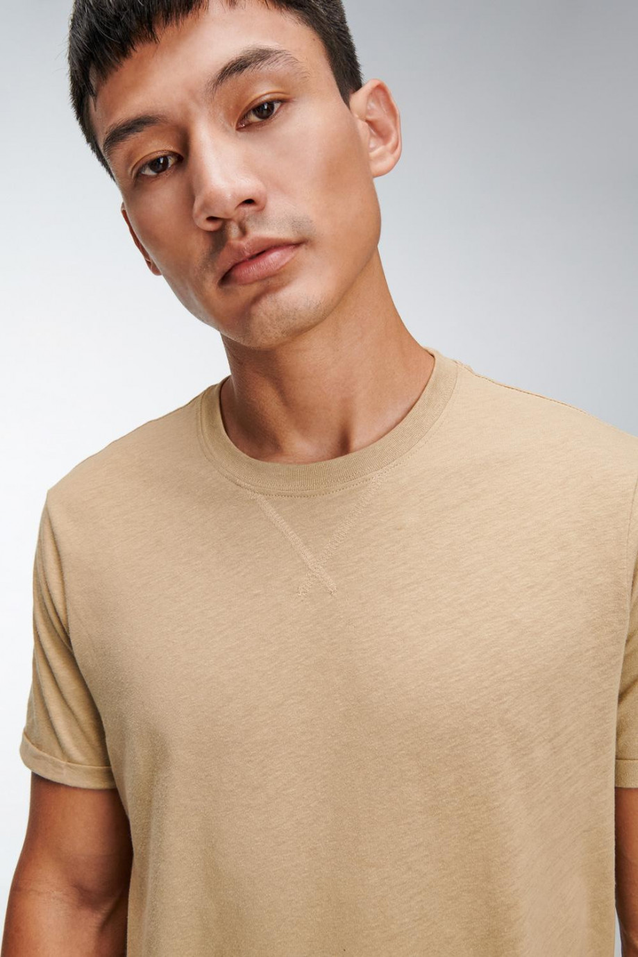 Camiseta manga corta, unicolor para hombre con costura decorativa en cuello frente.