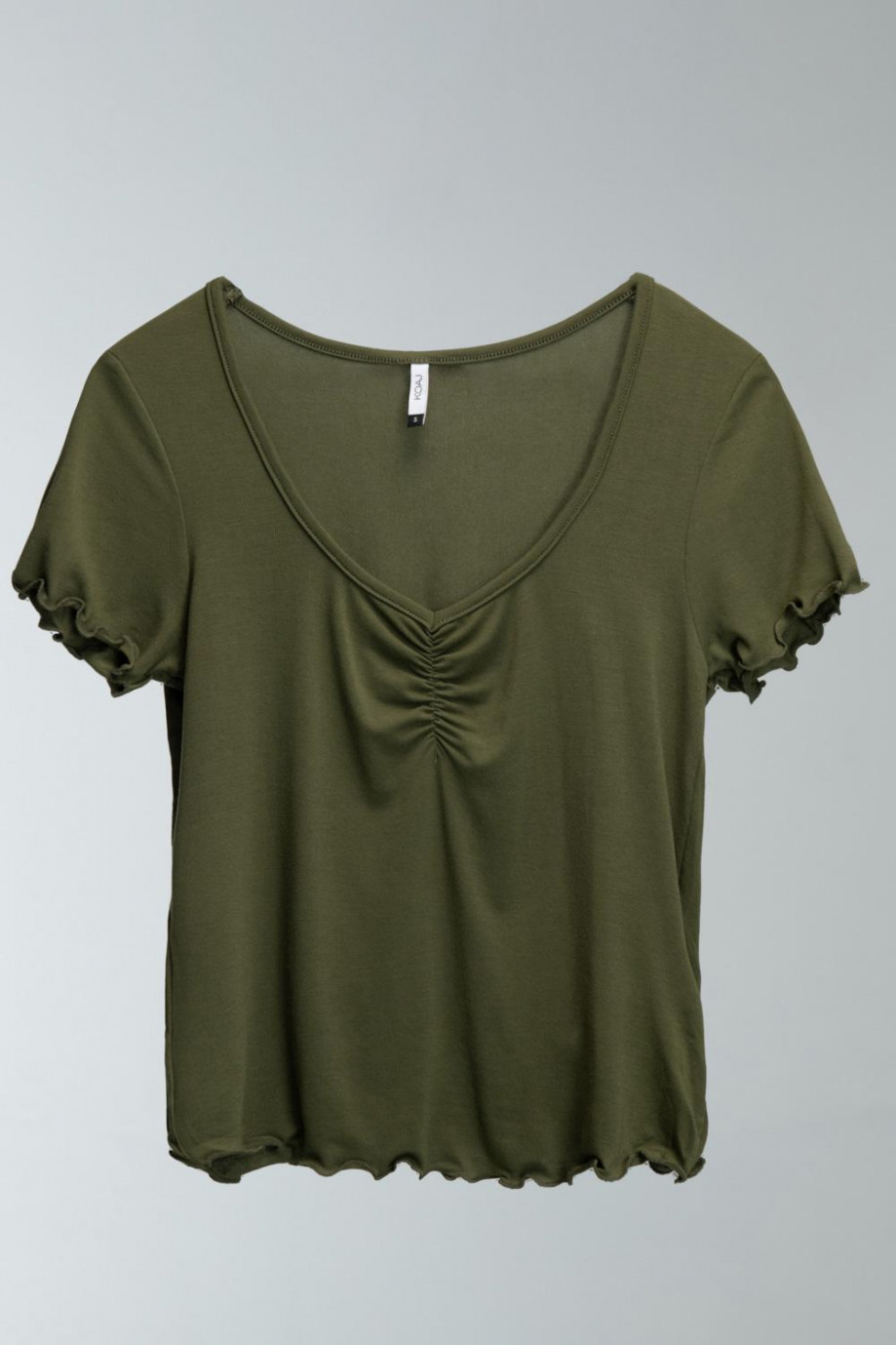 Camiseta para mujer, cuello en v con recogido, manga corta.