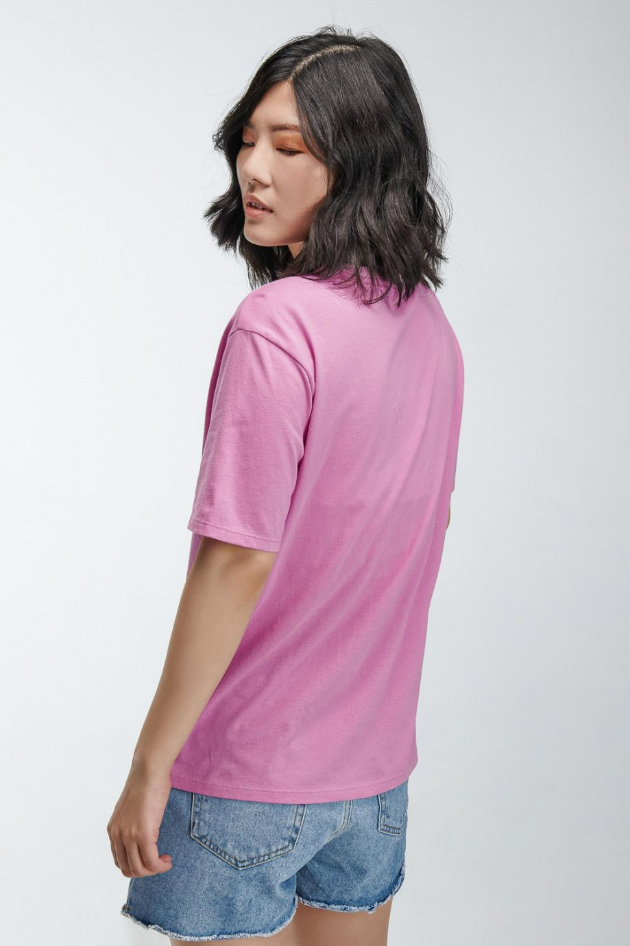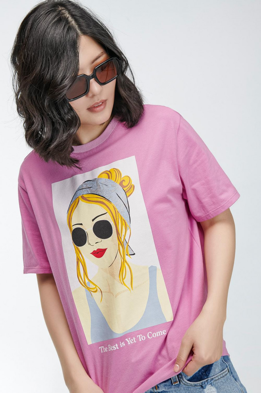Camiseta básica para mujer manga corta en colores vivos, estampada en frente con joven, gafas de sol, pañoleta con detalles de brillo.