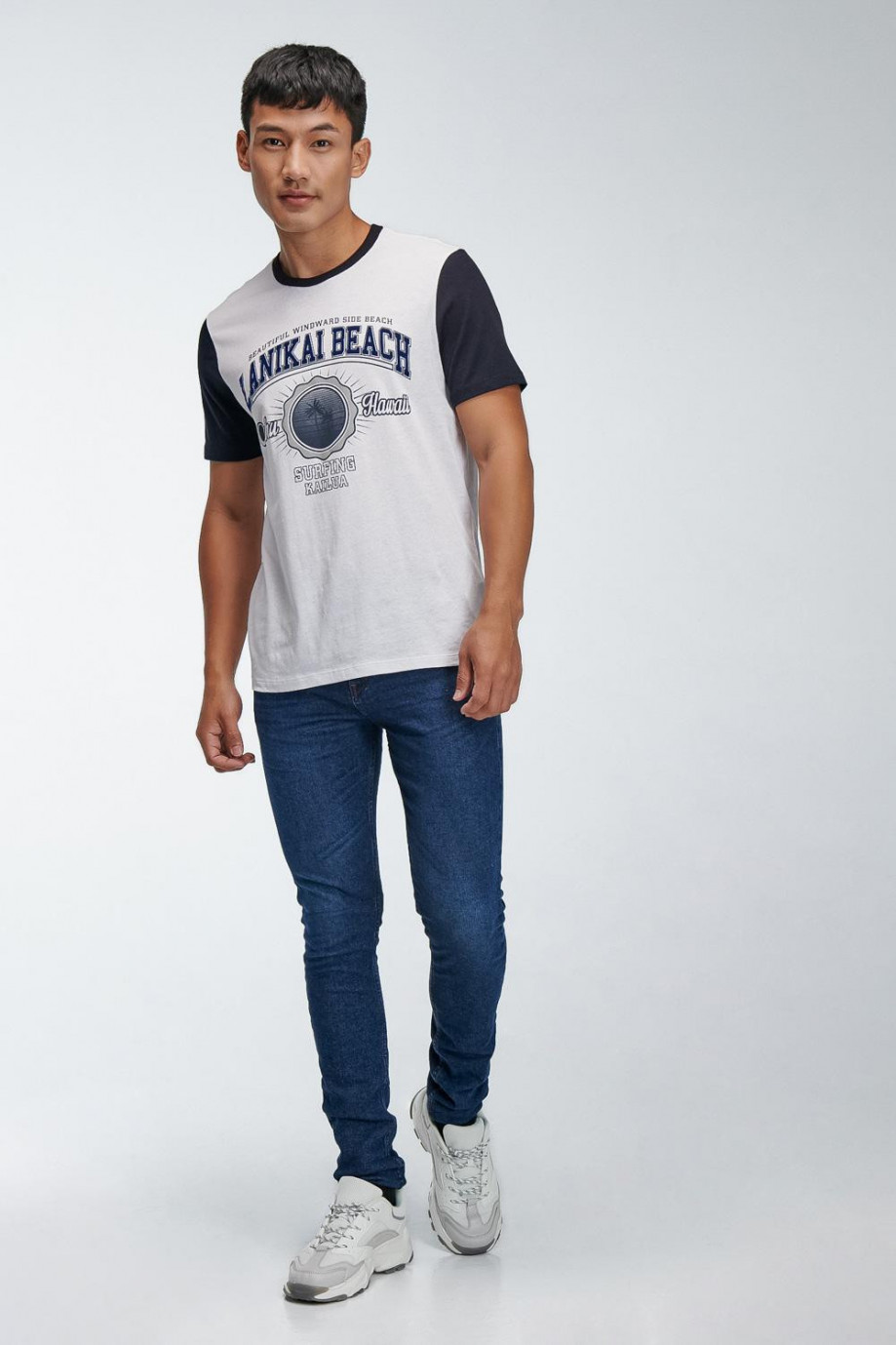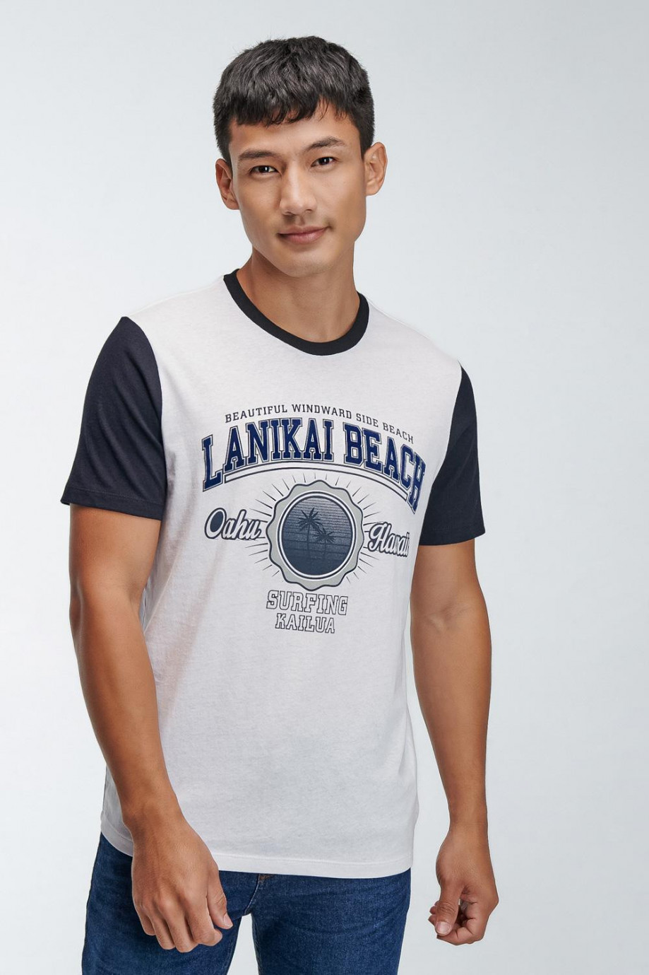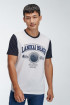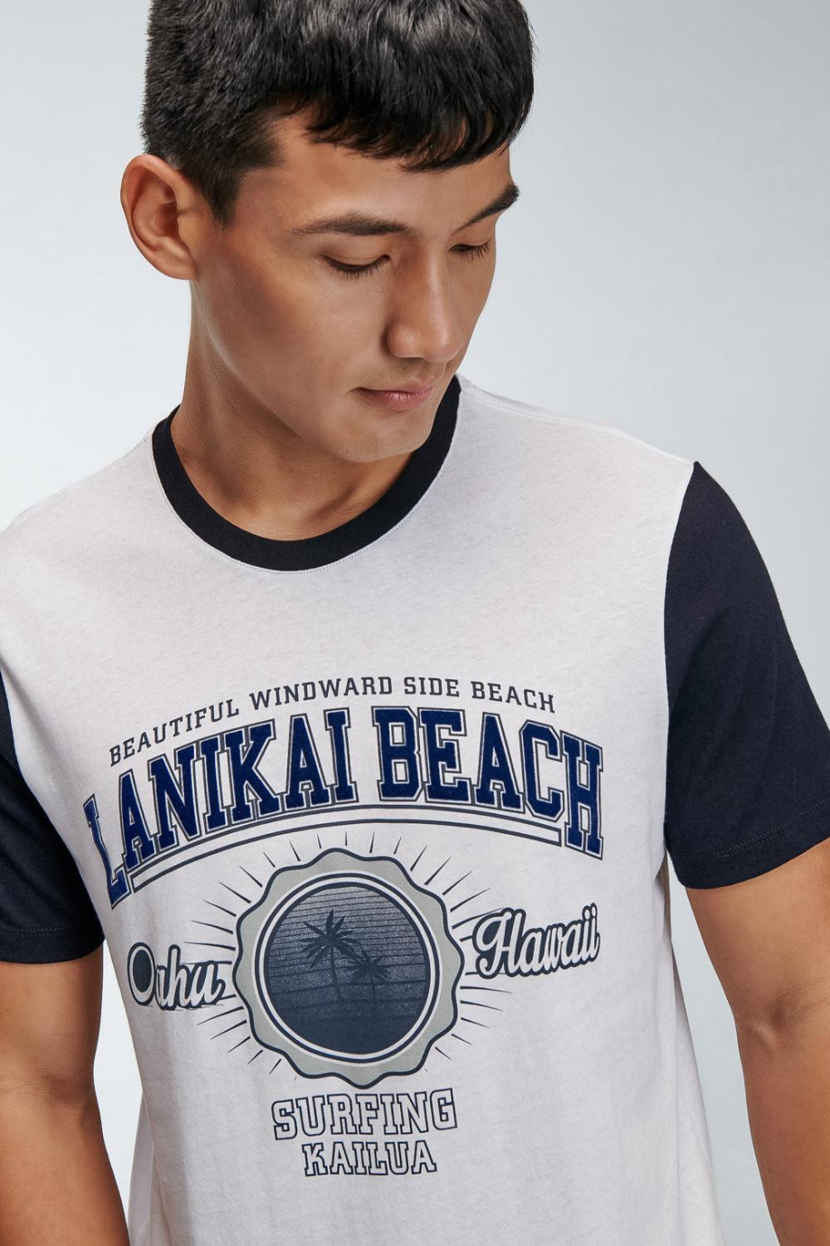Camiseta básica para hombre manga corta, cuello y mangas en contraste, estampado en frente, surf.