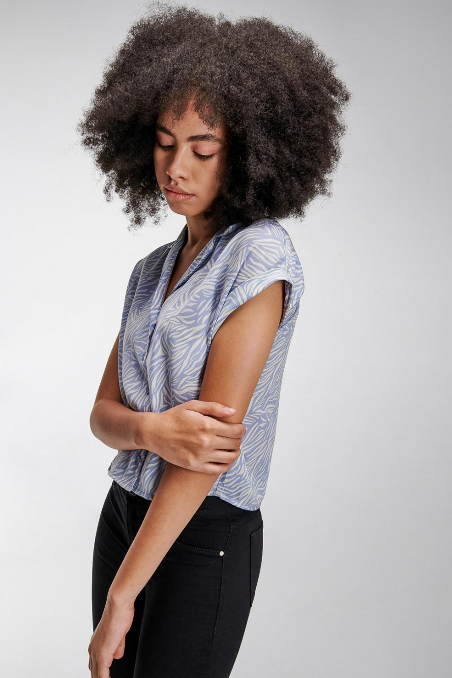 Blusa en tela fluida estampada, manga corta cuello resort silueta oversize.