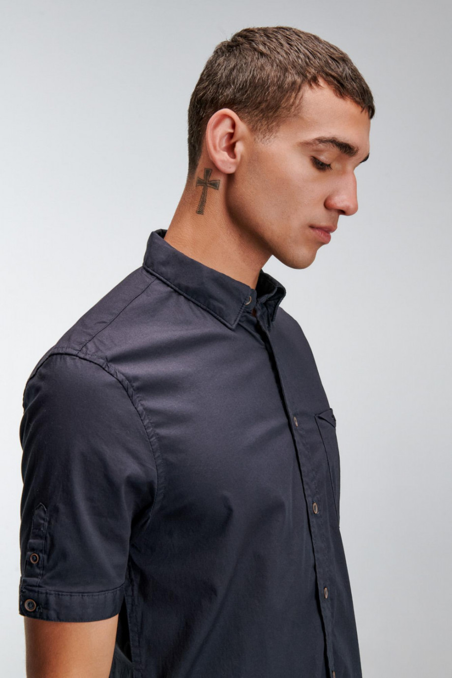 Camisa para hombre unicolor, con botones en cuello no visibles, silueta ajustada con pinzas de entalle.