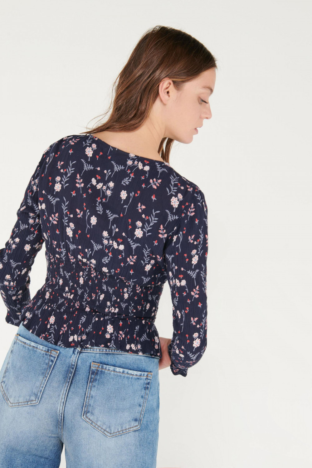 Blusa en tela fluida, estampado floral, manga larga, recogido en cintura,tirantas para anudar en frente