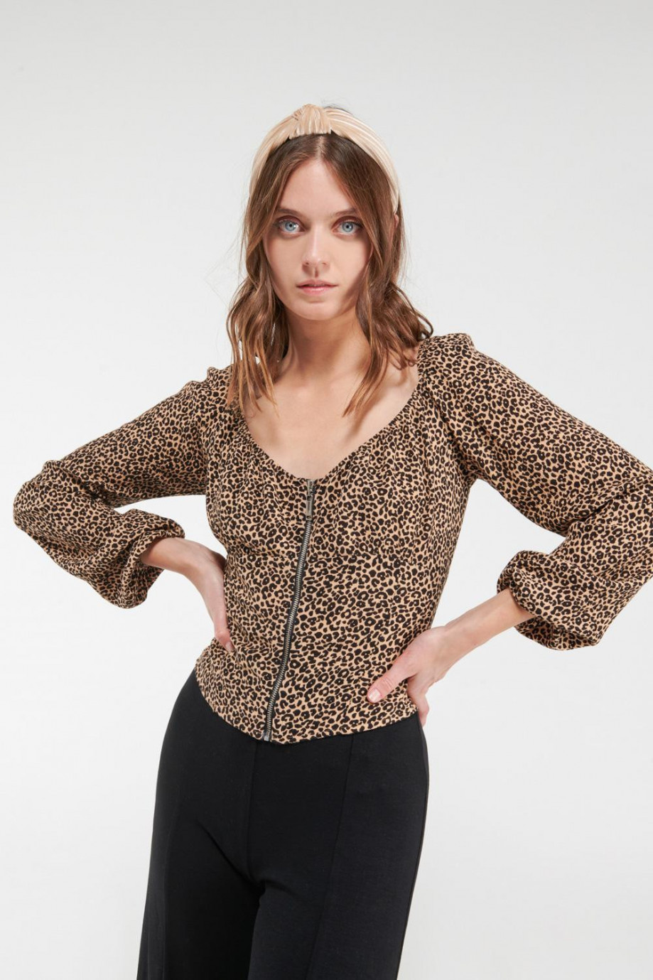 Blusa estampada, manga larga, con cremallera en frente, puño con abotonadura.