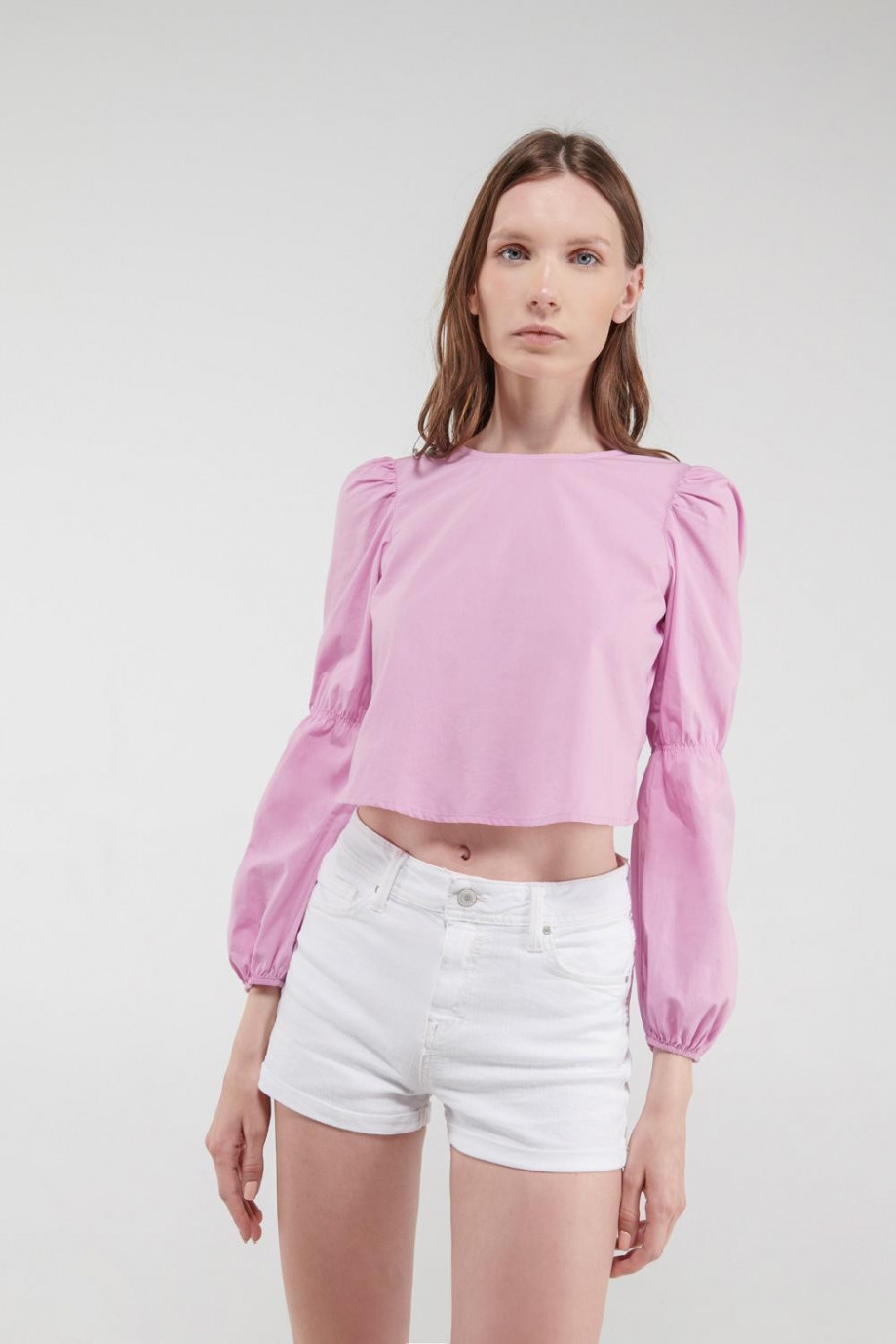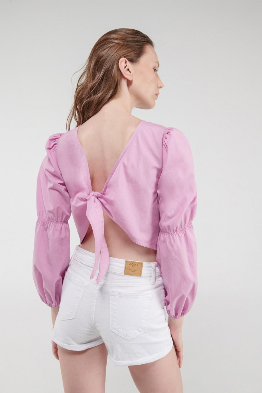 Blusa unicolor, con elástico en manga y puño, anudado en espalda.