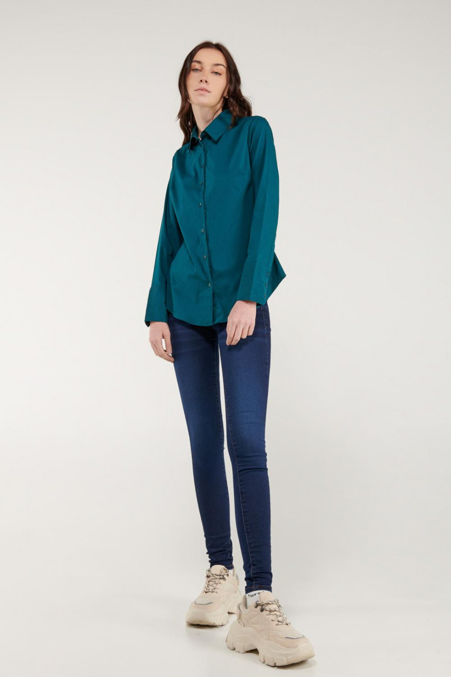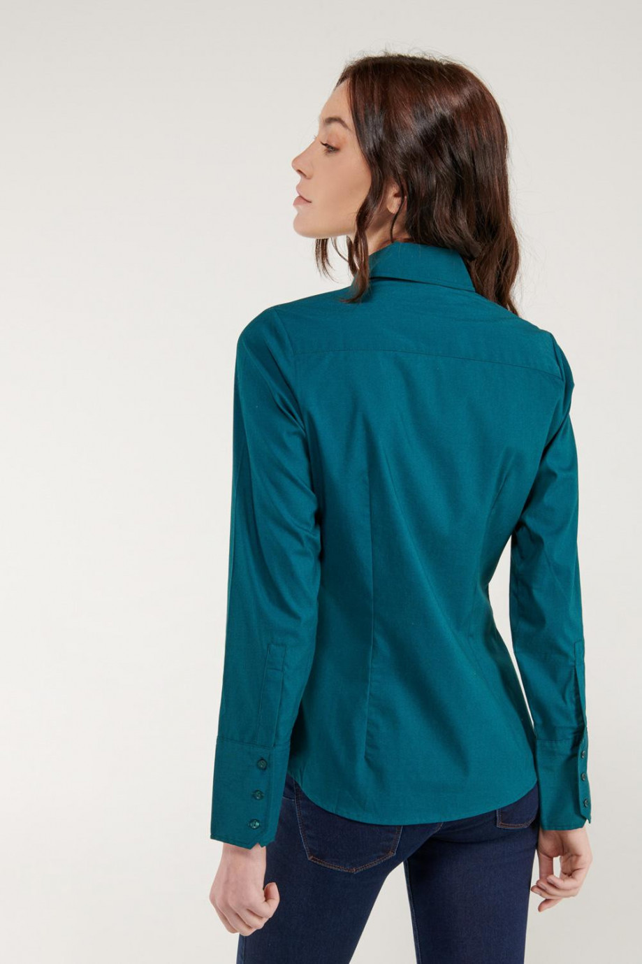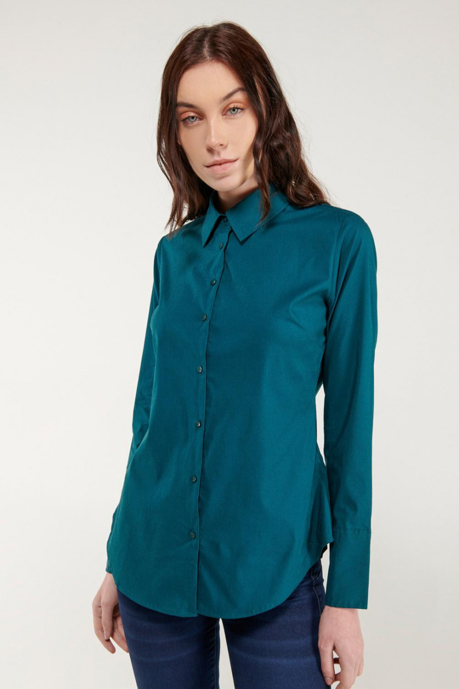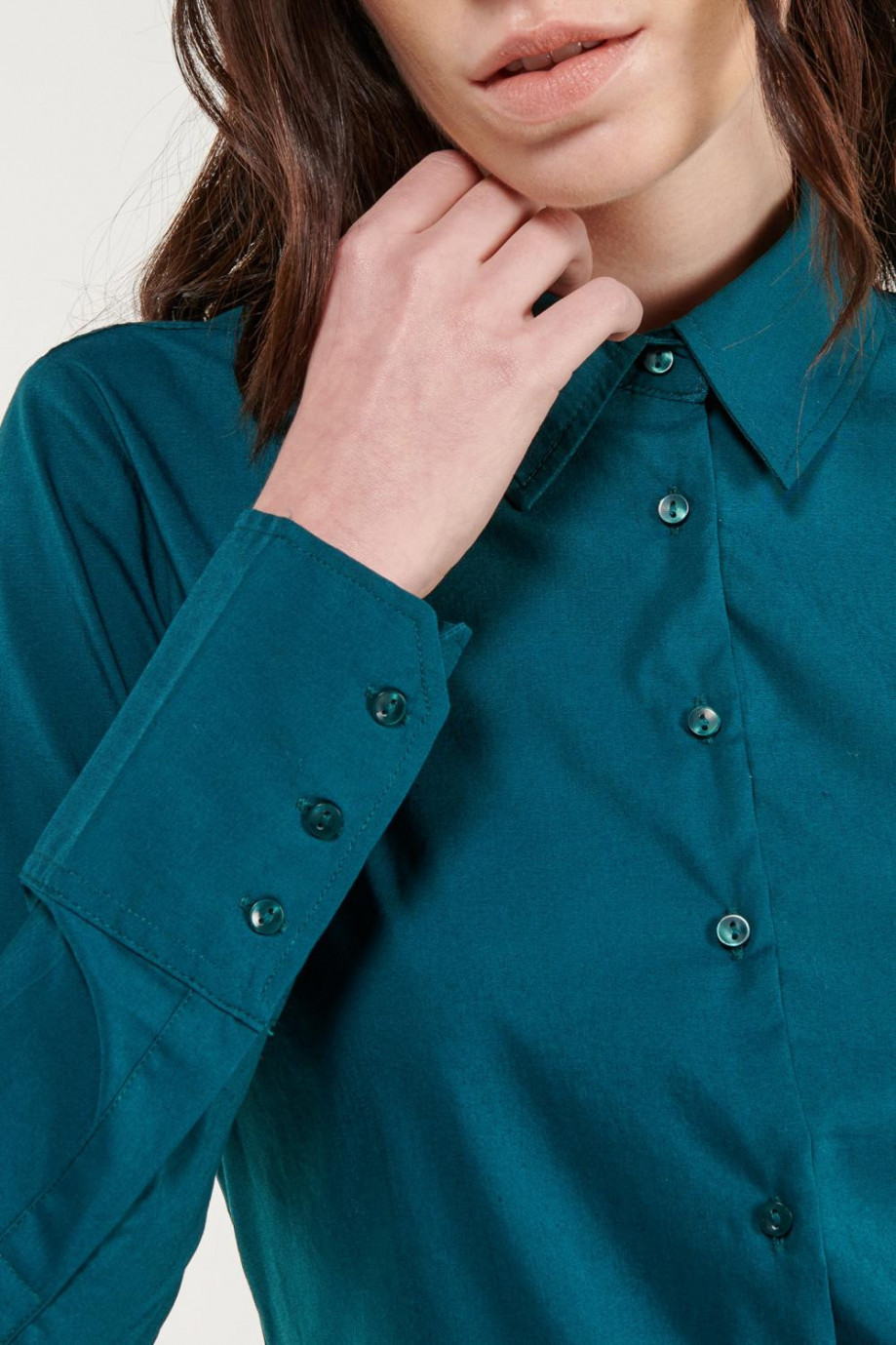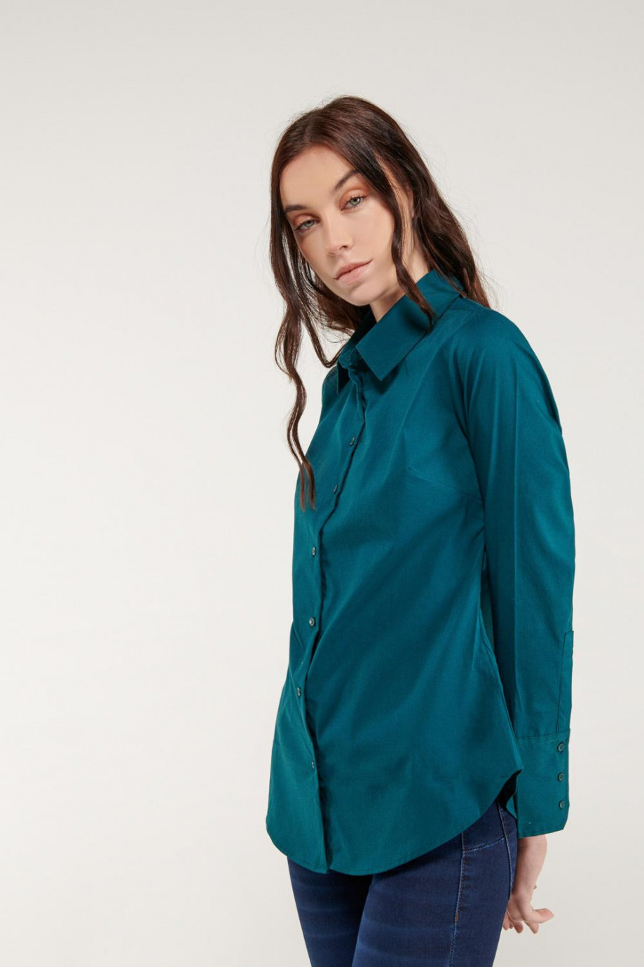 Blusa para mujer, en tela de cuerpo unicolor, cuello sport, manga larga y cierre frontal con botones.