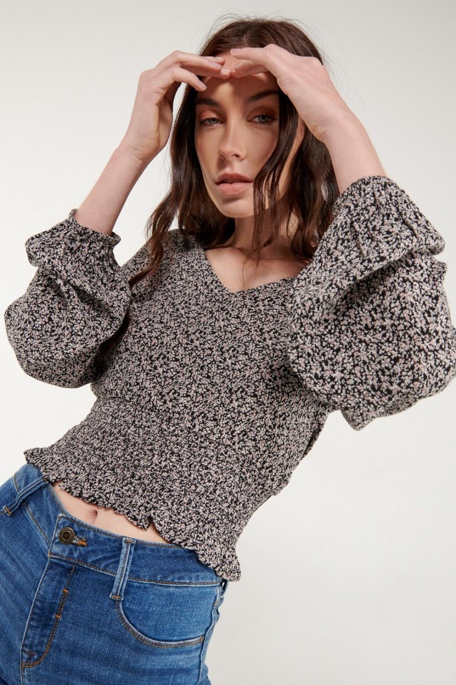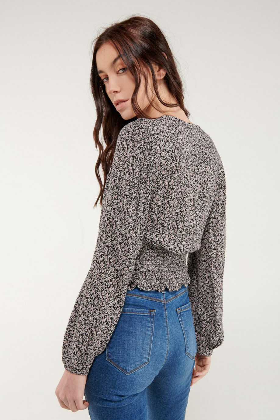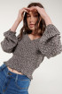Blusa para mujer en tela fluida, estampada, mangas amplias, encauchado en cintura