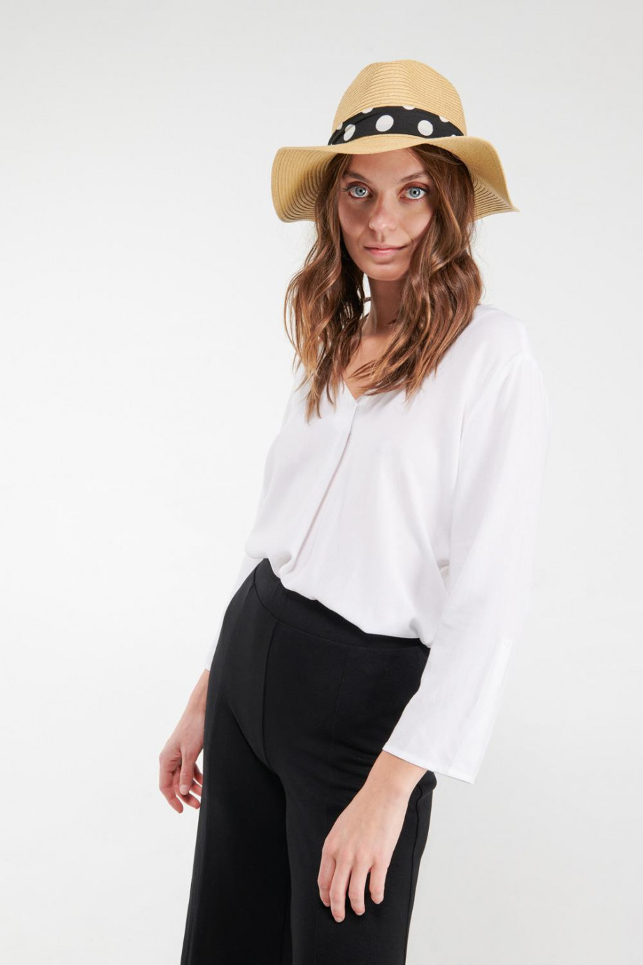 Blusa cuello en V, manga larga con charretera, prense decorativo en el frente, en tela fluida unicolor.