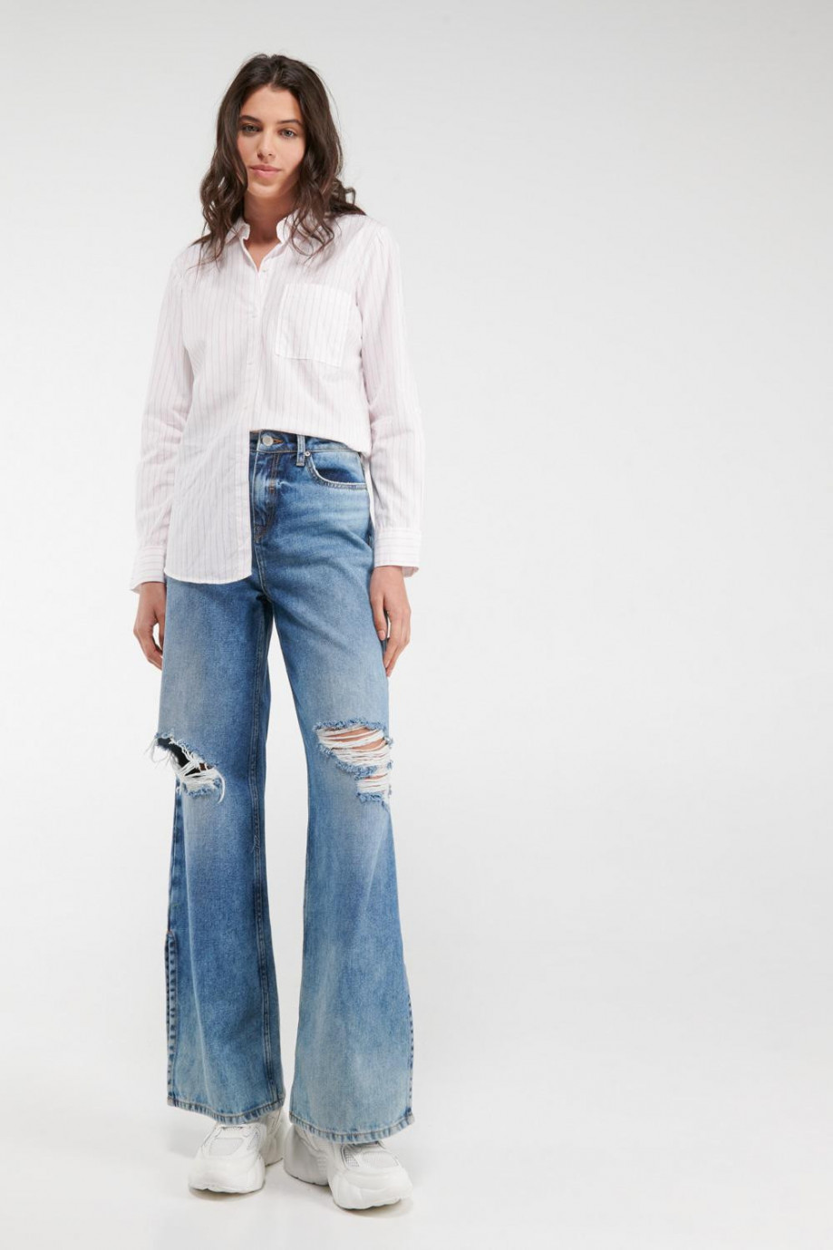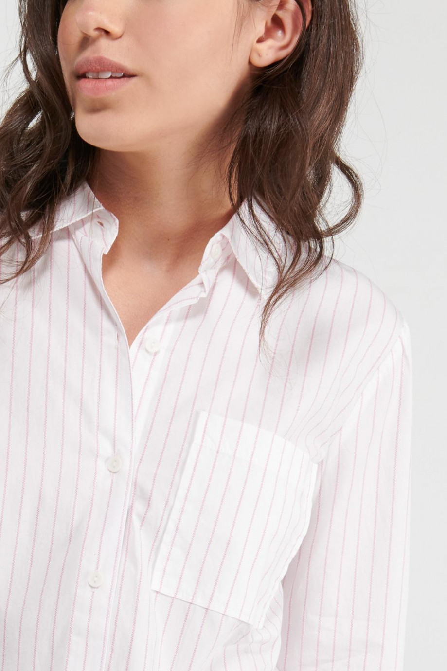 Blusa con cuello camisero manga larga a rayas con bolsillo.