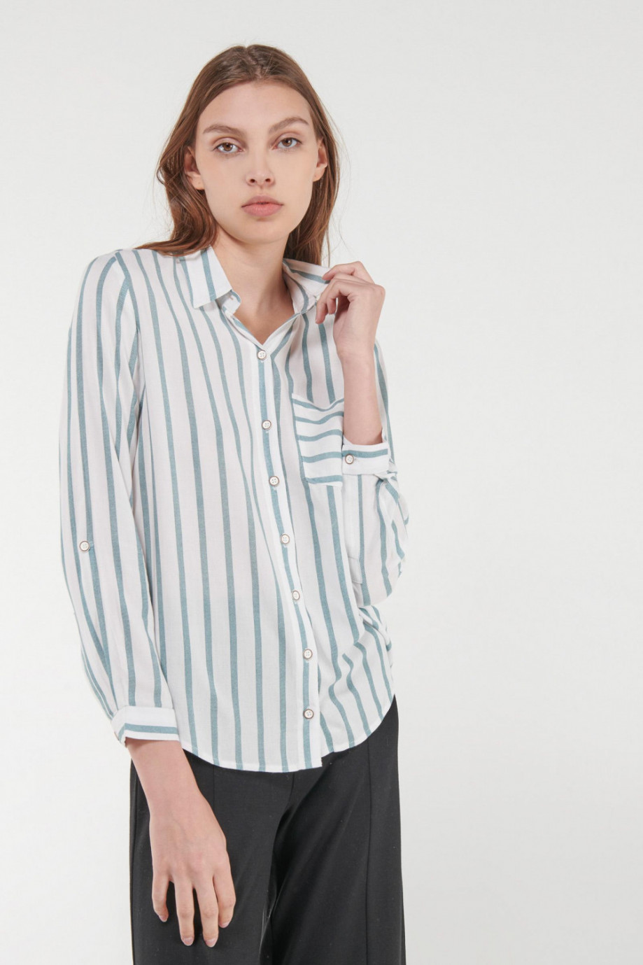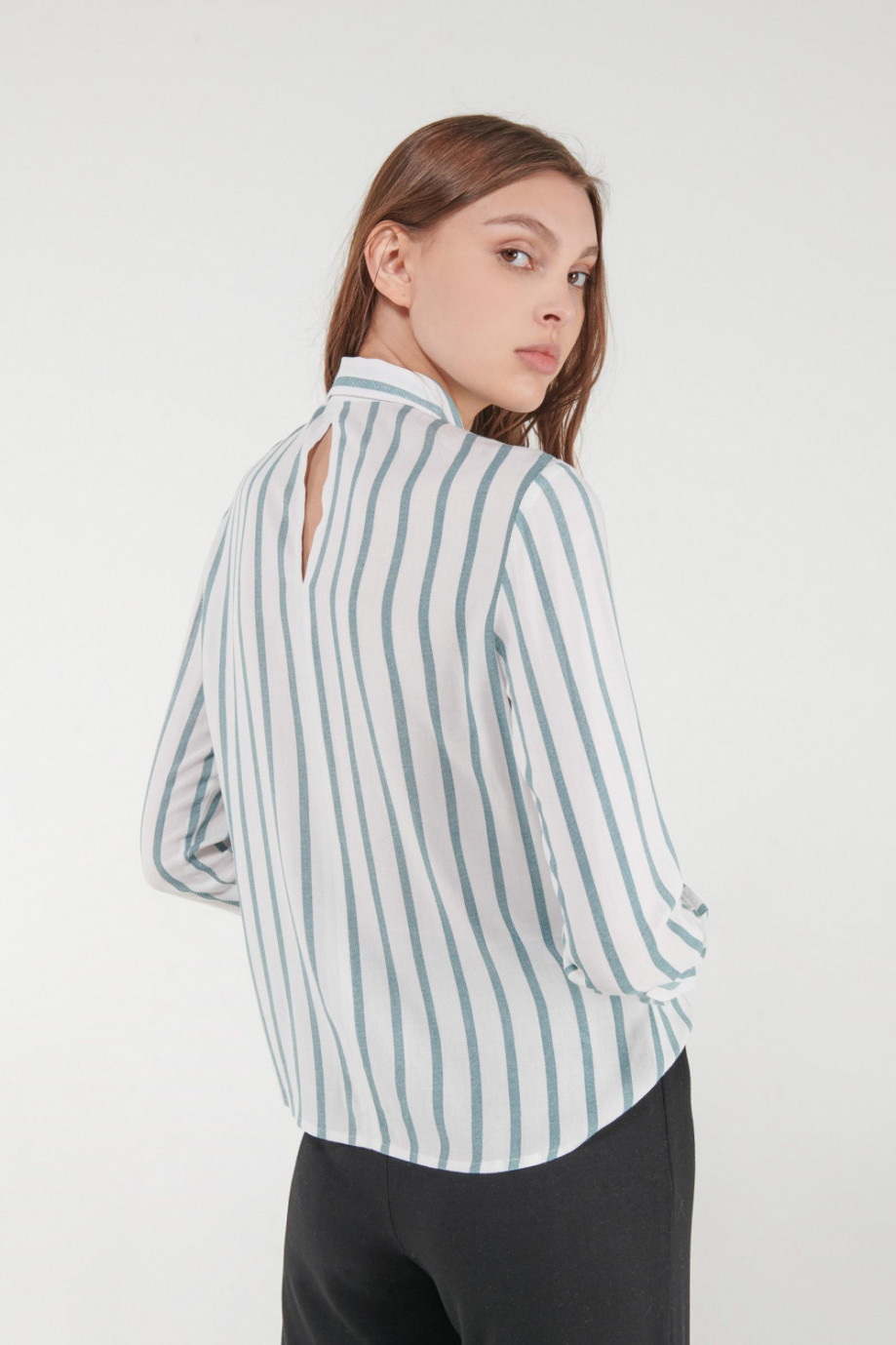 Blusa para mujer en tela fluida, a rayas, con bolsillo, manga larga, abertura posterior