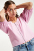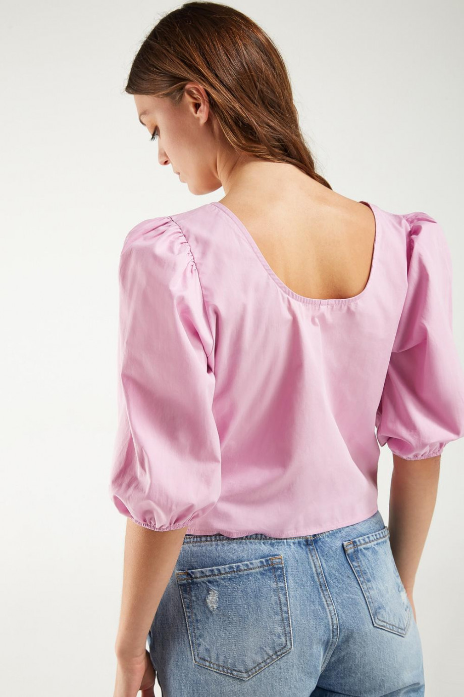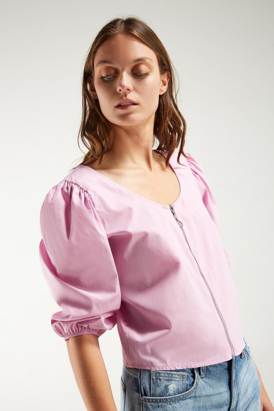 Blusa unicolor, manga larga con cremallera en espalda cuello cuadrado.