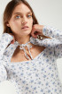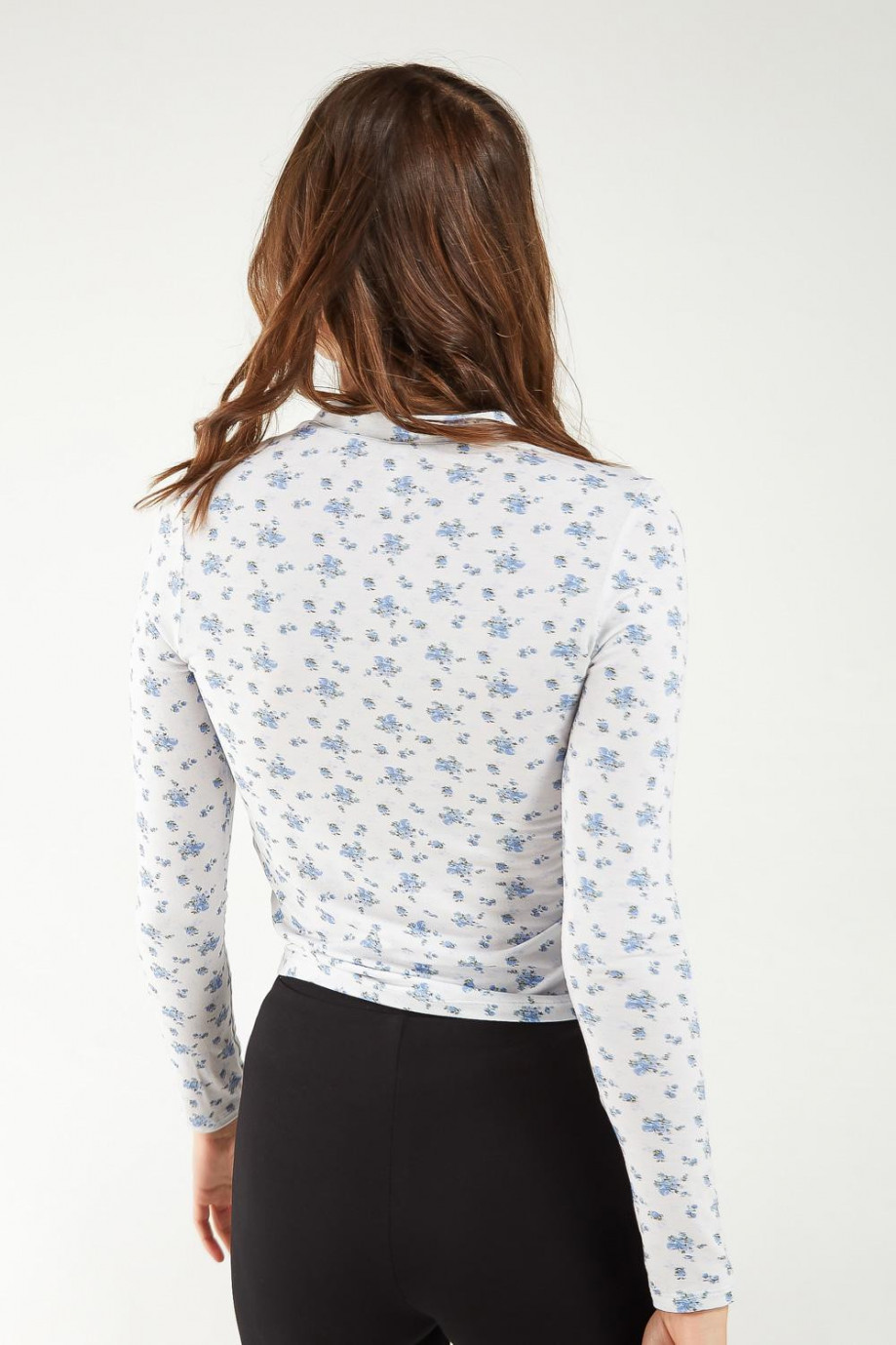 Camiseta manga larga, con estampado de flores, con escote y amarre en frente.