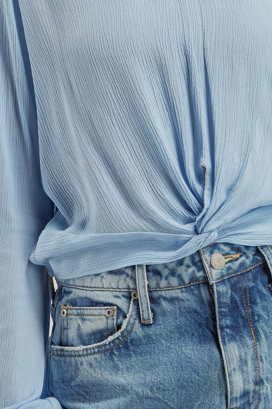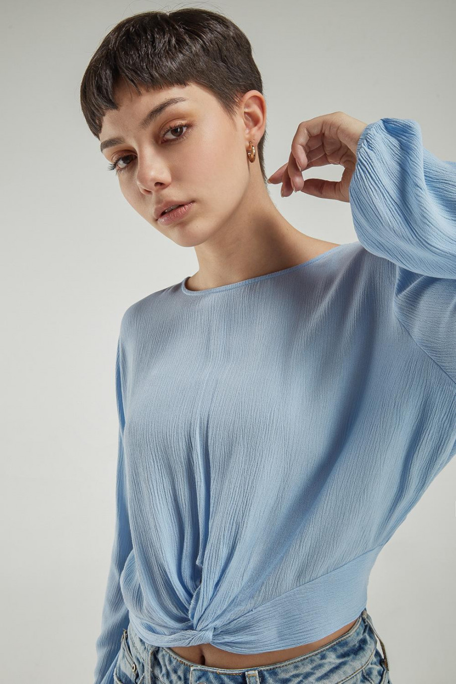Blusa unicolor con anudado en frente, manga larga y elástico en puño
