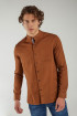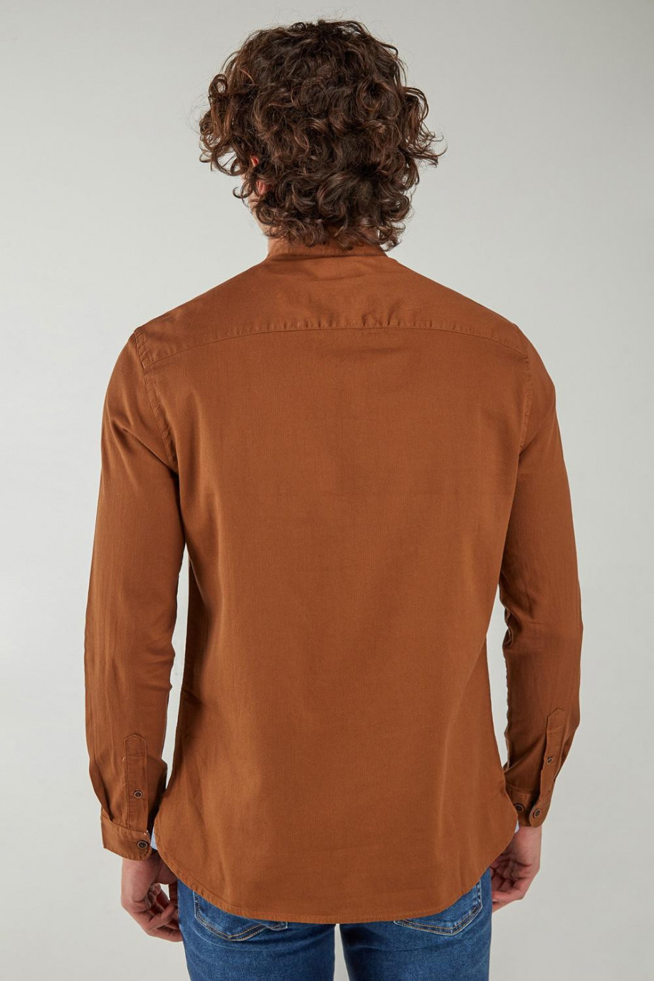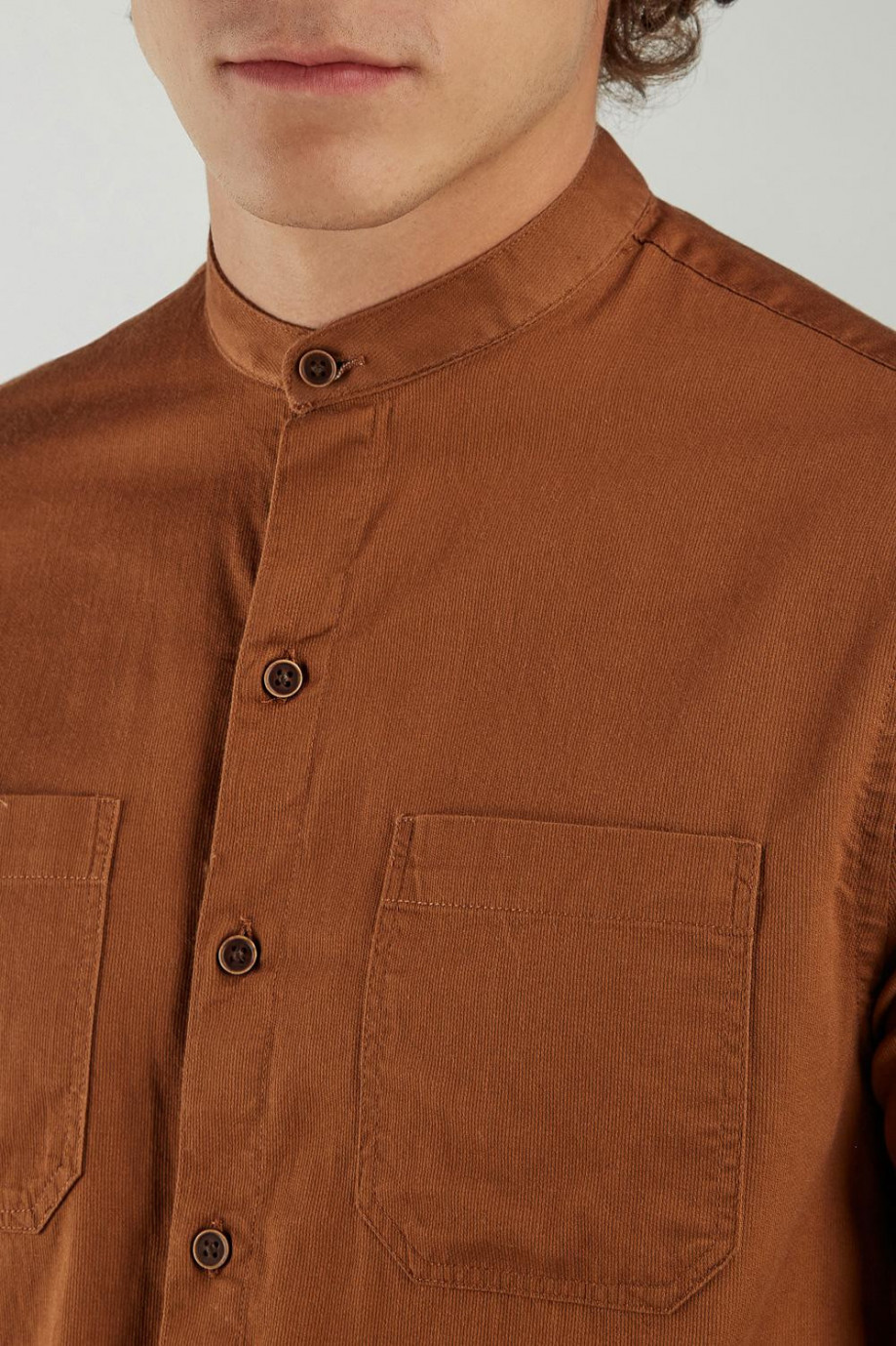 Camisa cuello mao, manga larga con tela unicolor con textura de rayas y doble bolsillo en el frente.