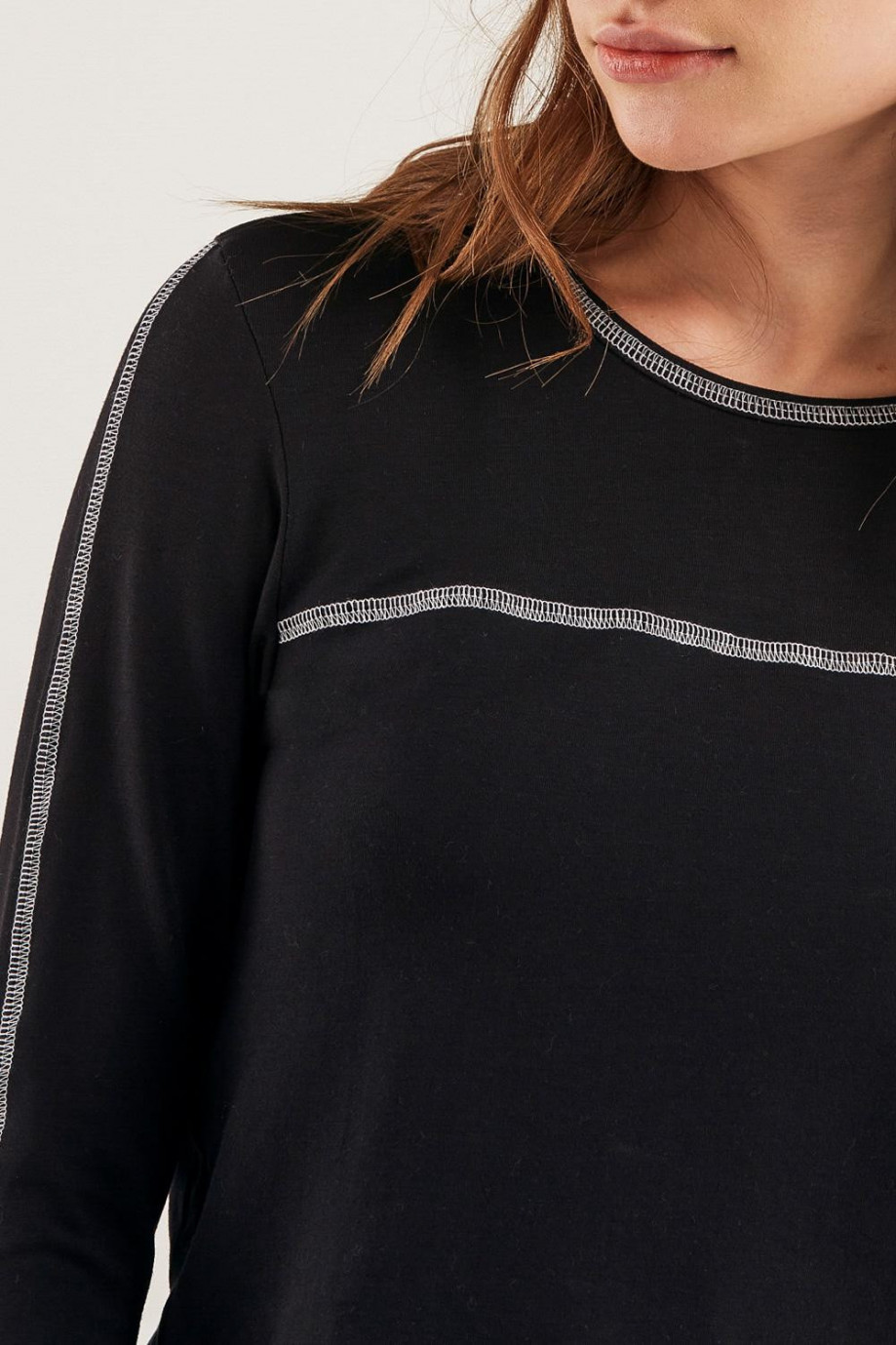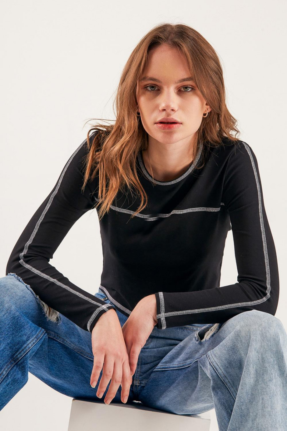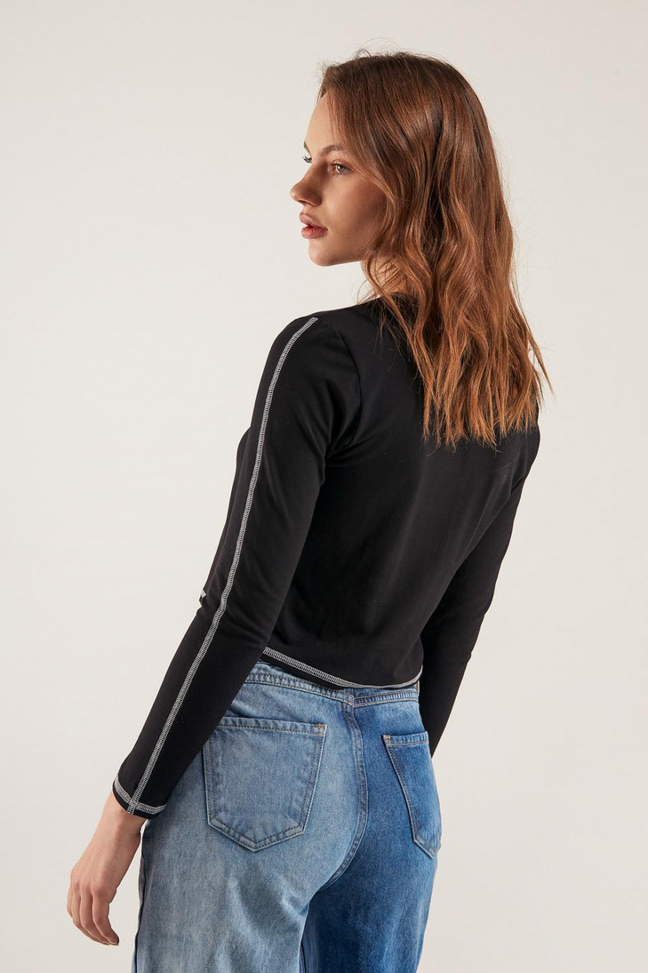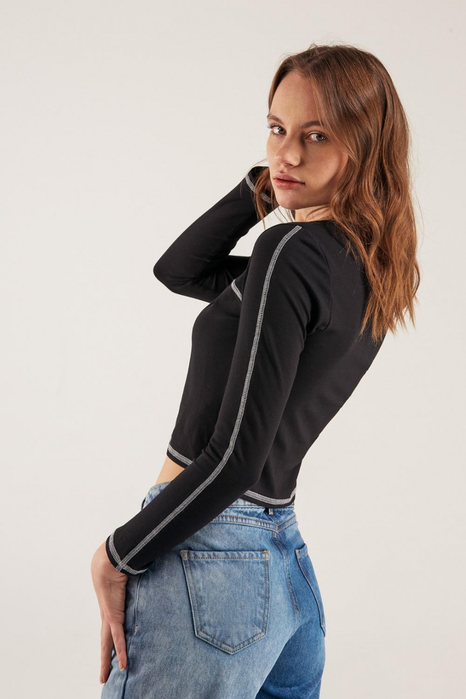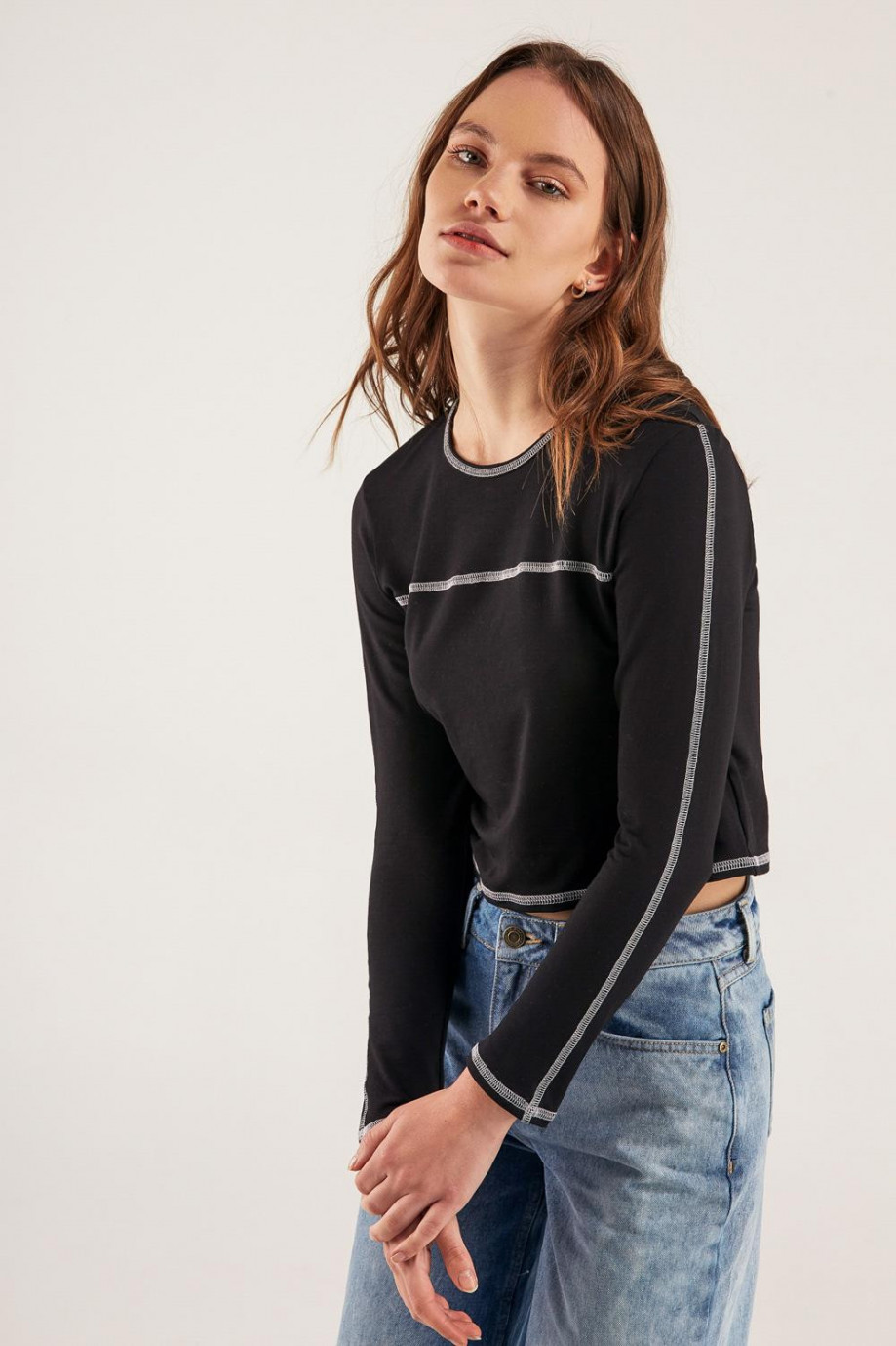 Camiseta unicolor, manga larga con cuello redondo.