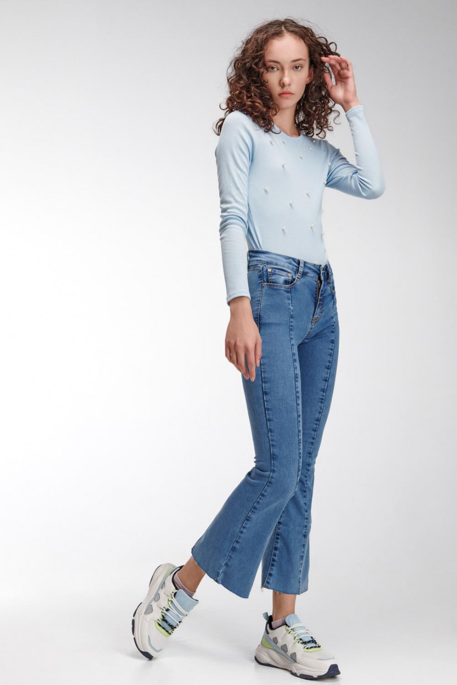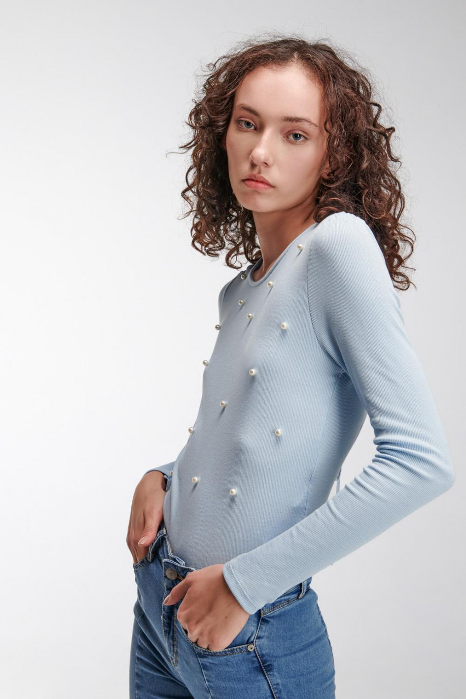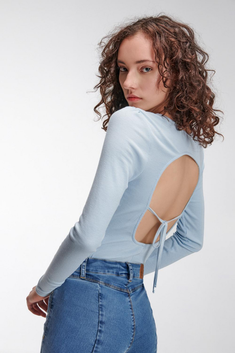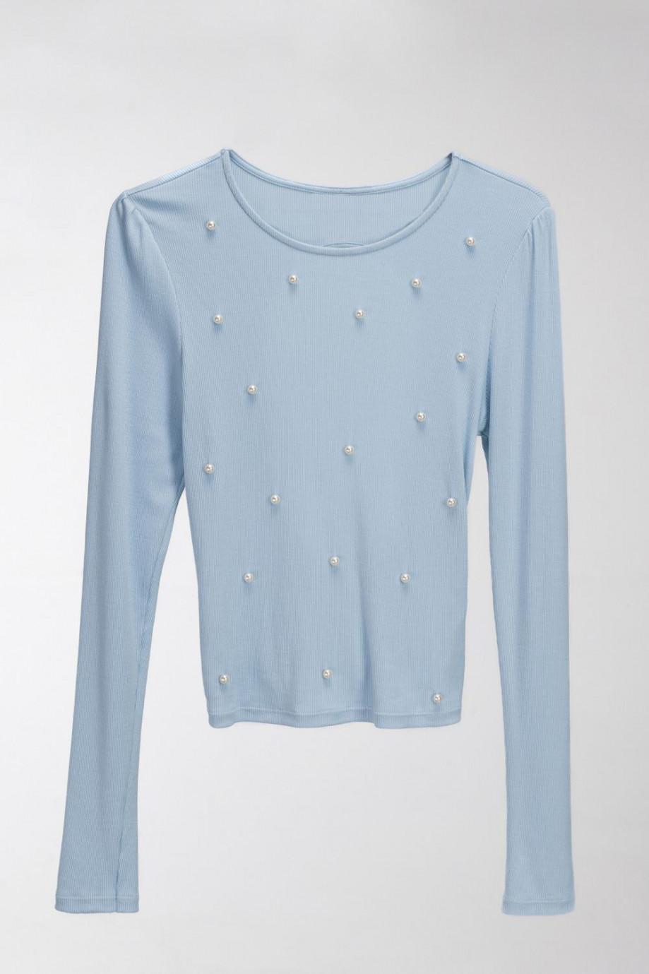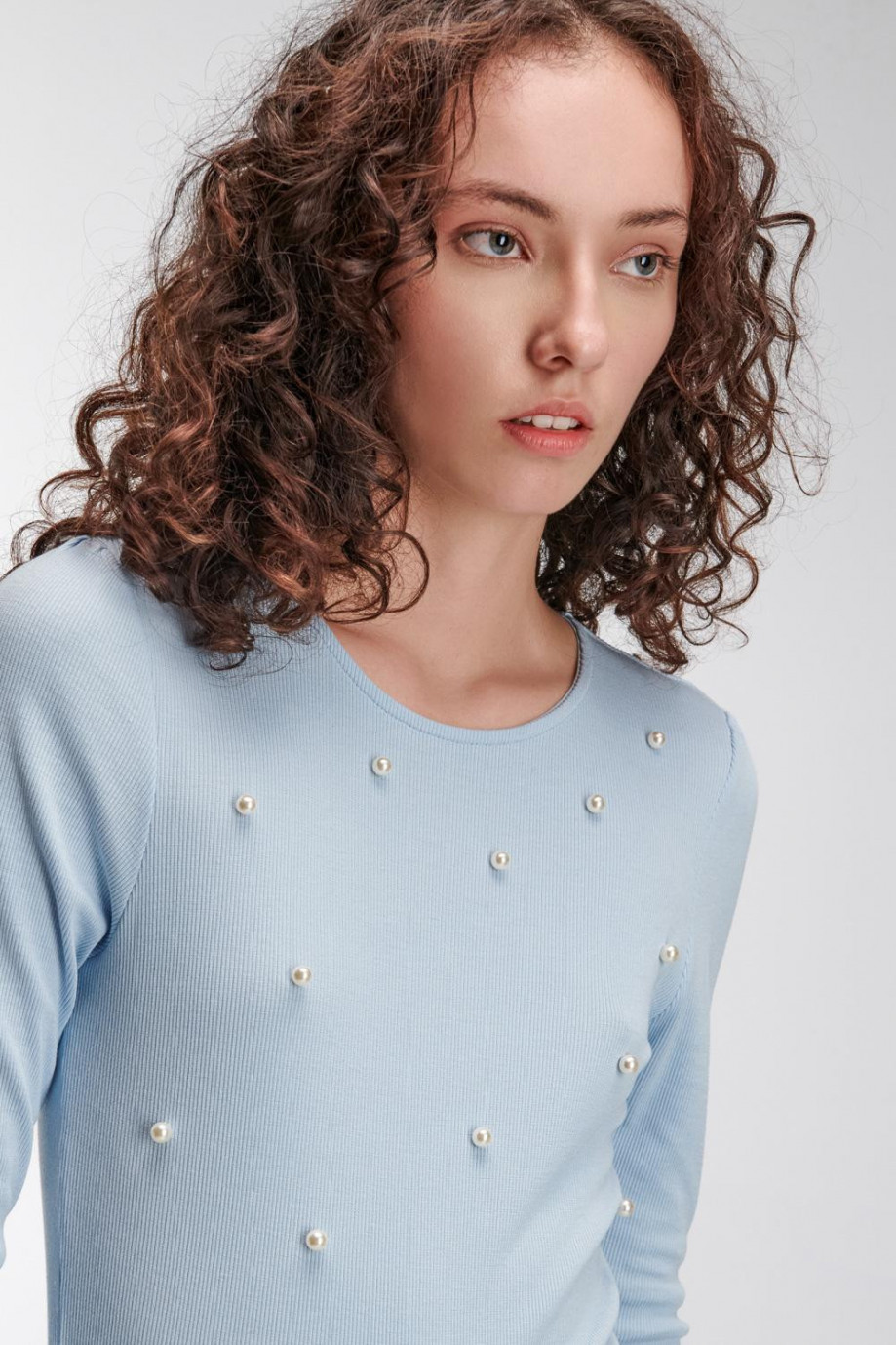 Camiseta para mujer, manga larga, unicolor, cuello redondo con recogido en manga.