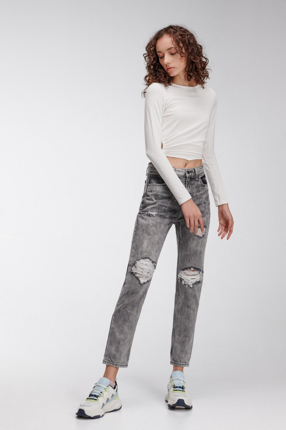 Camiseta sin estampado, manga larga, con cruce detalle de recogido y anudado en costados, ruedo en “V”
