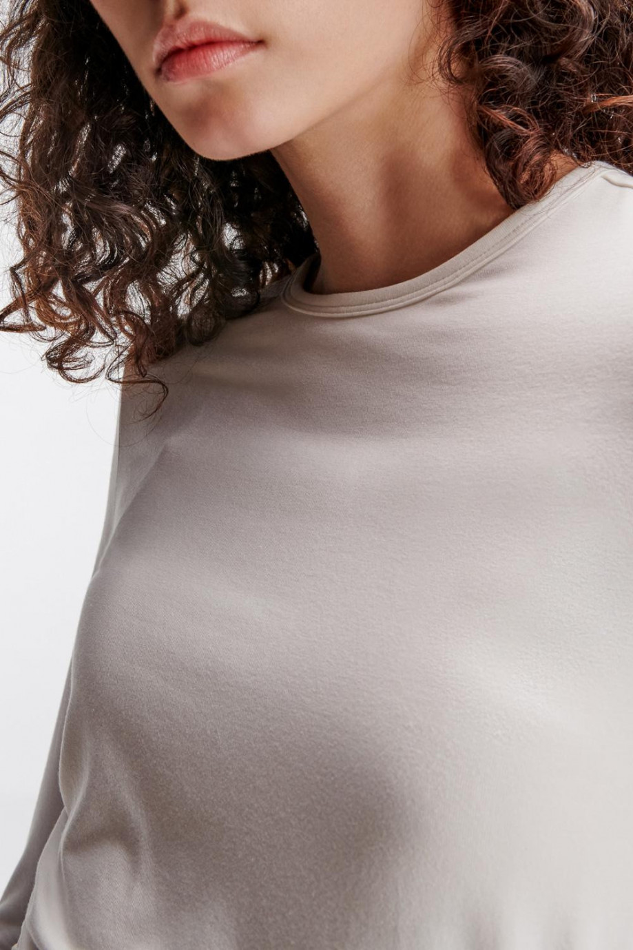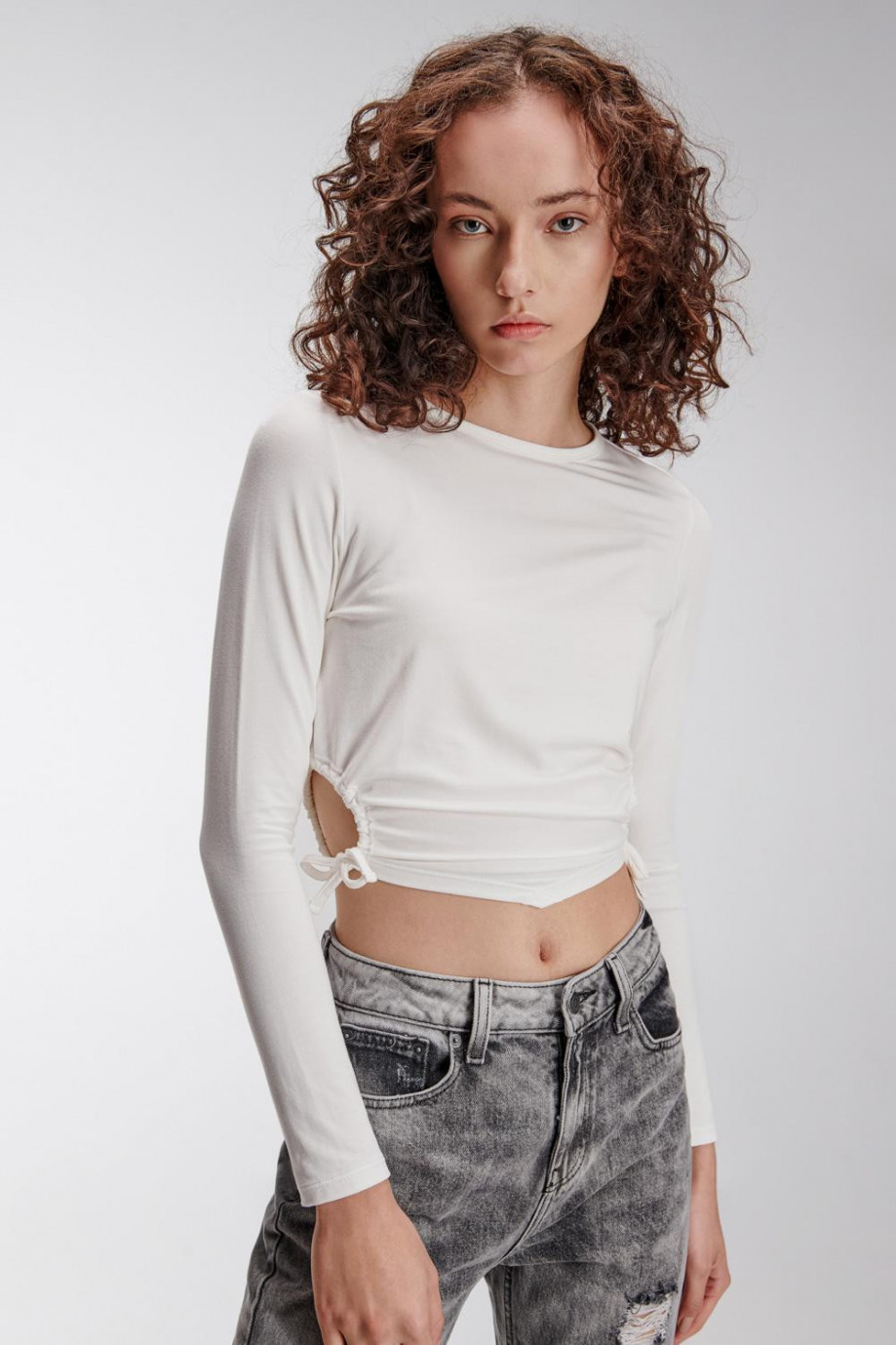 Camiseta femenina chic sin estampar, con manga larga, cuello redondo, recogido en costados con túnel y cordón que genera recogido y anudado en lateral