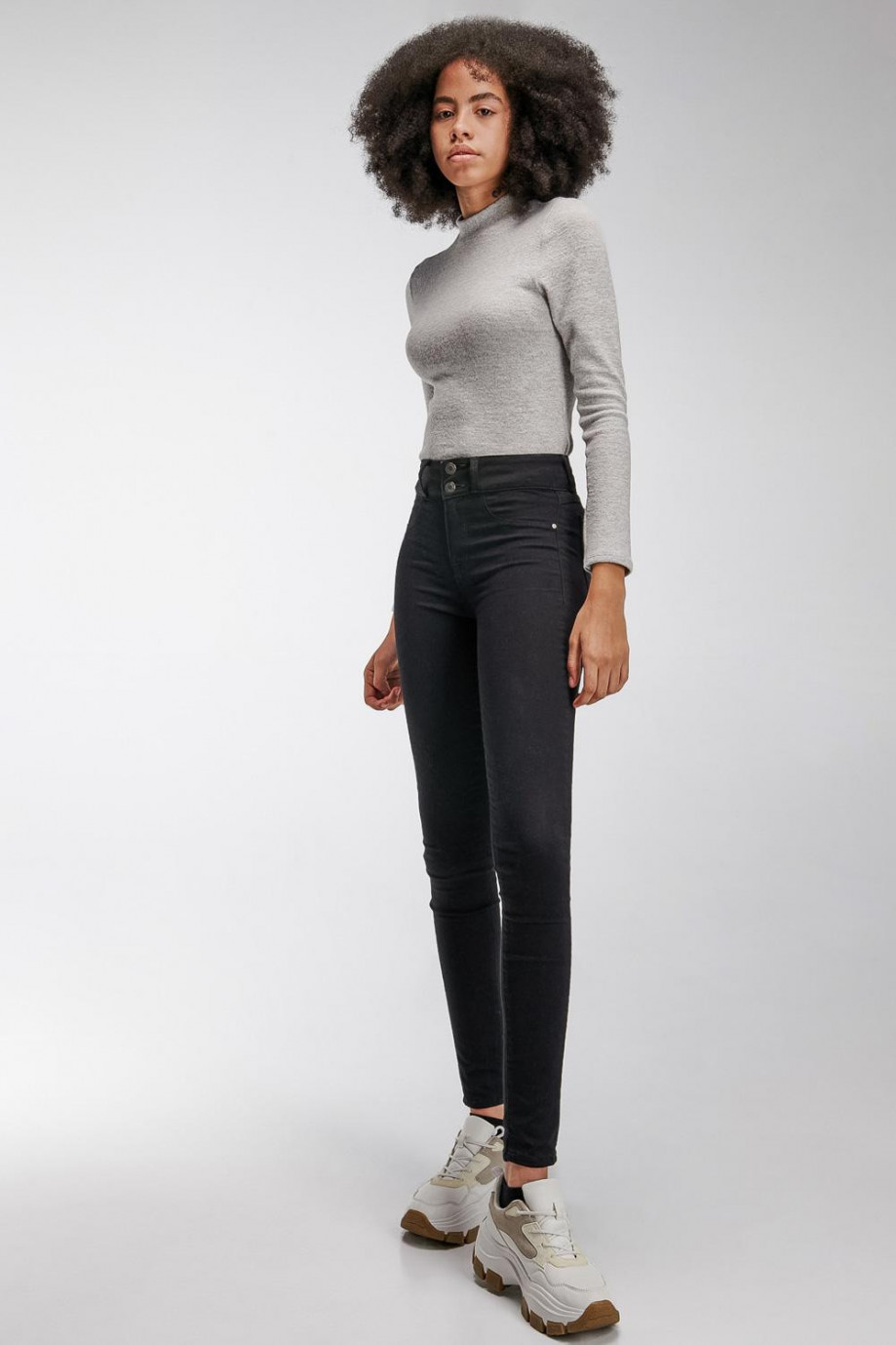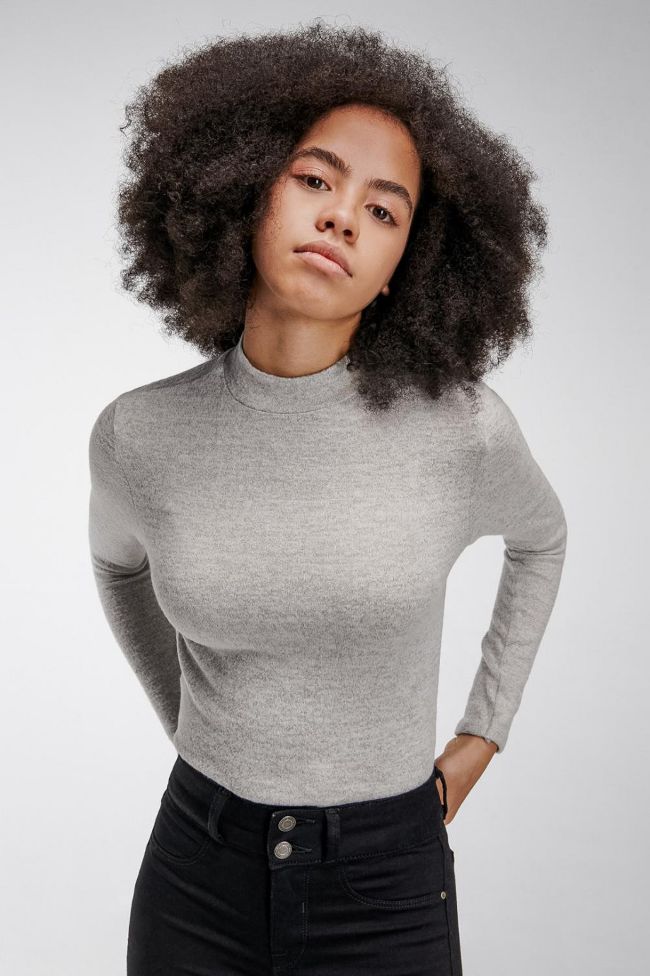 Camiseta básica femenina chic sin estampado, manga larga y cuello alto en la misma tela.