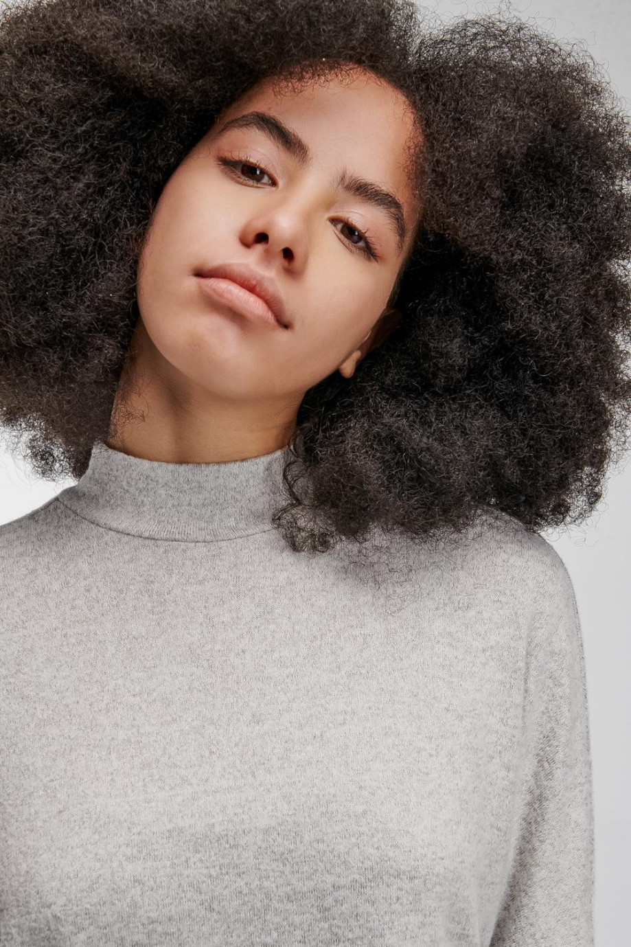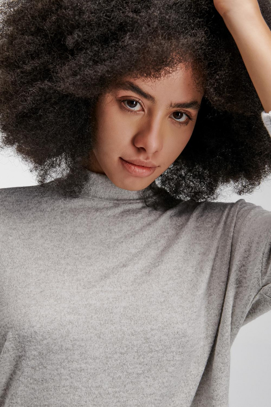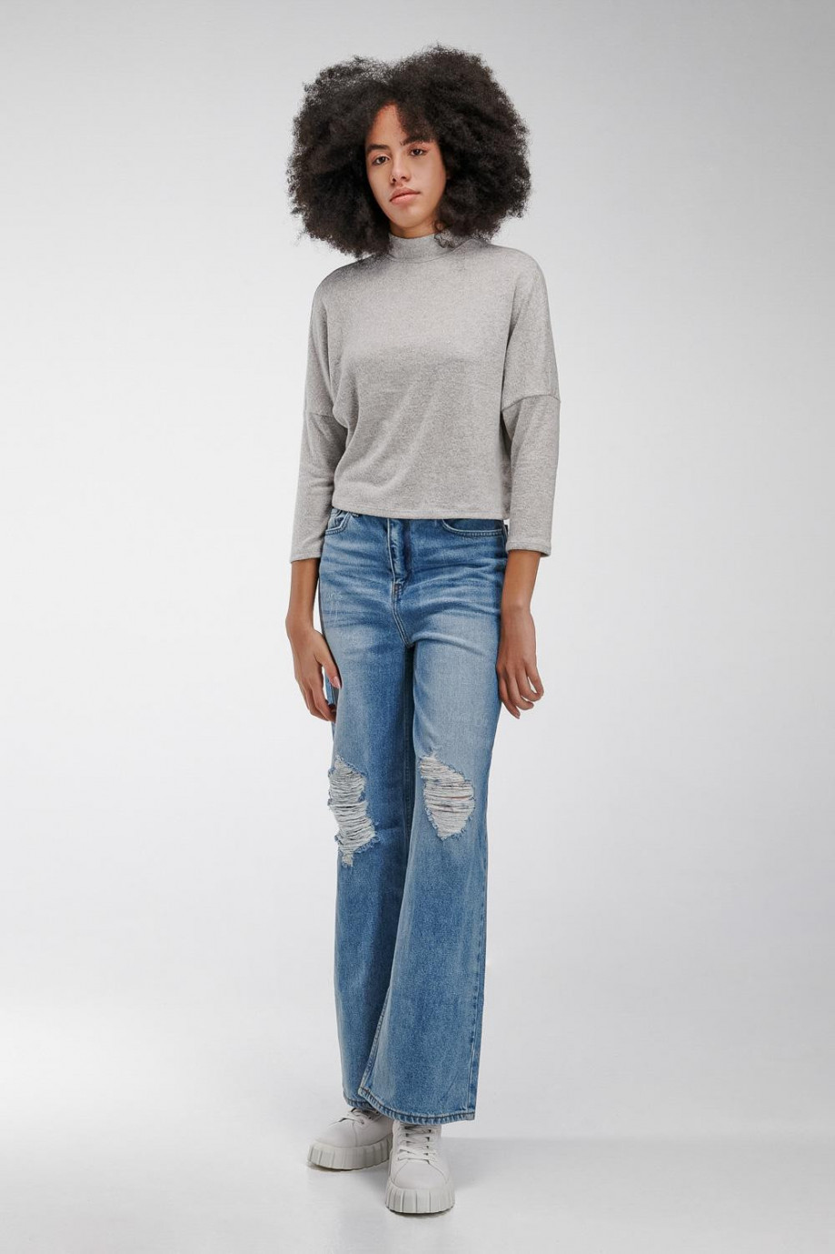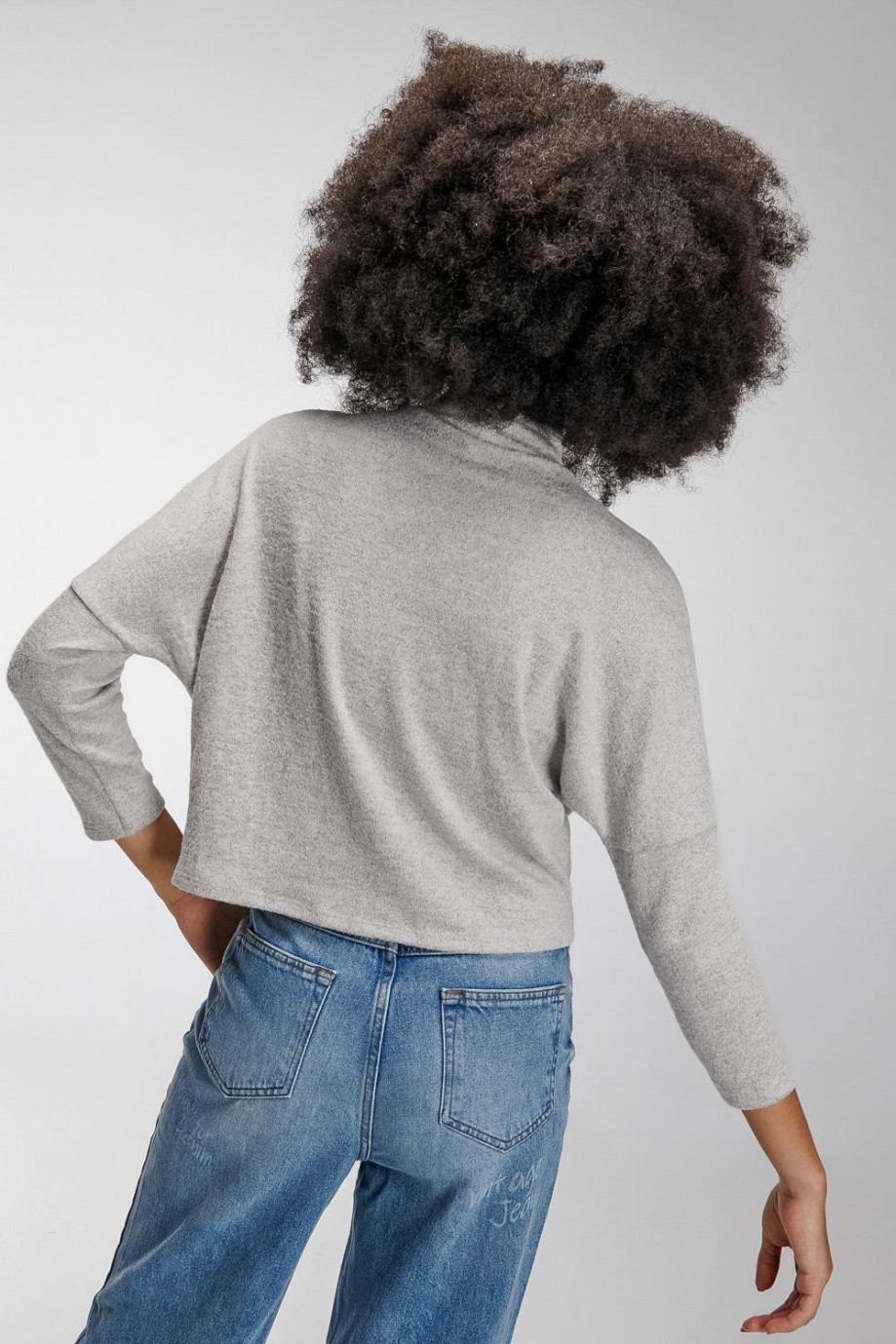 Camiseta crop femenina chic sin estampar,manga larga con hombro caído, cuello alto en la misma tela.