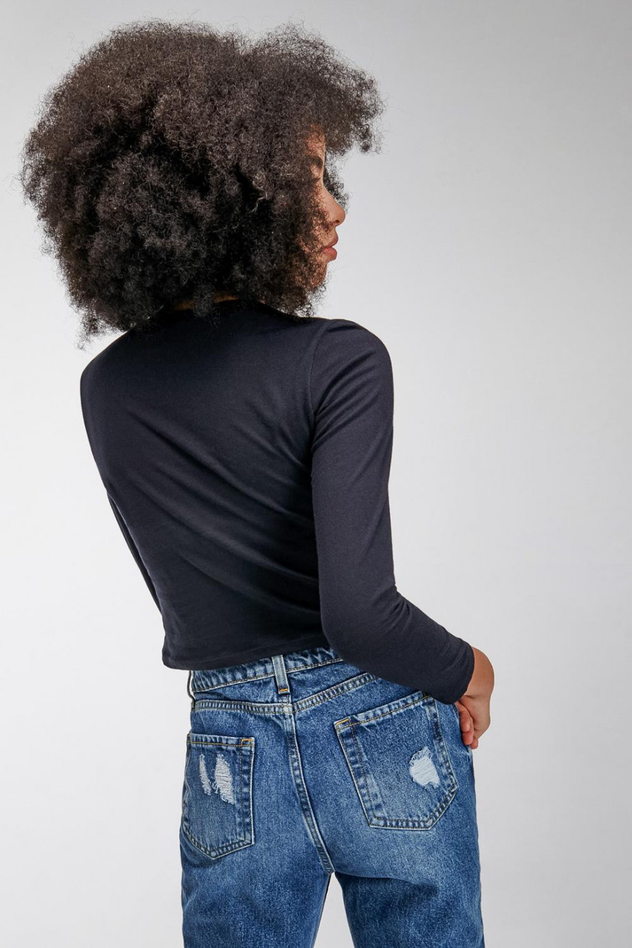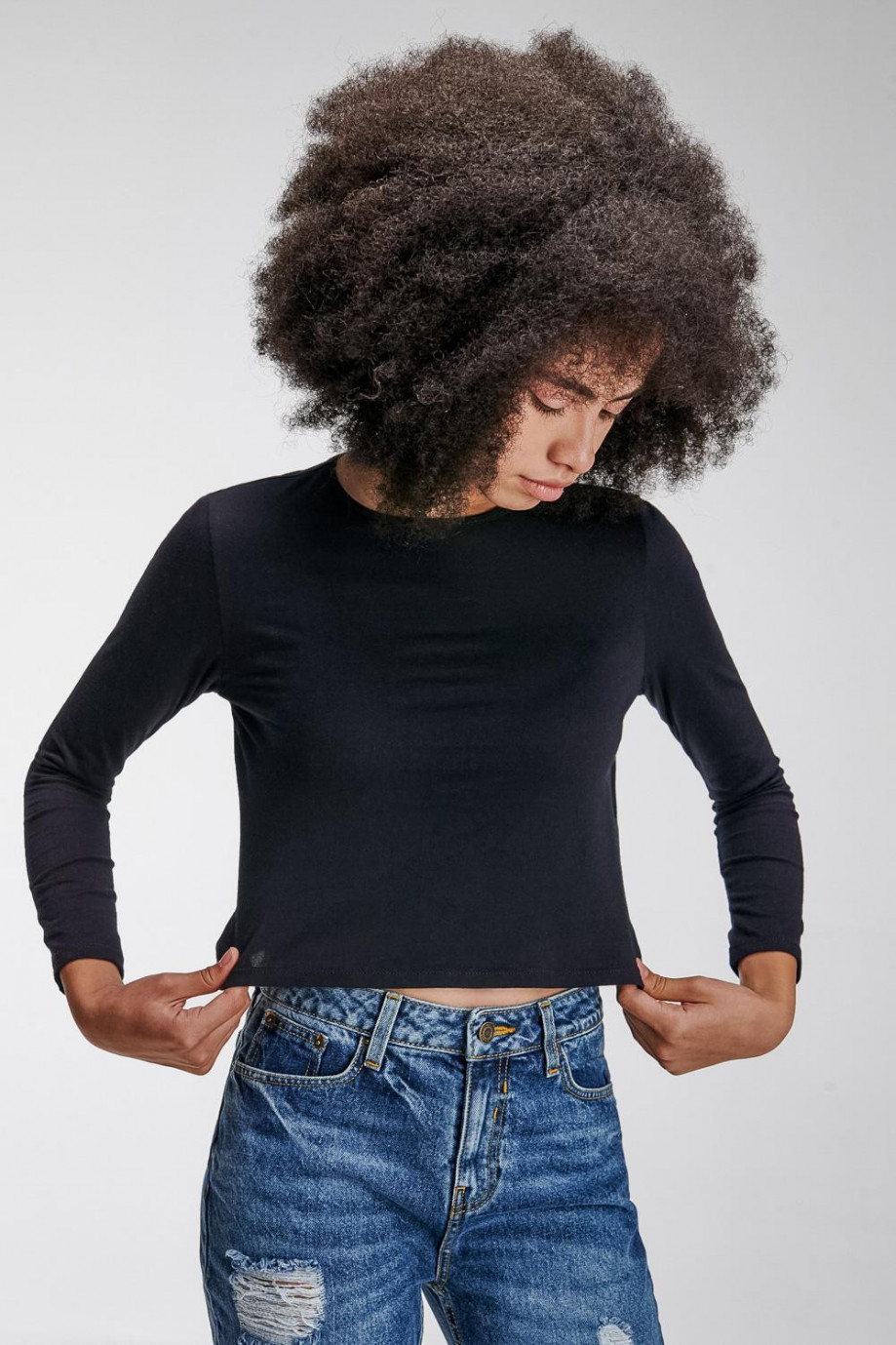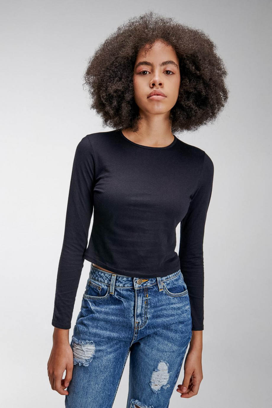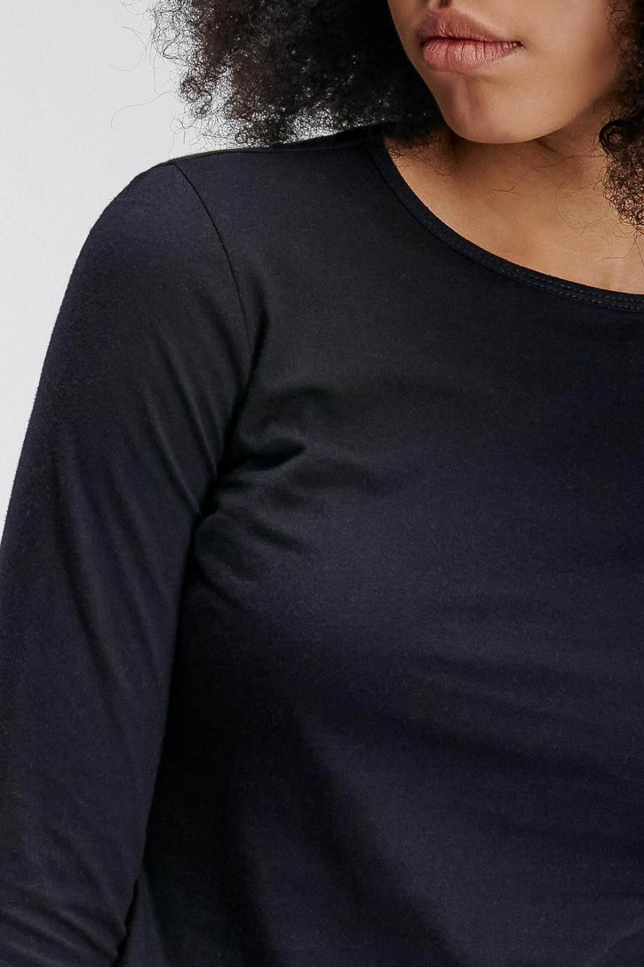 Camiseta básico unicolor femenina, cuello redondo y manga larga.