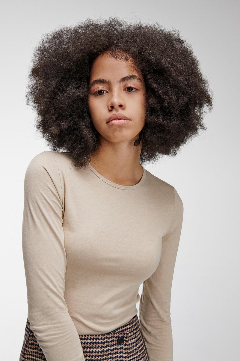 Camiseta básico unicolor femenina, cuello redondo y manga larga.