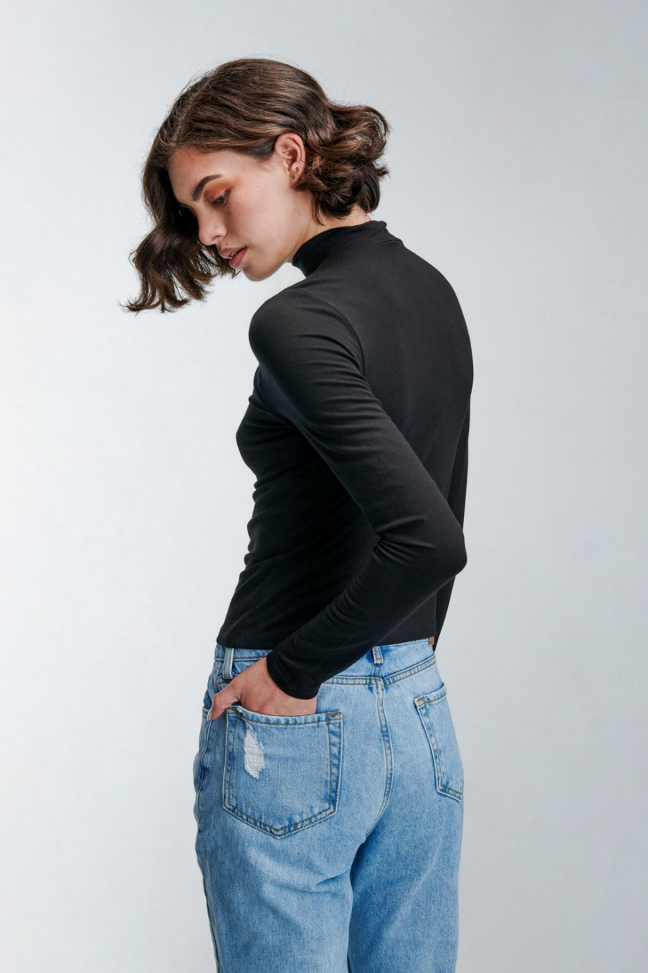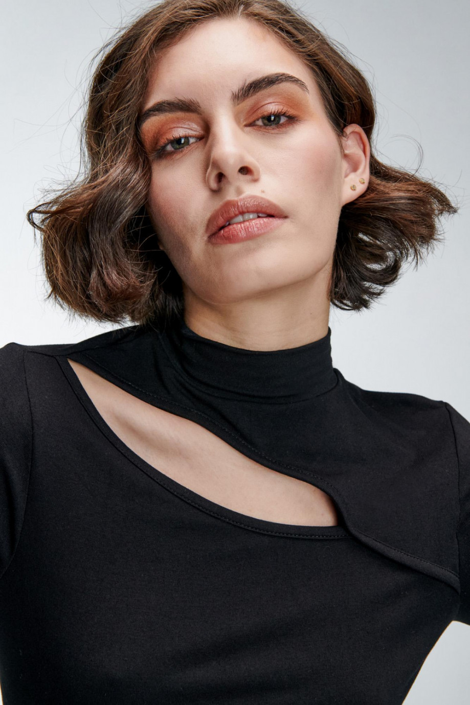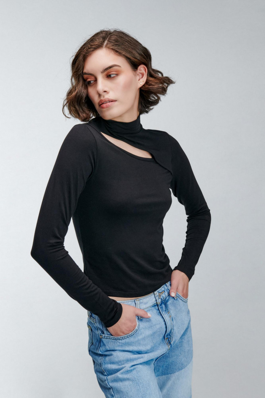 Camiseta unicolor femenina, con cuello alto y detalle asimétrico en escote y manga larga.