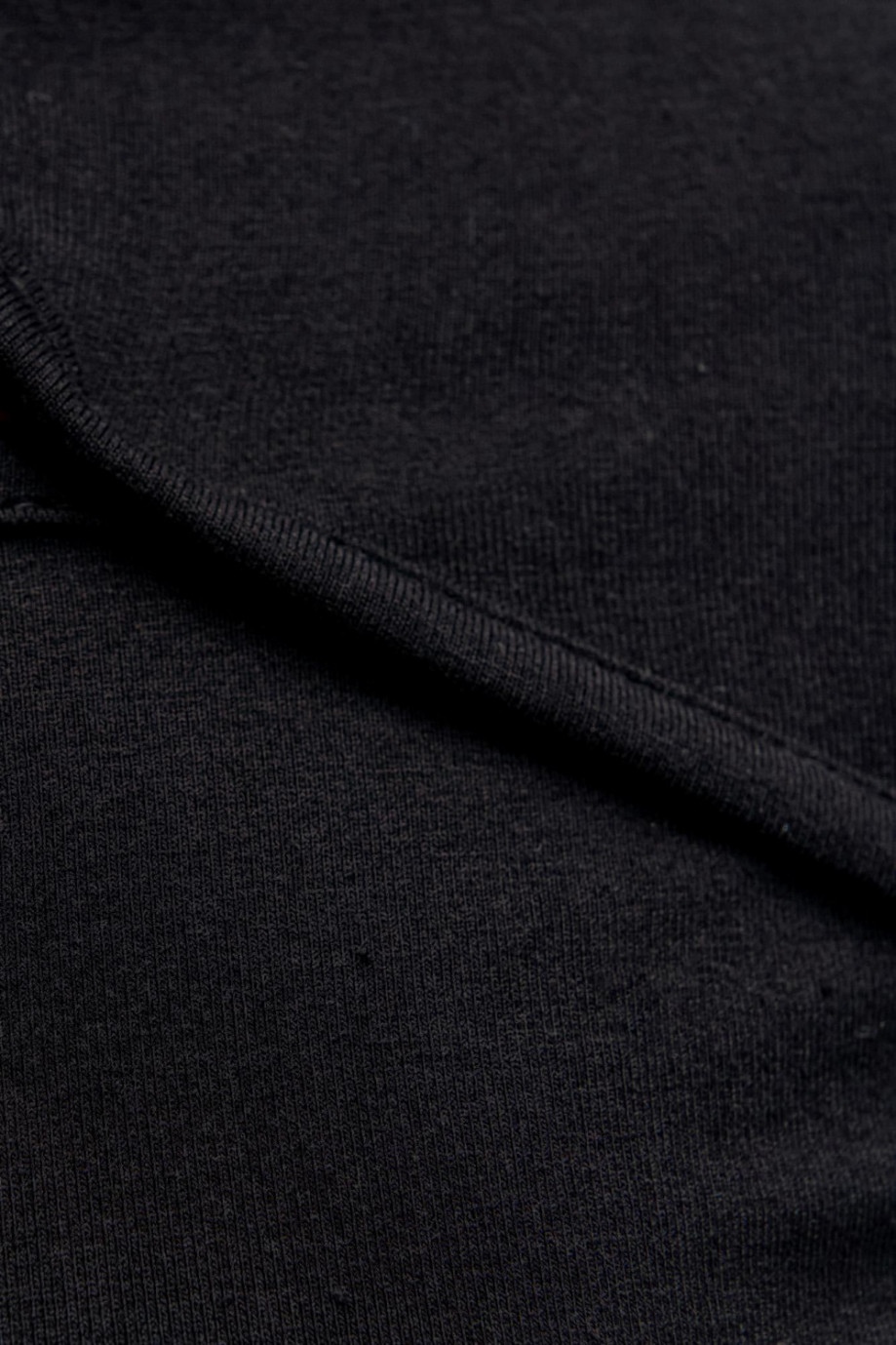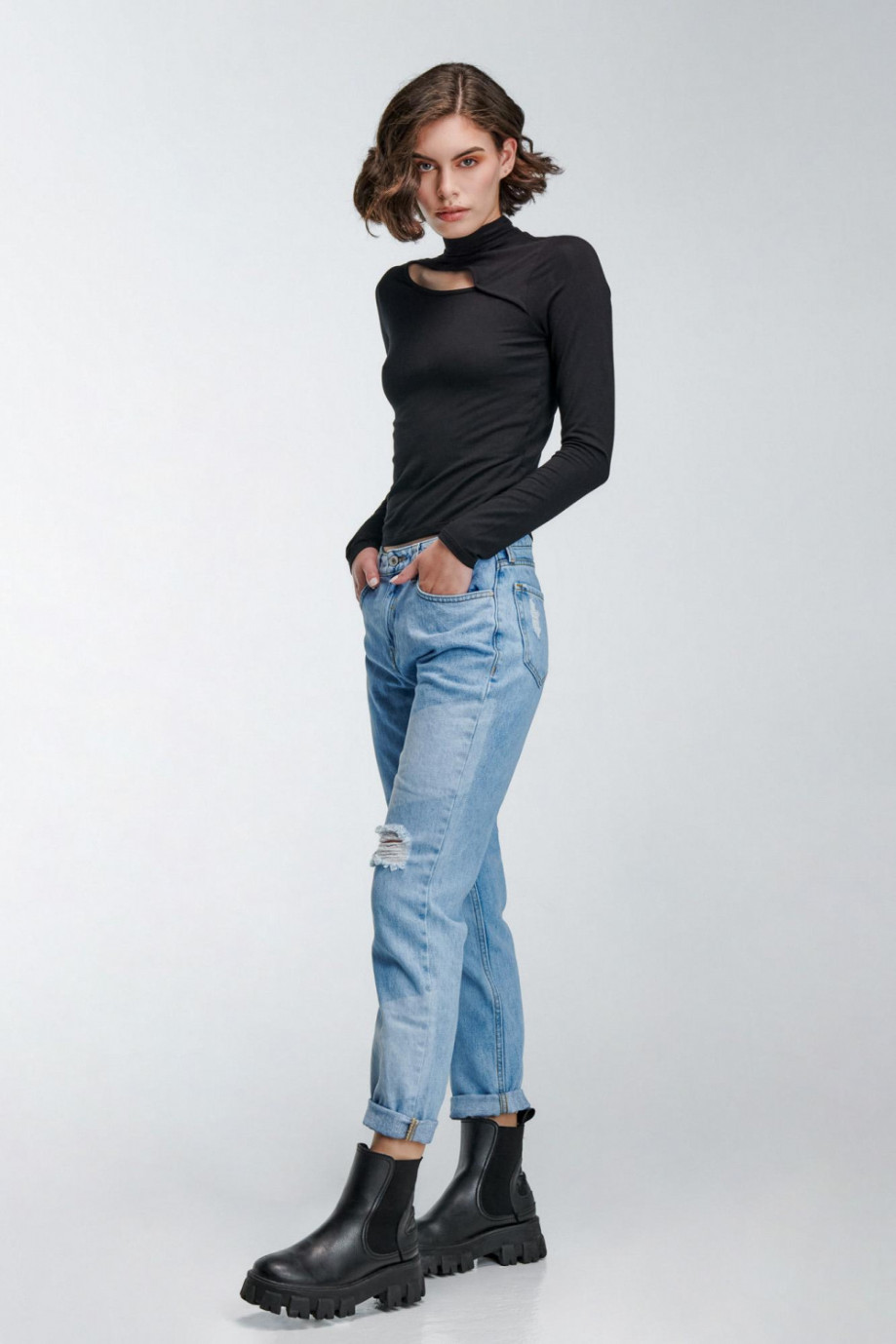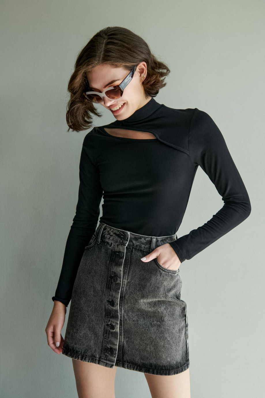 Camiseta unicolor femenina, con cuello alto y detalle asimétrico en escote y manga larga.