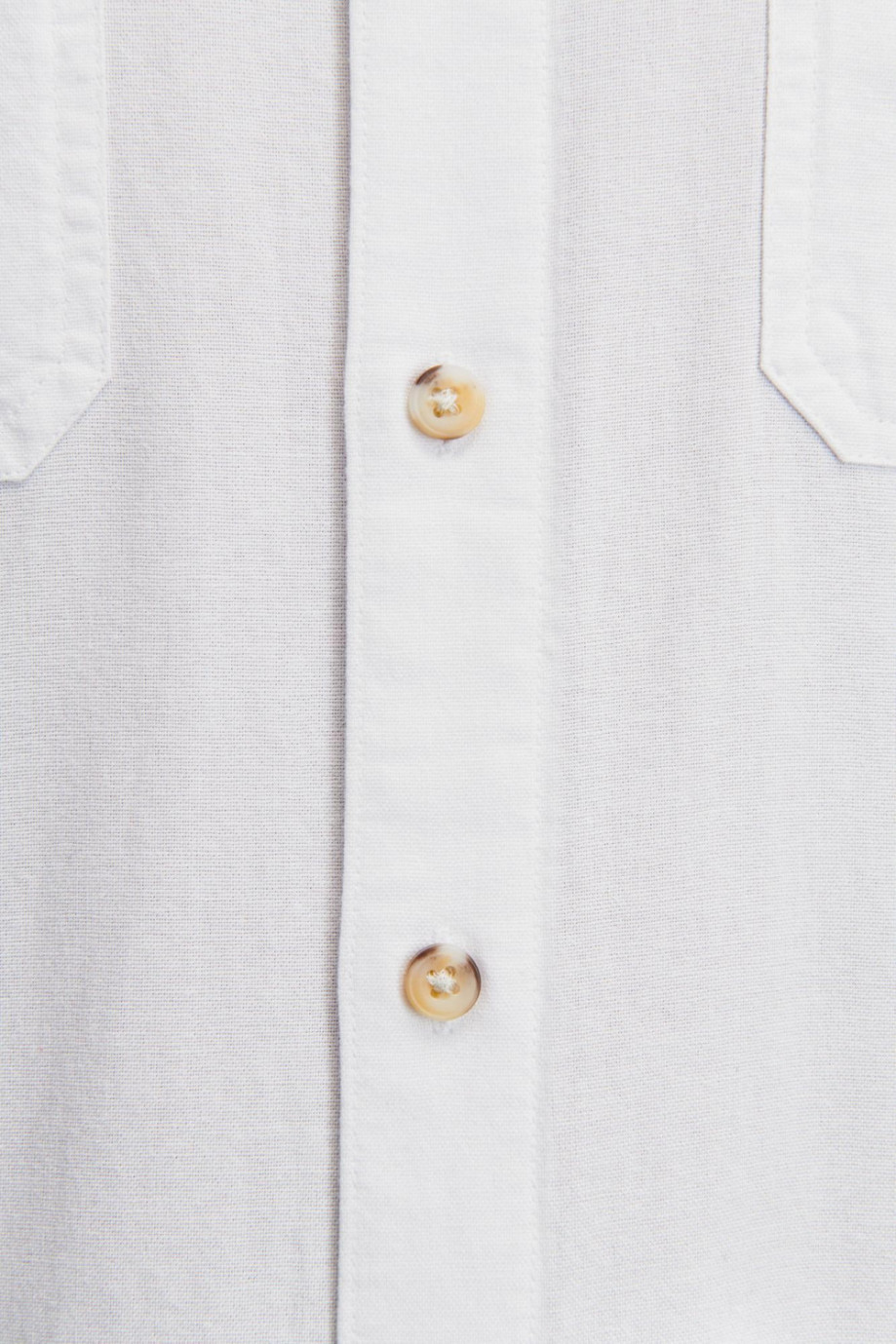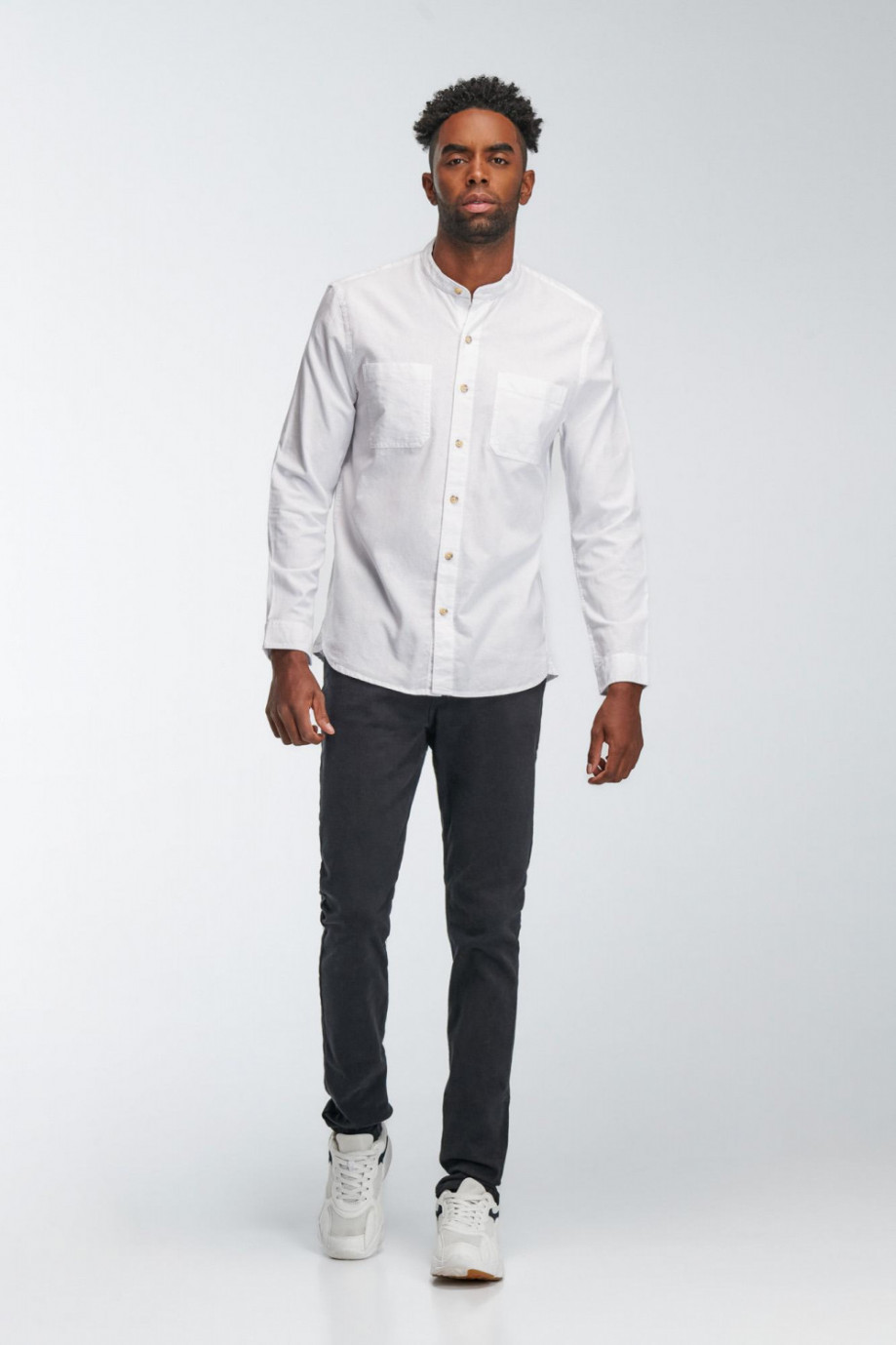 Camisa cuello mao, manga larga con doble bolsillo en el frente, estilo utilitario, unicolor.