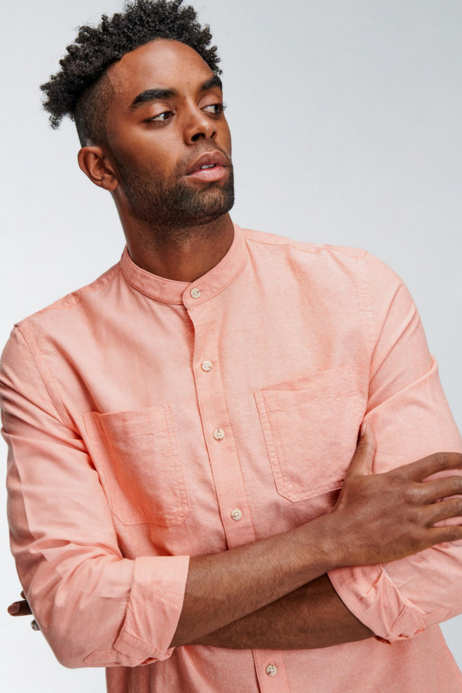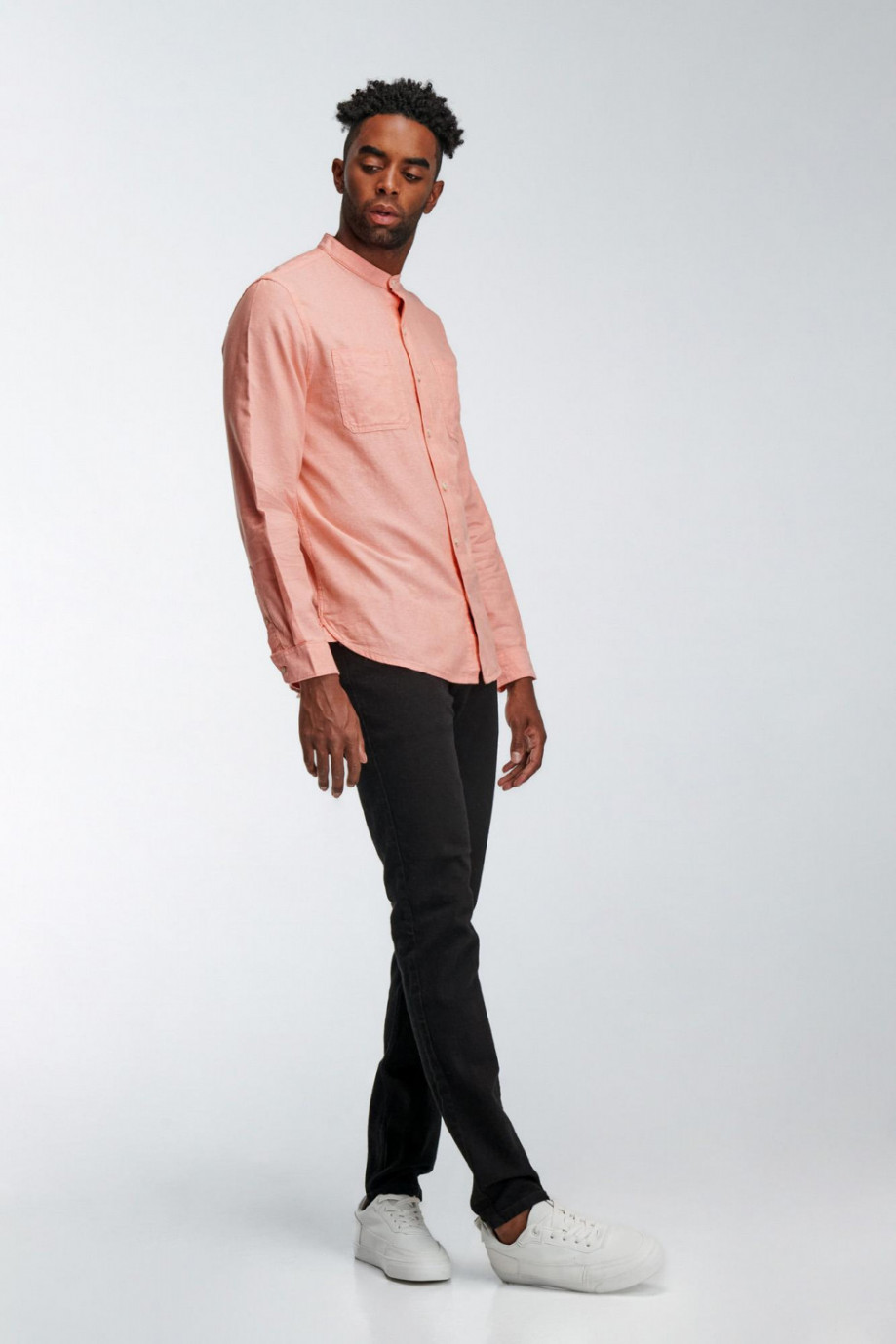 Camisa cuello mao, manga larga con doble bolsillo en el frente, estilo utilitario, unicolor.