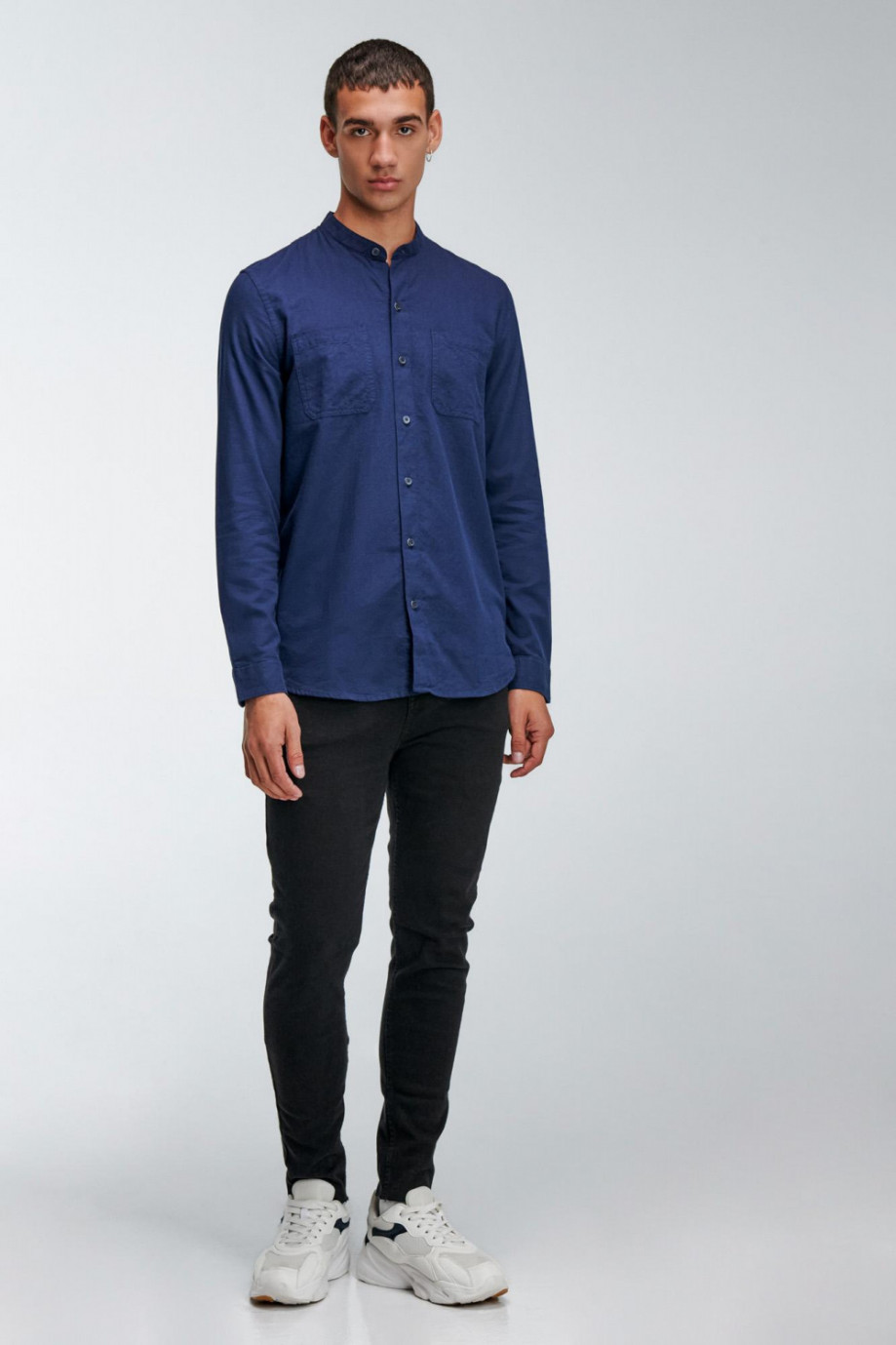 Camisa cuello mao, manga larga con doble bolsillo en el frente, estilo utilitario, unicolor.