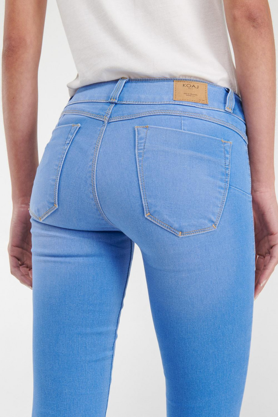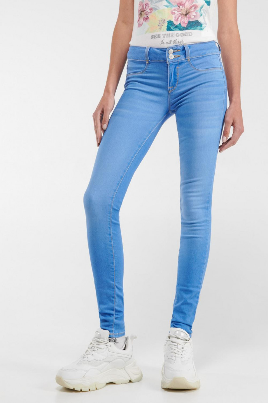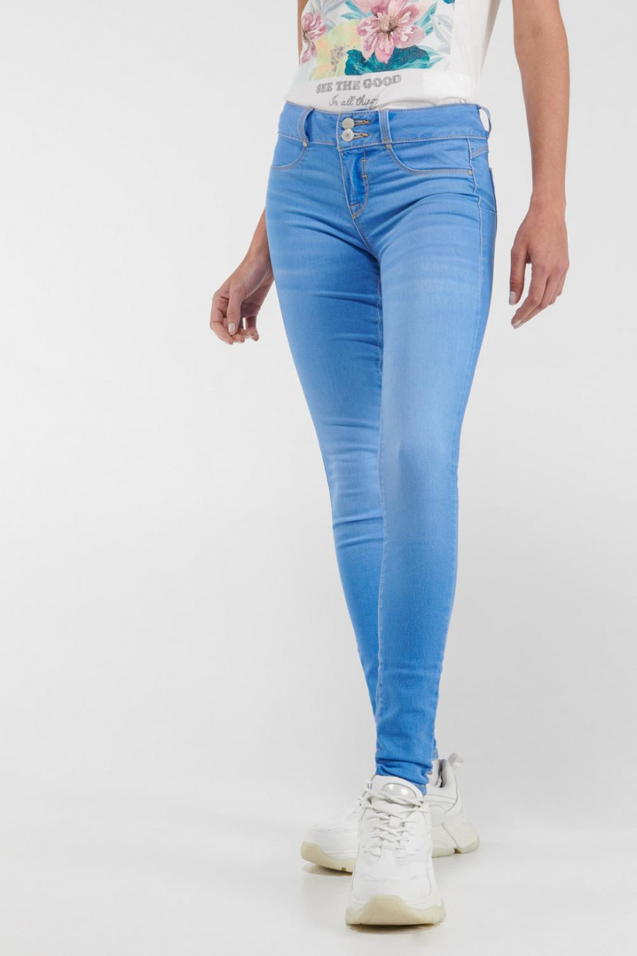 Jean para mujer, 5 bolsillos, tiro medio, pretina ancha de doble botón, efecto push up con lavado muy claro