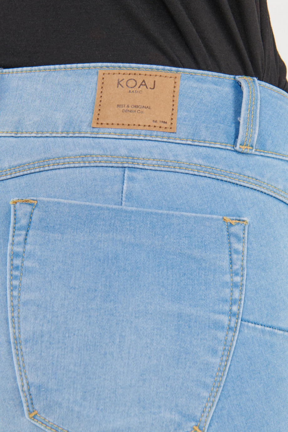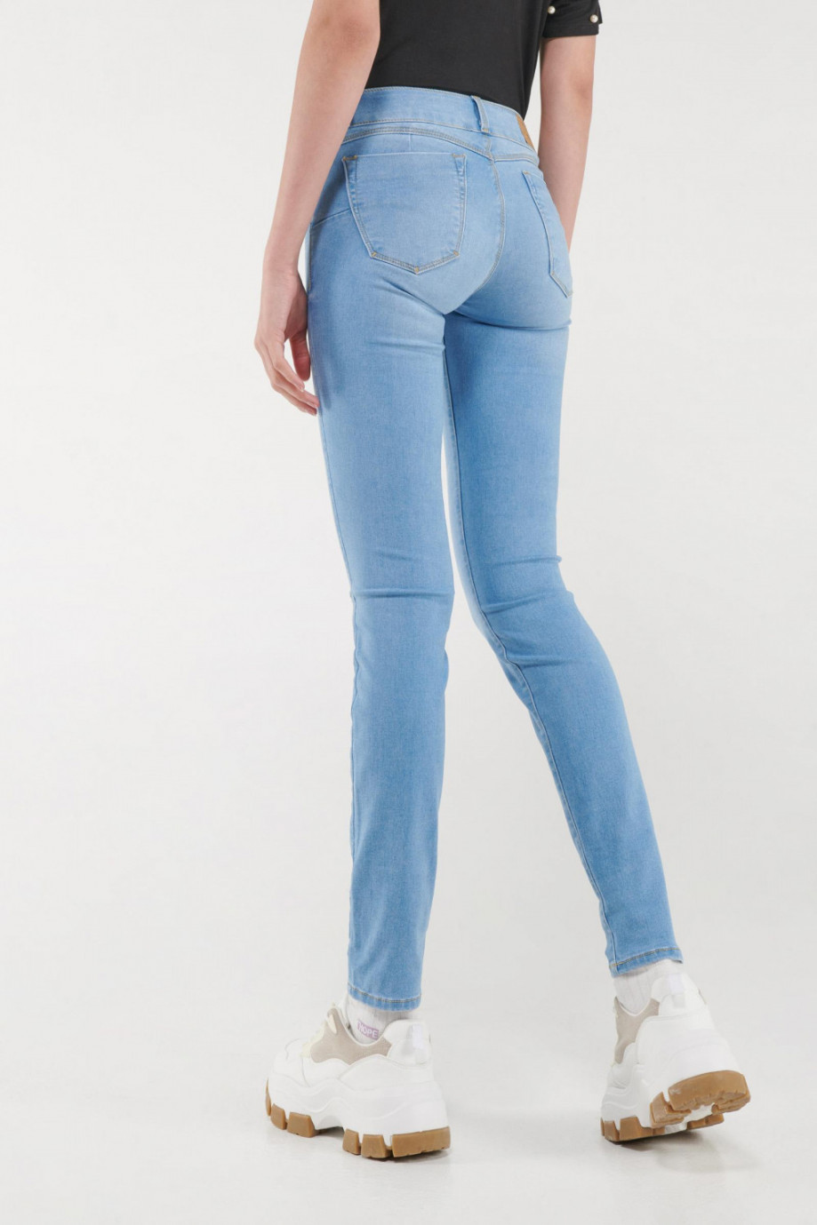 Jean para mujer, 5 bolsillos, tiro medio, pretina ancha de doble botón, efecto push up con lavado muy claro