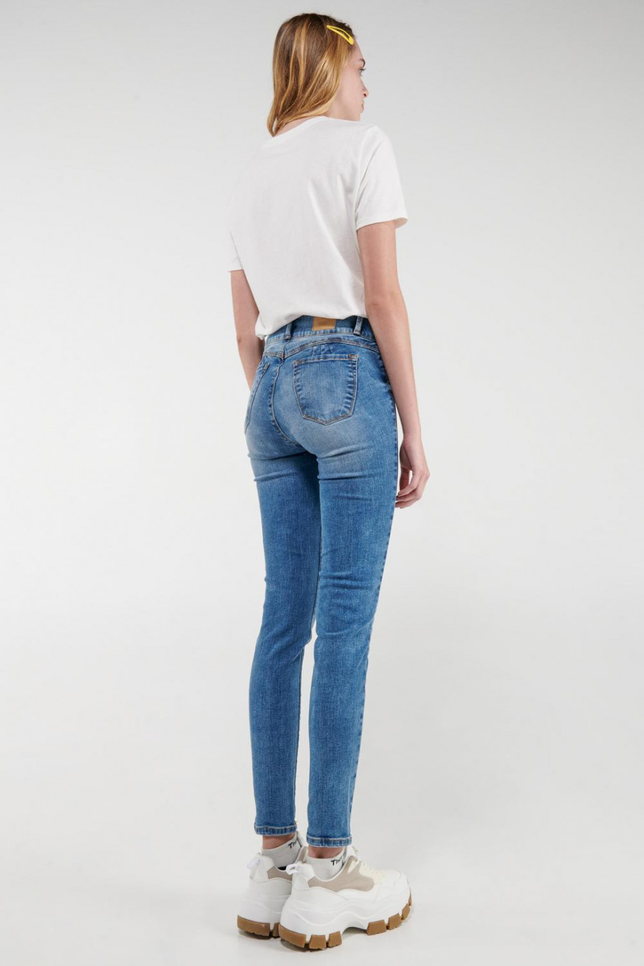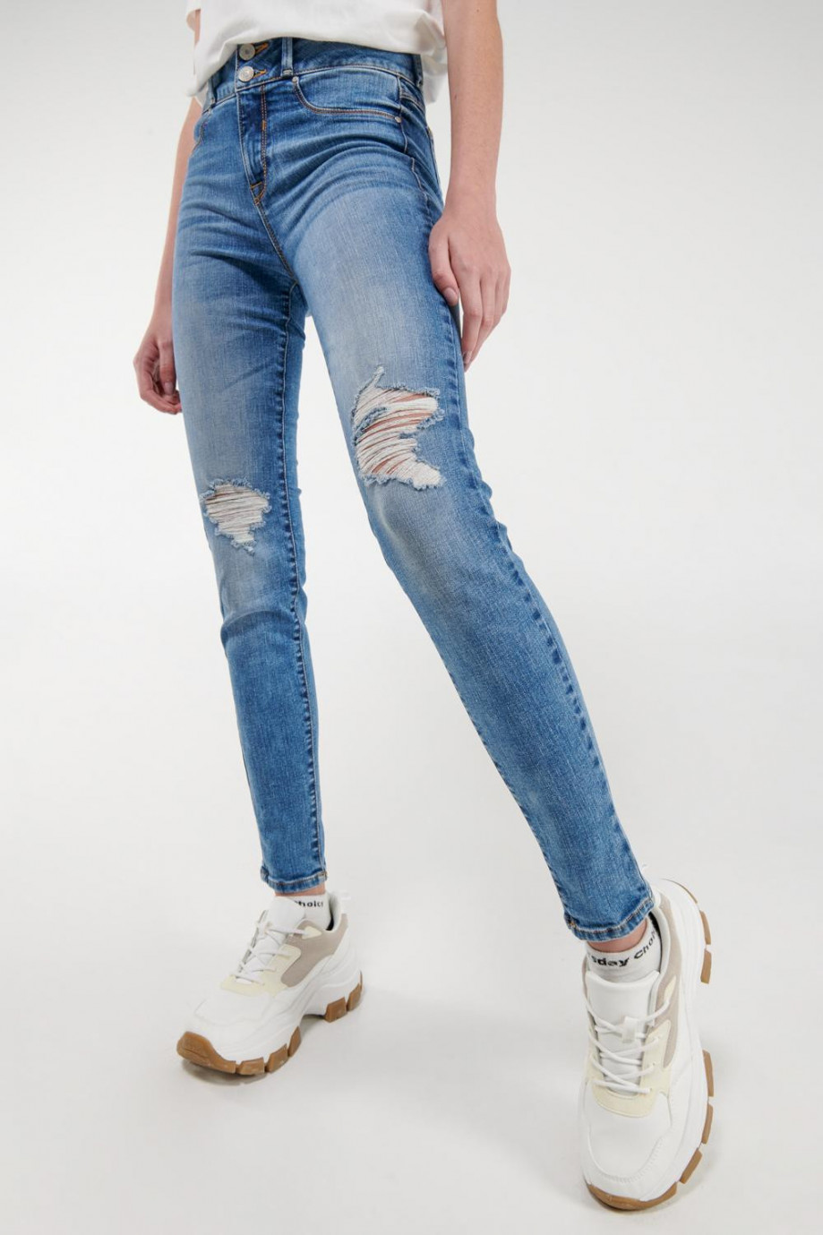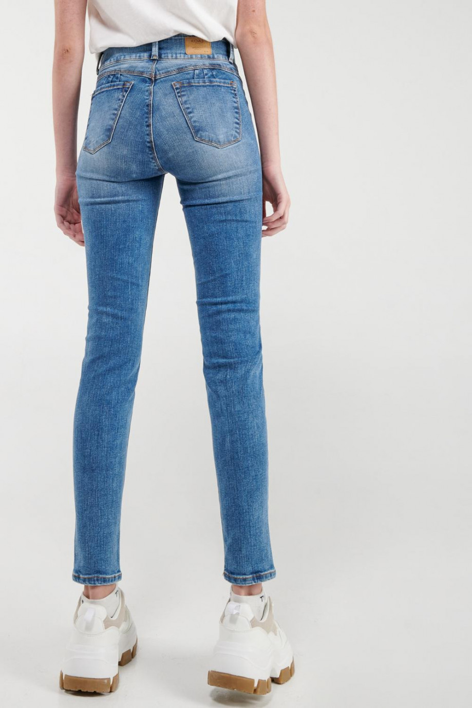 Jean para mujer, 5 bolsillos, tiro medio, pretina ancha de doble botón,  efecto push up con lavado azul claro