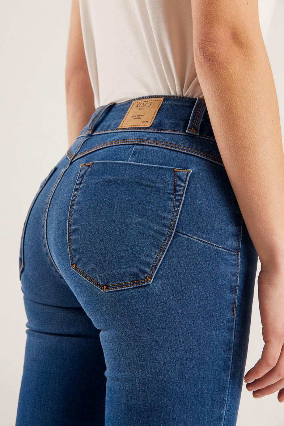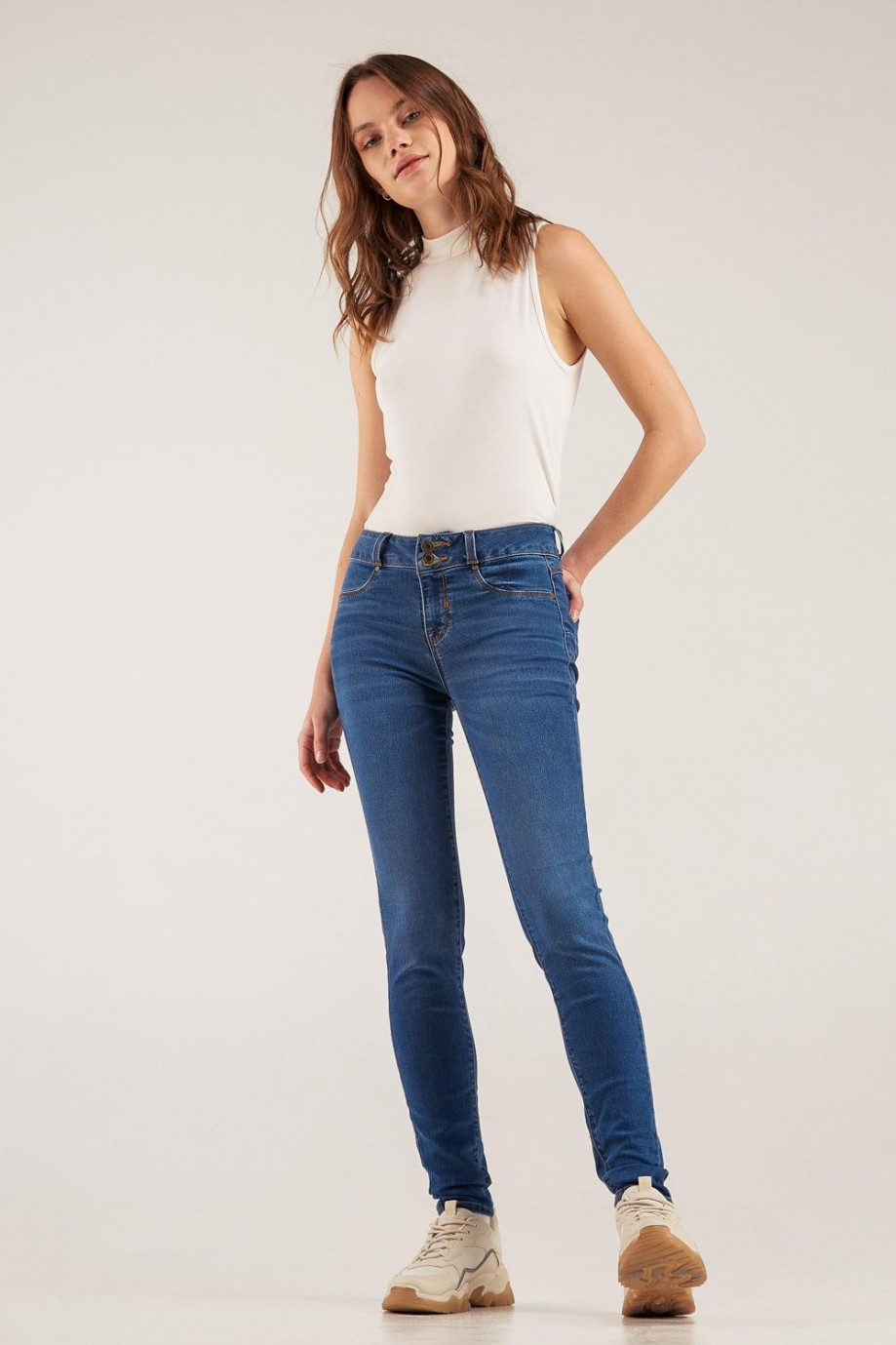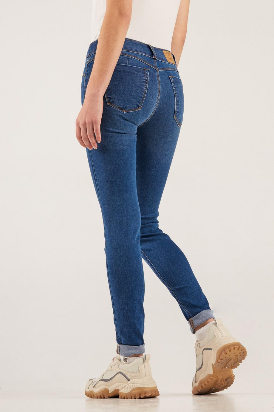 Jean para mujer, 5 bolsillos, tiro medio, pretina ancha de doble botón, efecto push up con lavado medio.