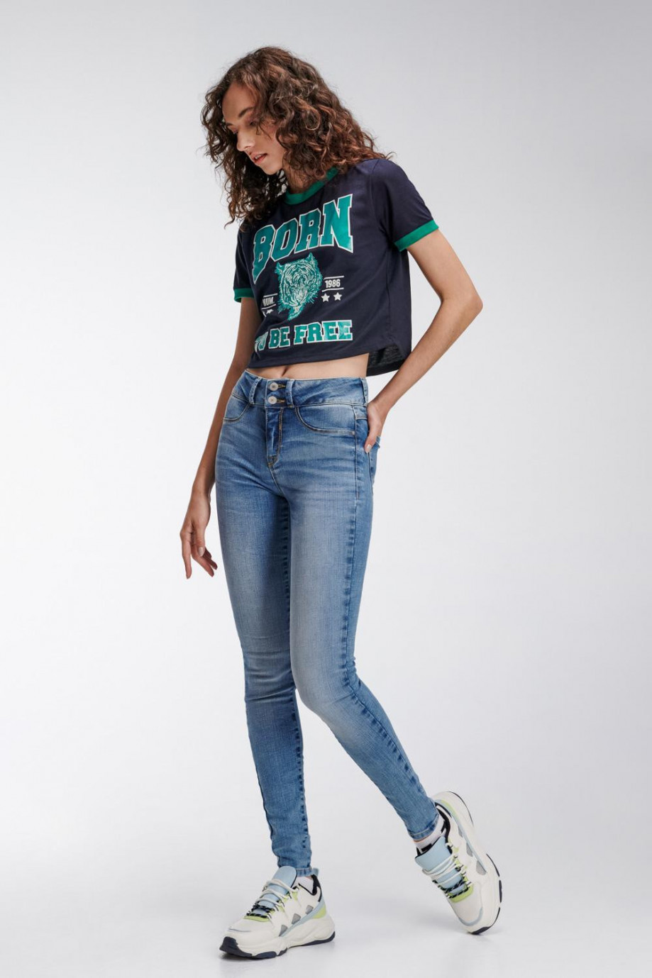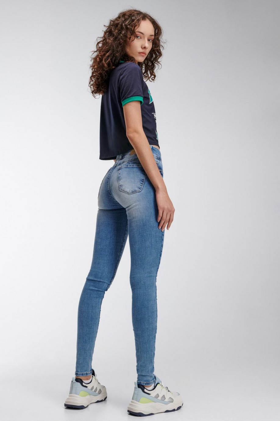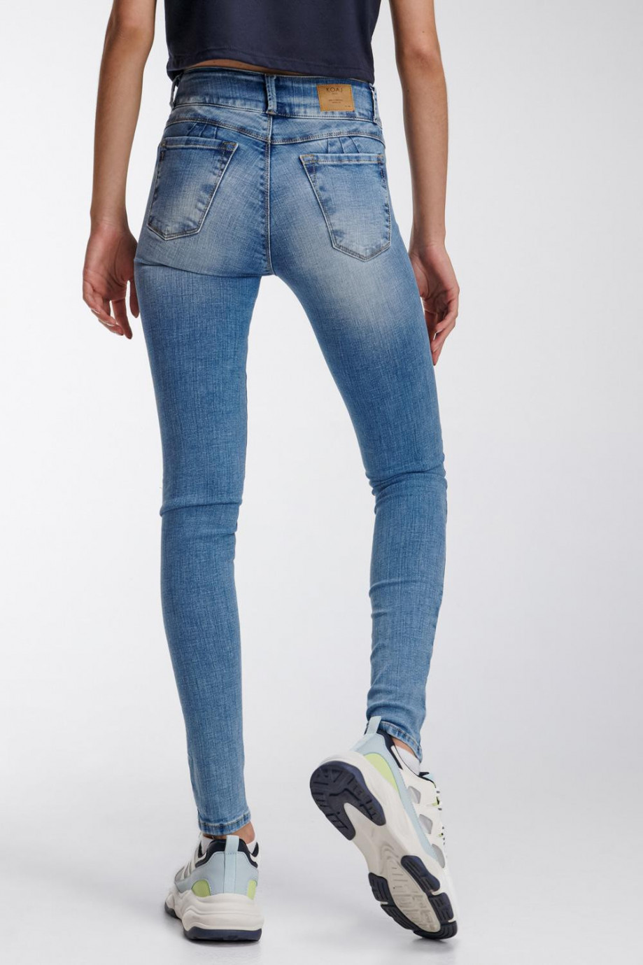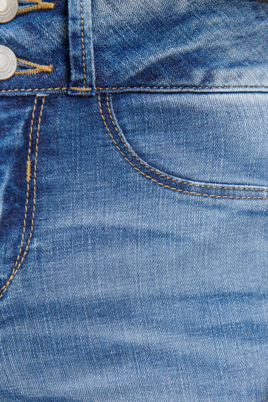 Jean para mujer, 5 bolsillos, tiro alto, pretina ancha de doble botón,  efecto push up con lavado azul muy claro.