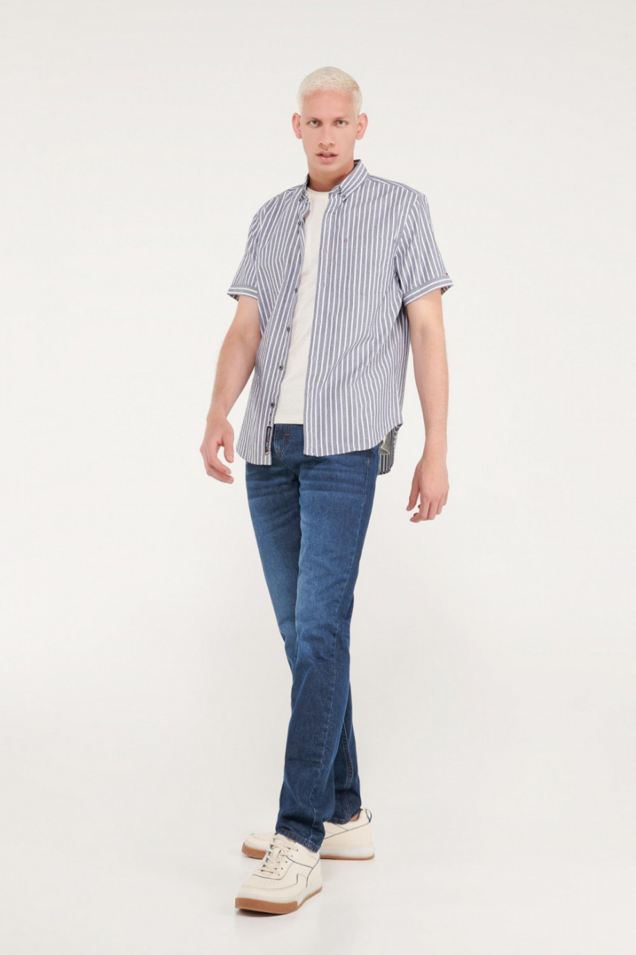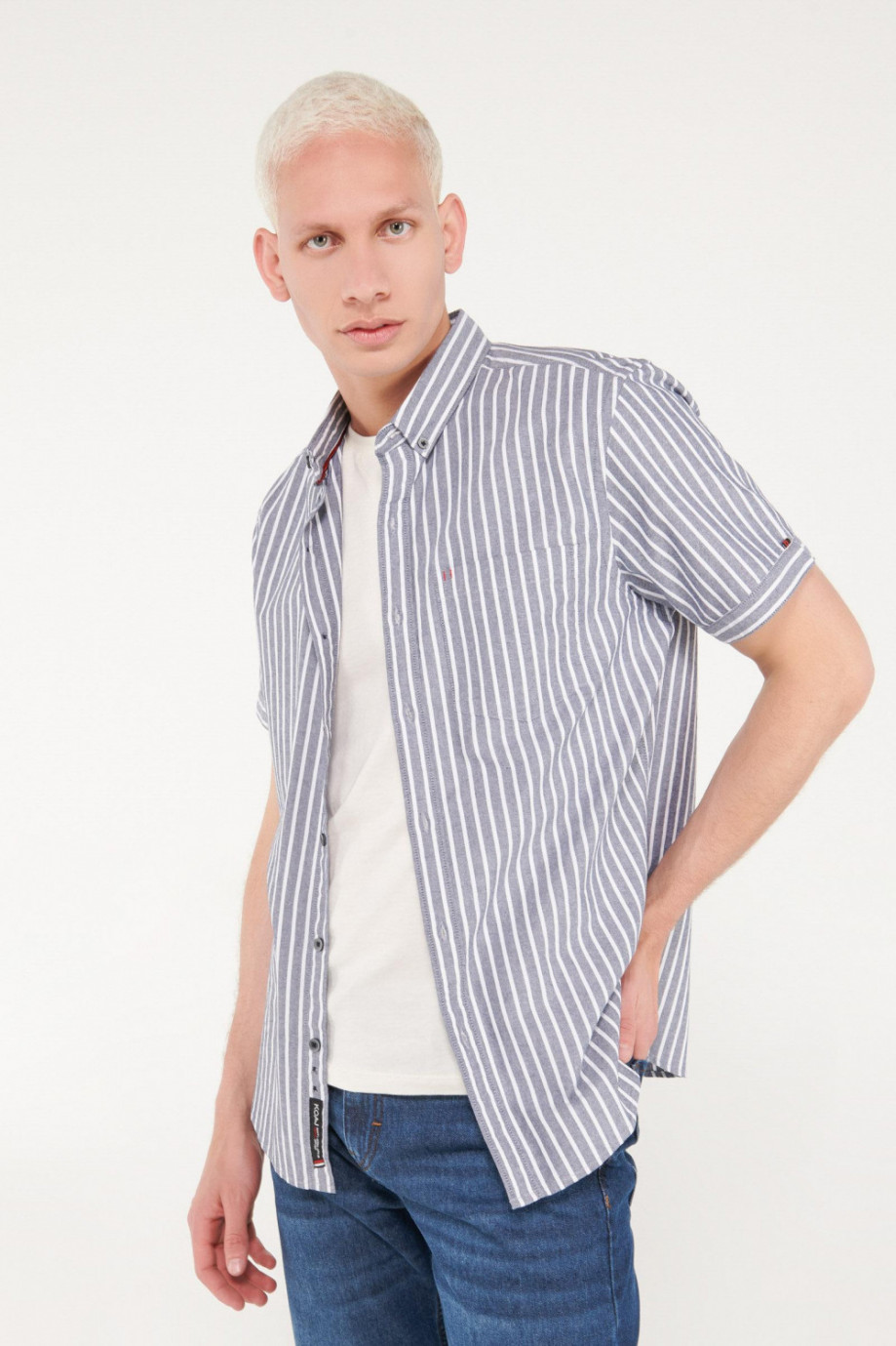 Camisa para hombre, en tela oxford a rayas con bolsillo delantero