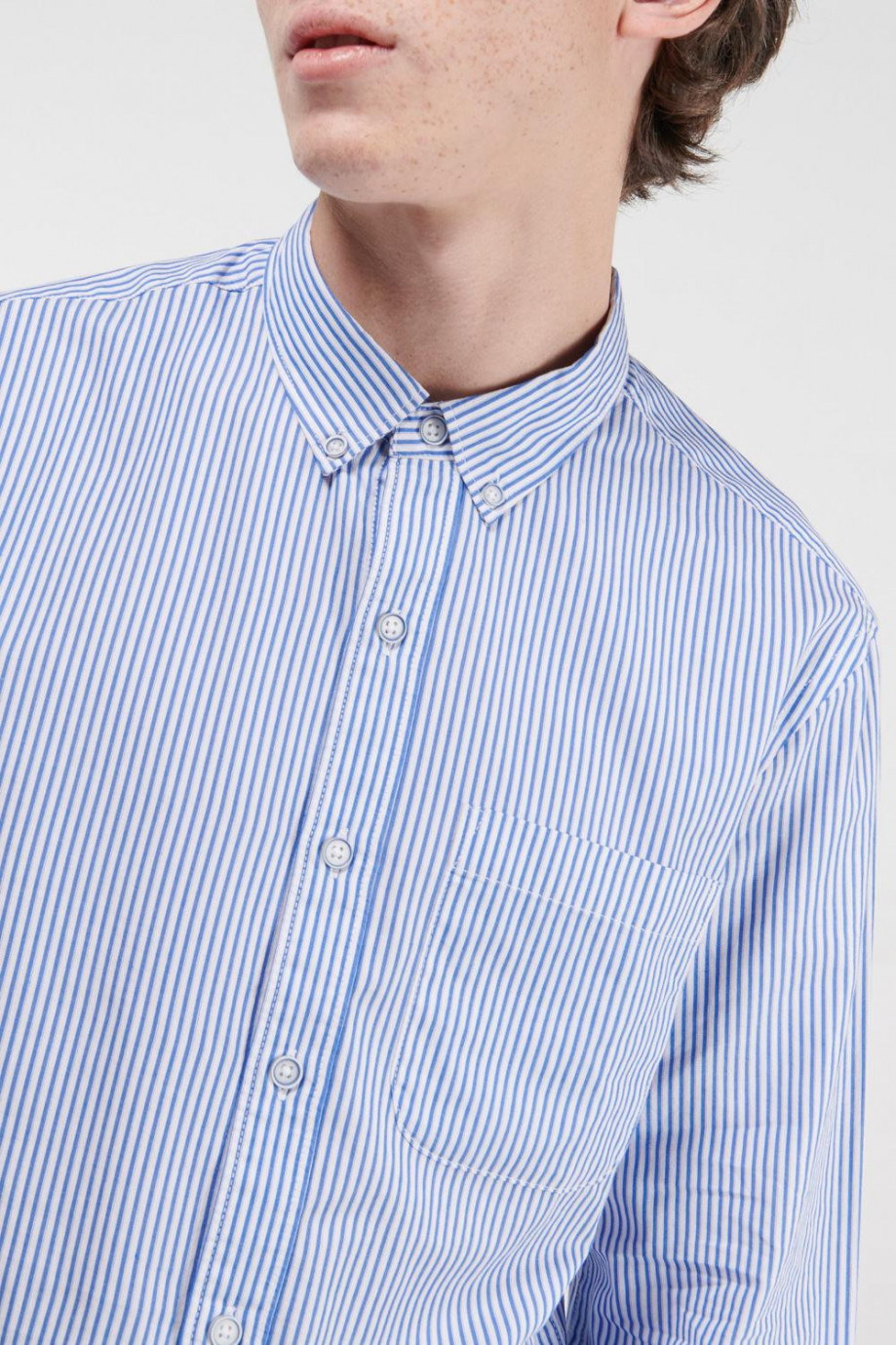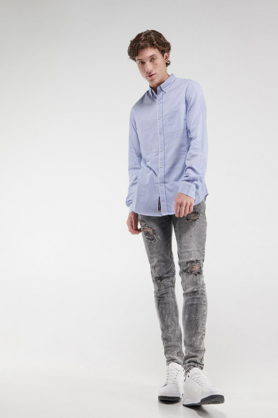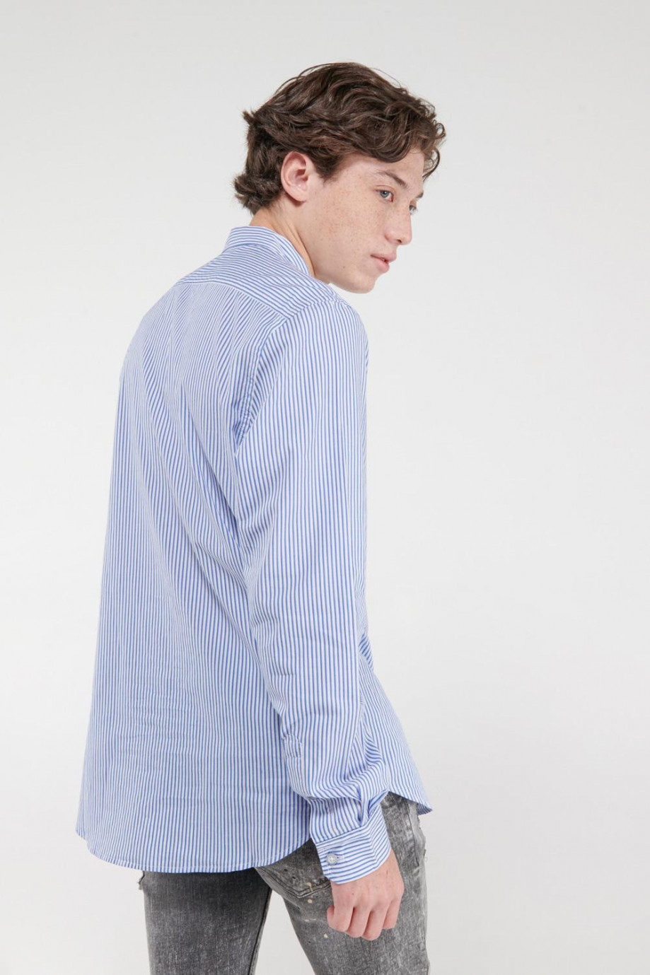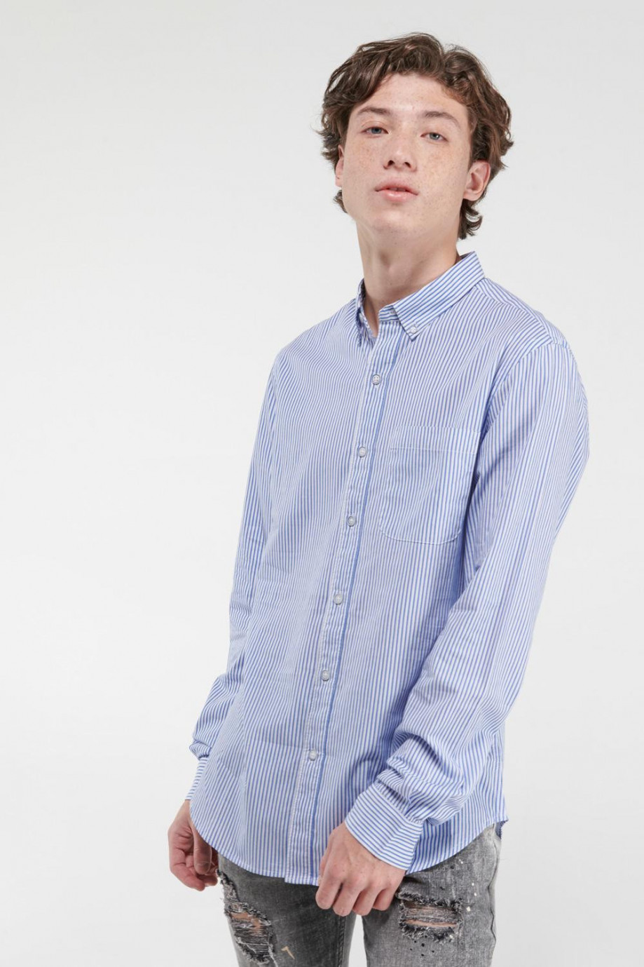Camisa cuello button down en tela a rayas, manga larga con un bolsillo y botonadura en el frente.