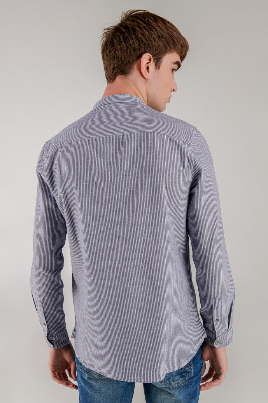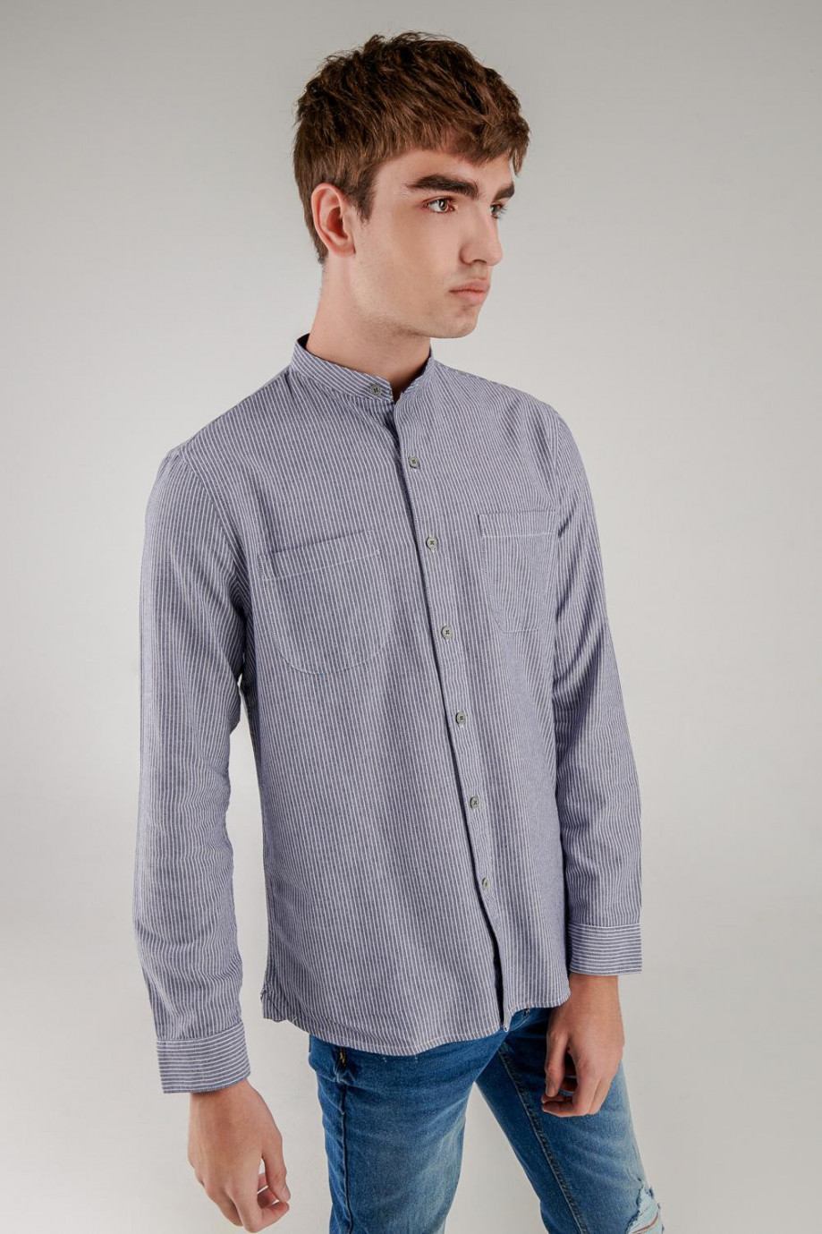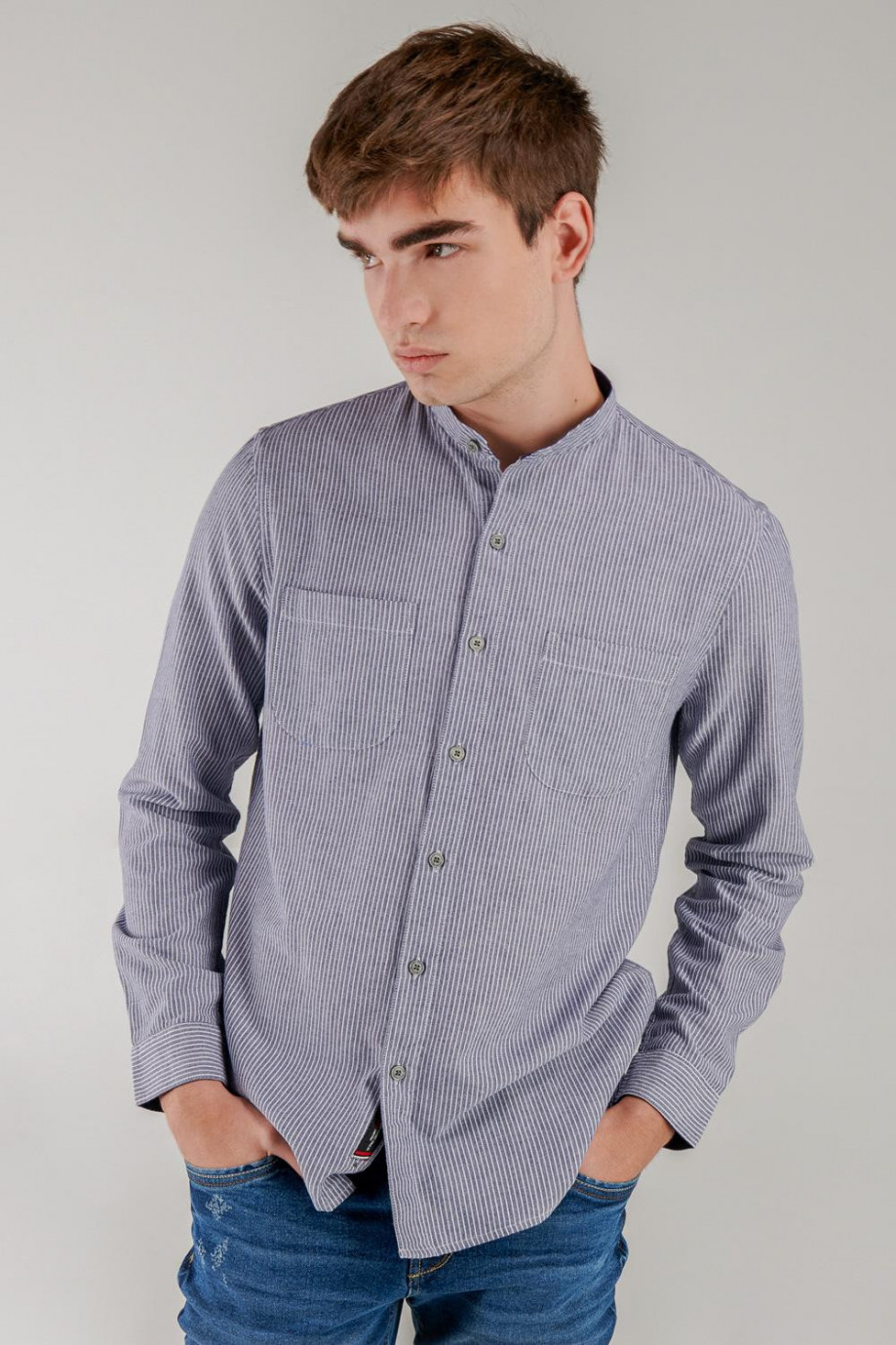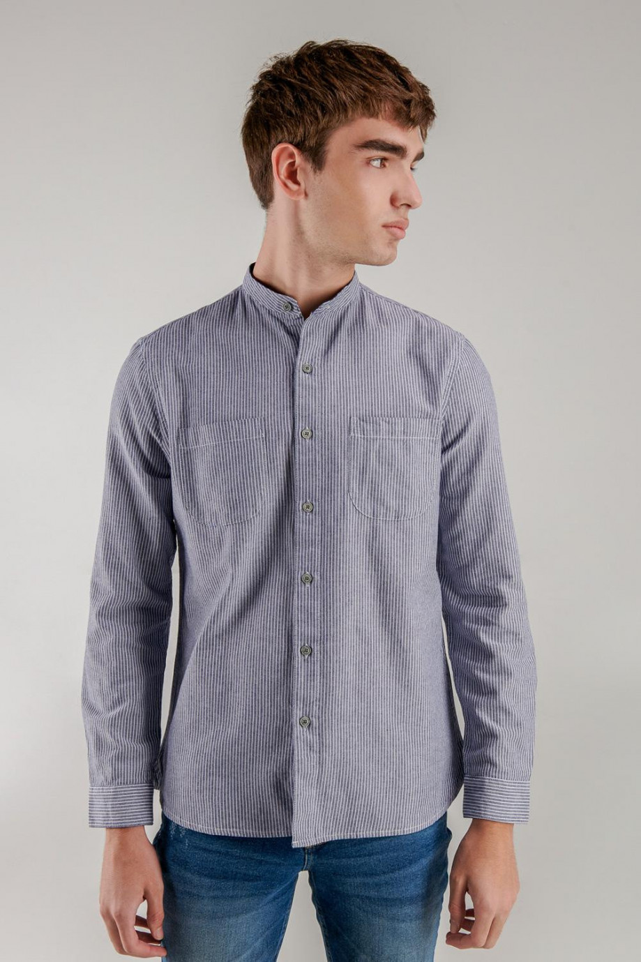 Camisa cuello mao, manga larga con tela a rayas, con doble bolsillo en el frente.