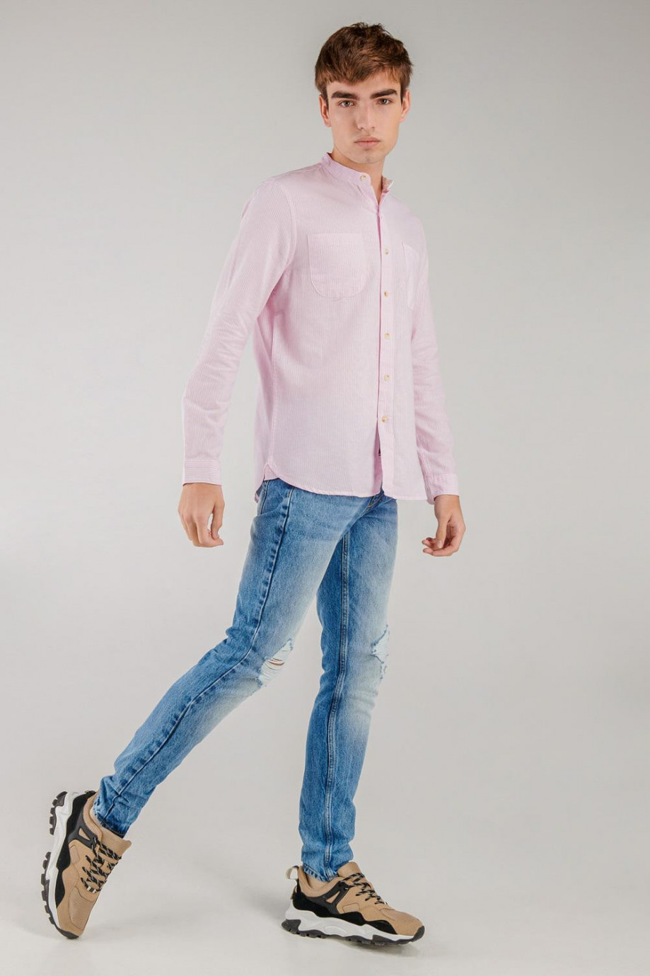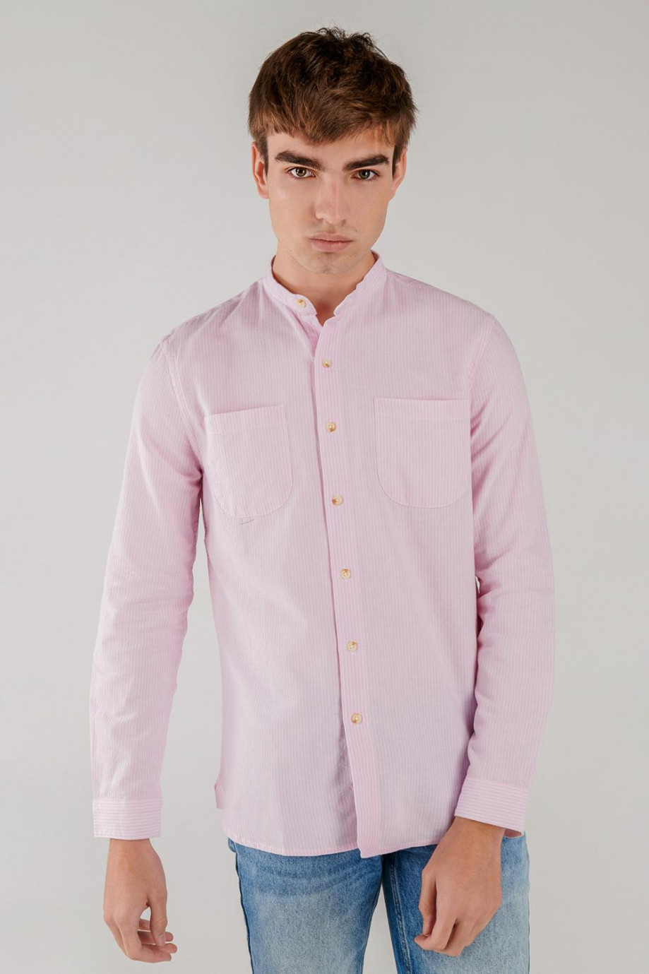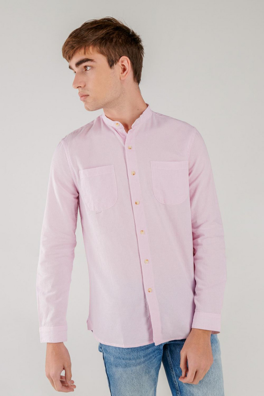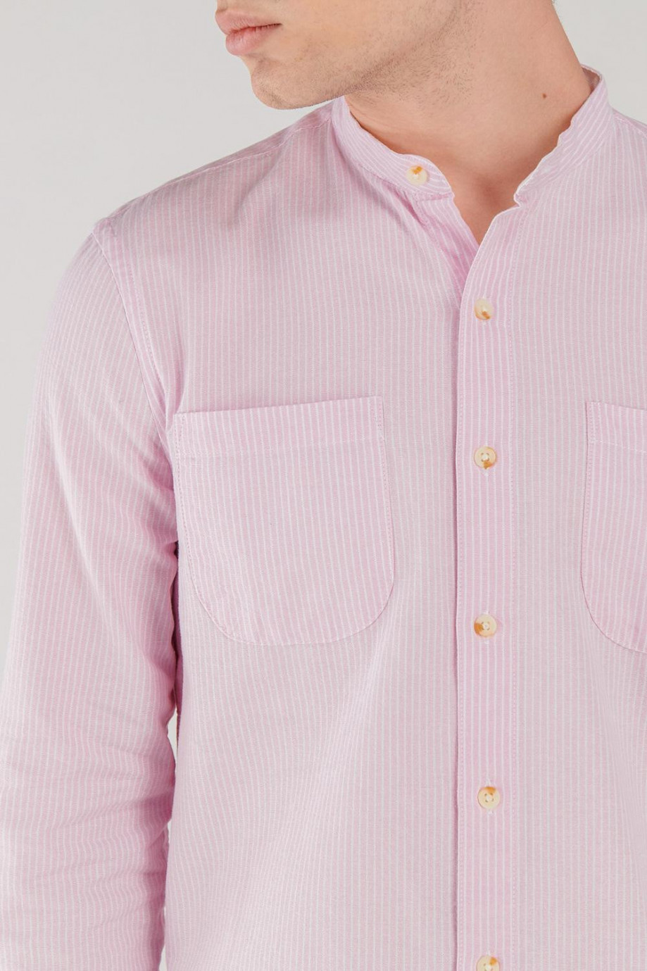 Camisa cuello mao, manga larga con tela a rayas, con doble bolsillo en el frente.