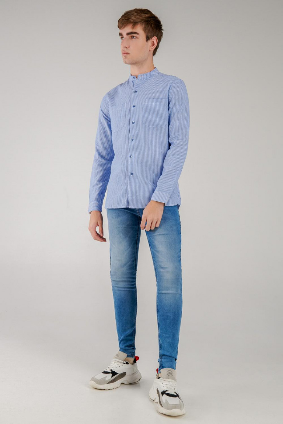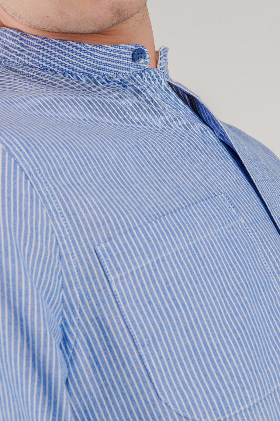 Camisa cuello mao, manga larga con tela a rayas, con doble bolsillo en el frente.