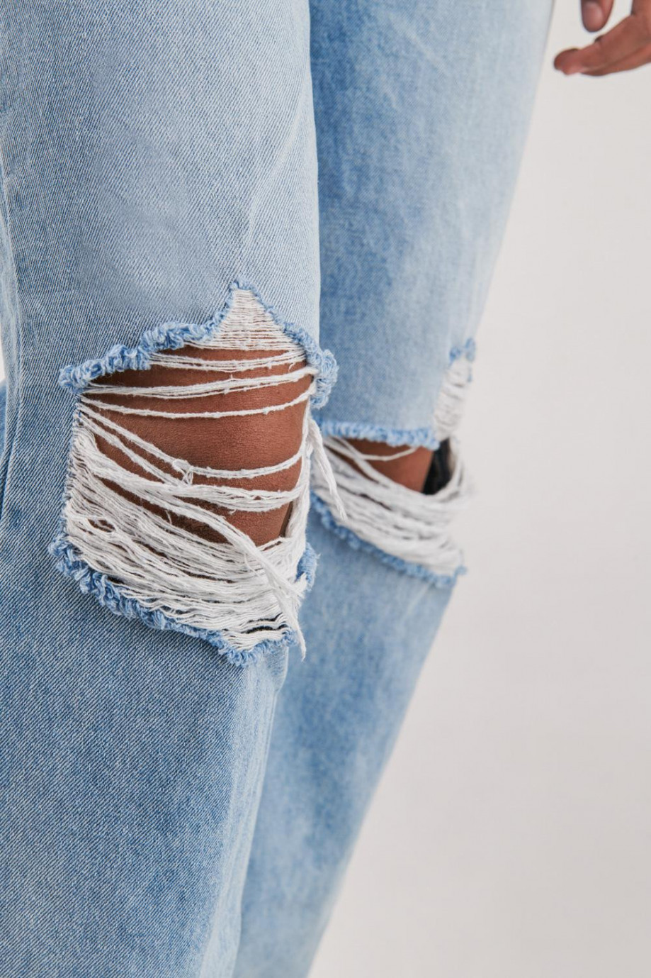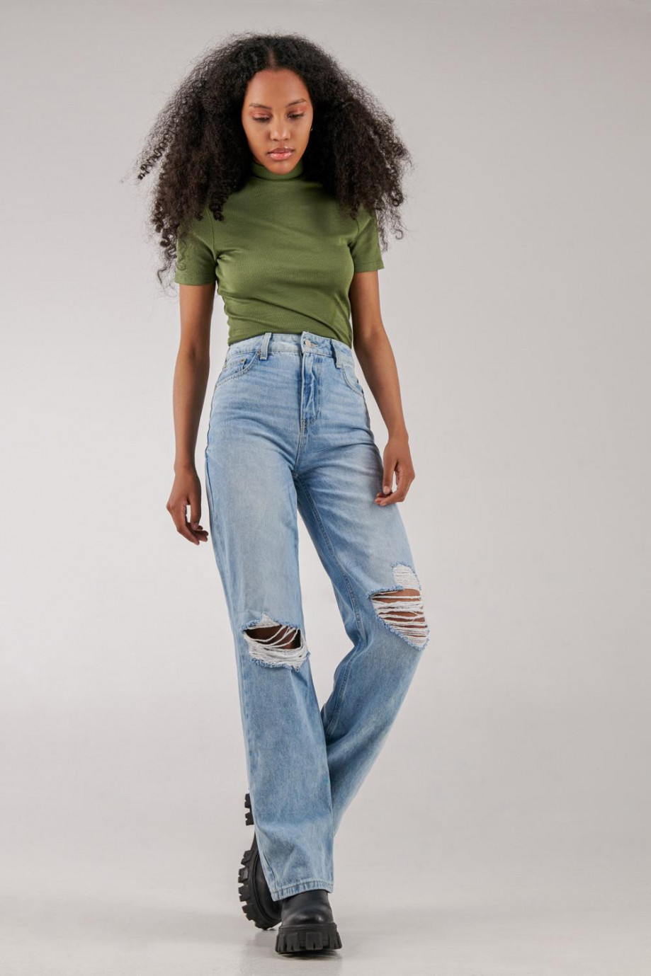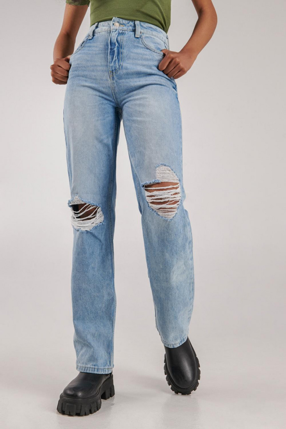 Jean para mujer, 5 bolsillos, super tiro alto, lavado con rotos color azul muy claro